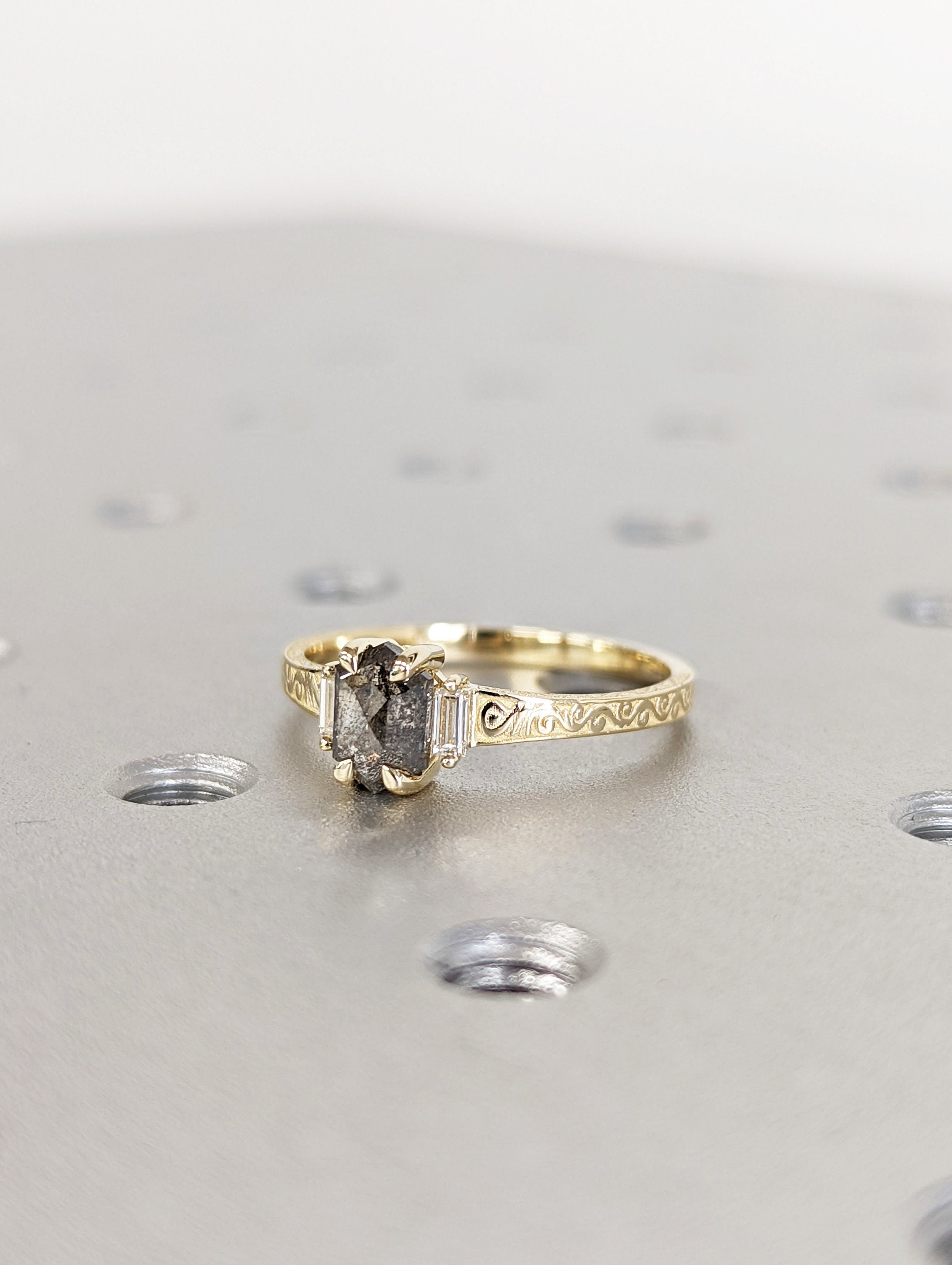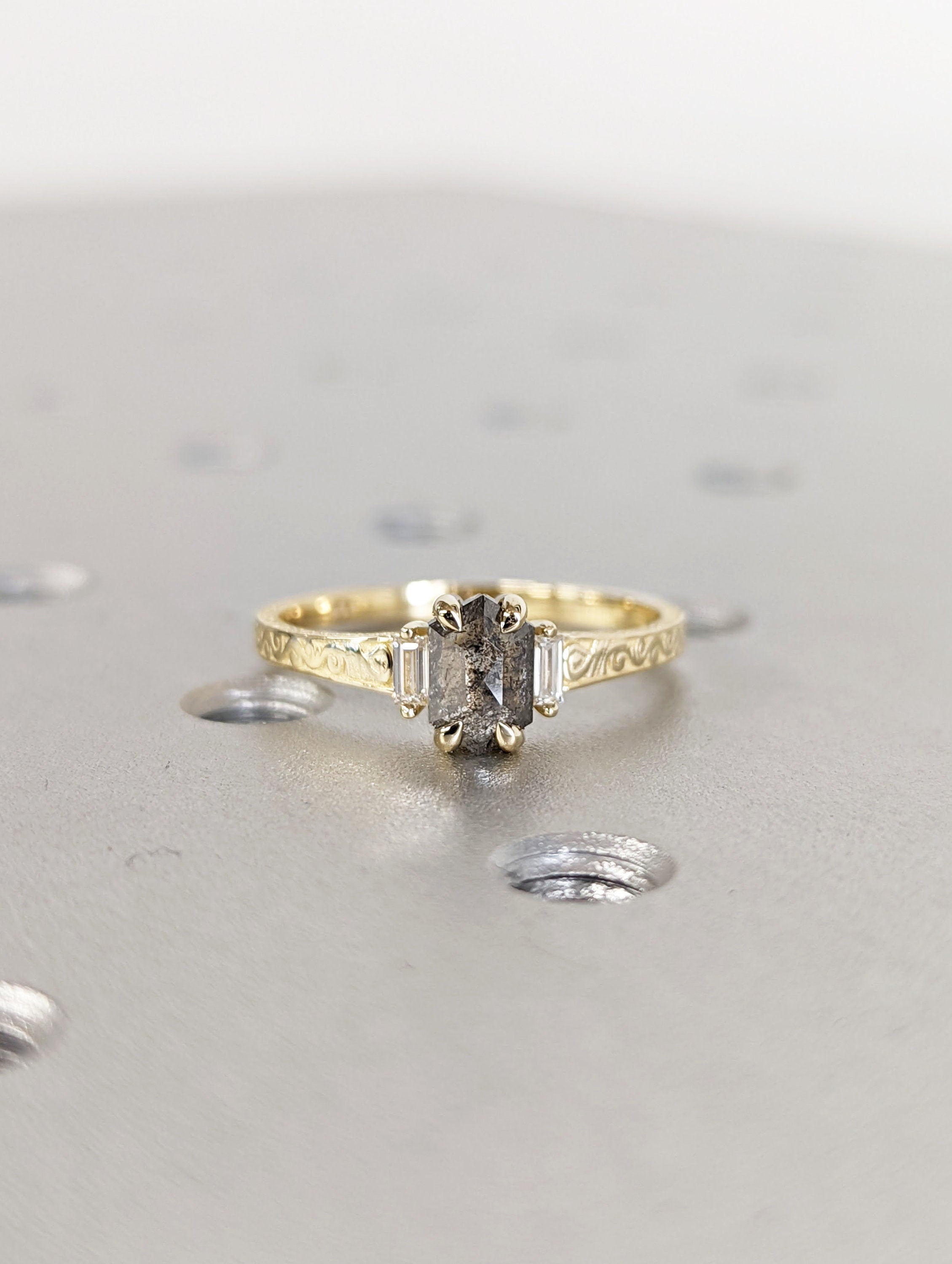 Raw Salt and Pepper Hexagon Baguette Diamond Rose /White /Yellow Gold Engagement Ring Art Deco 1920's Inspired 14k Unique Ring for Her