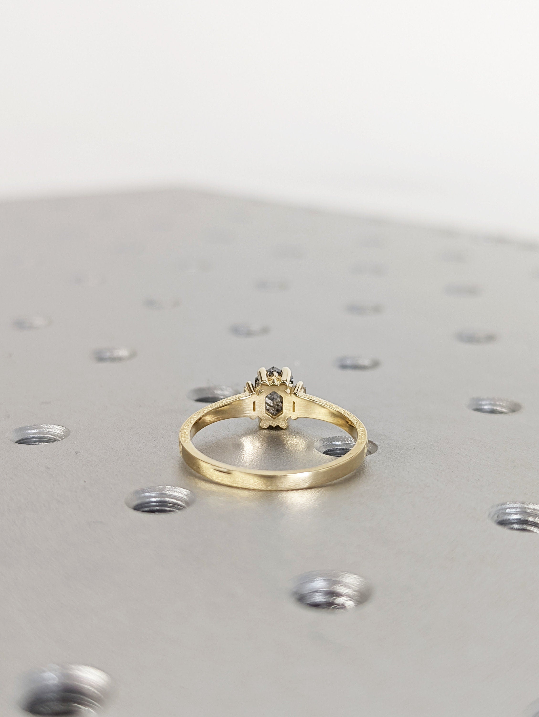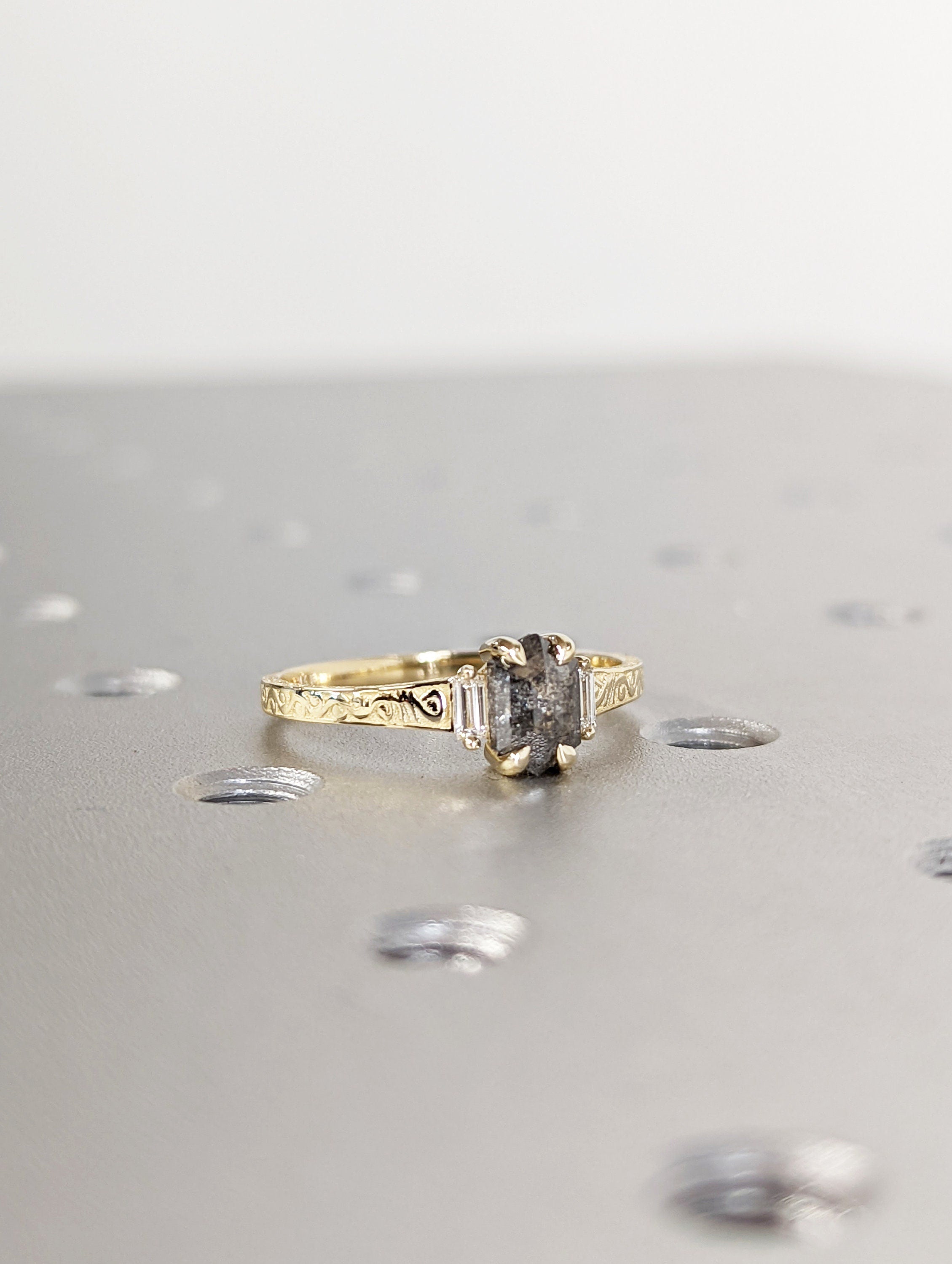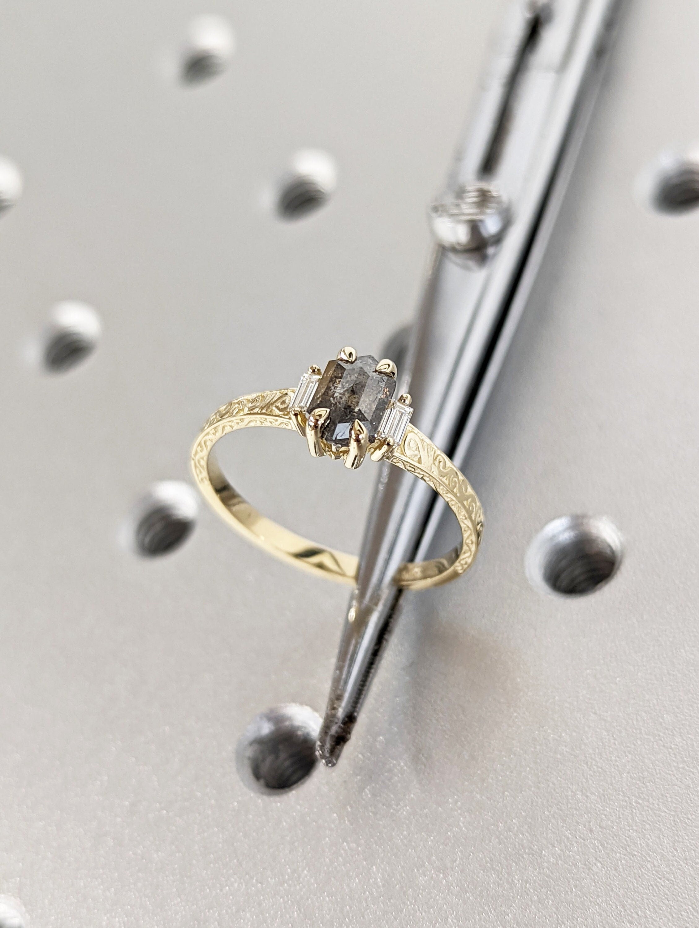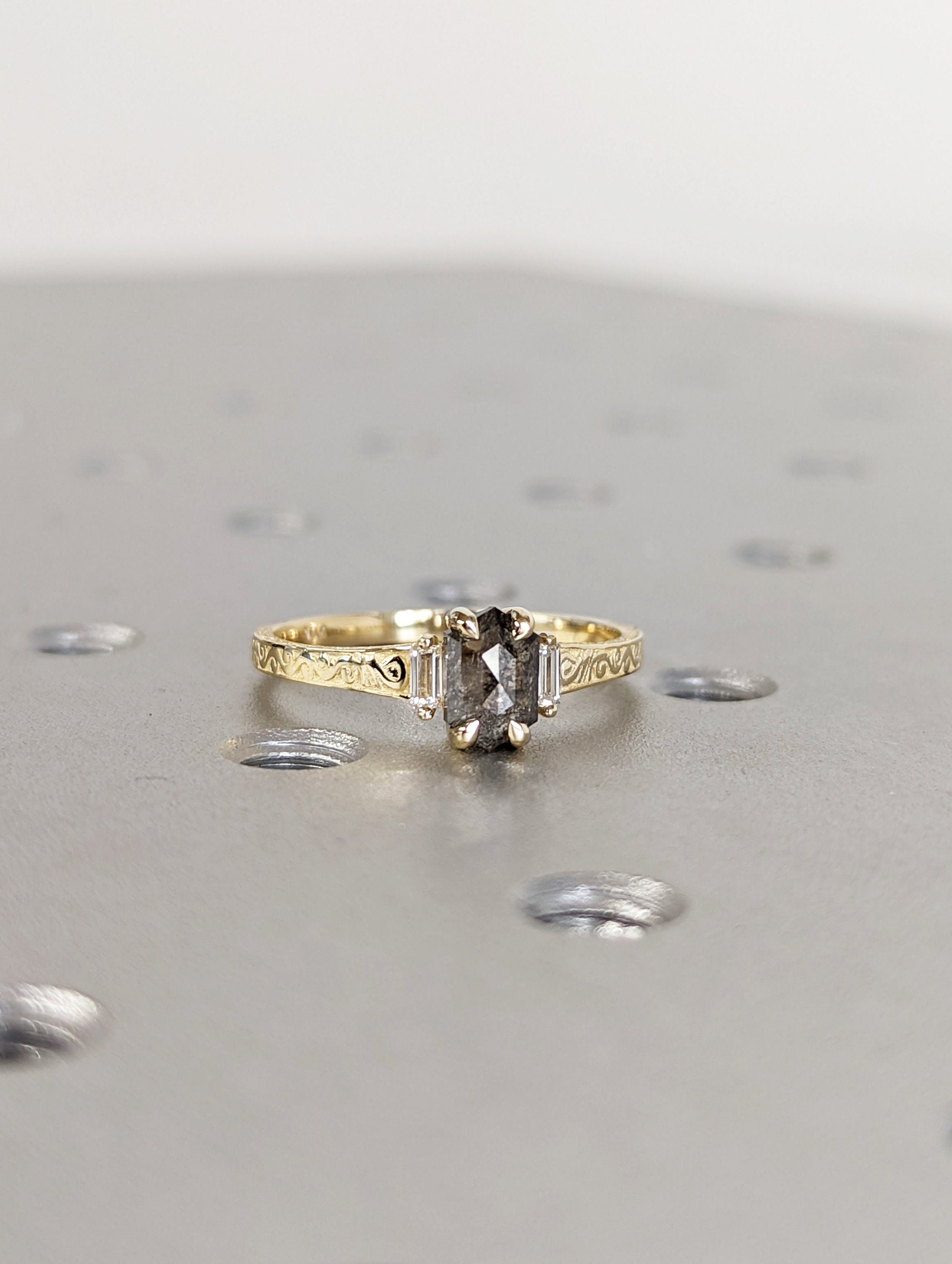 ONE-OF-A-KIND Hexagon salt and pepper diamond, a baguette enhanced diamond ring that is just pure uniqueness. This hand made ring is crafted of the finest quality 14k gold. This antique-inspired engagement ring features a basket setting, held on a square-shaped band, adorned with undulating wave filigree and edged with milgrain.