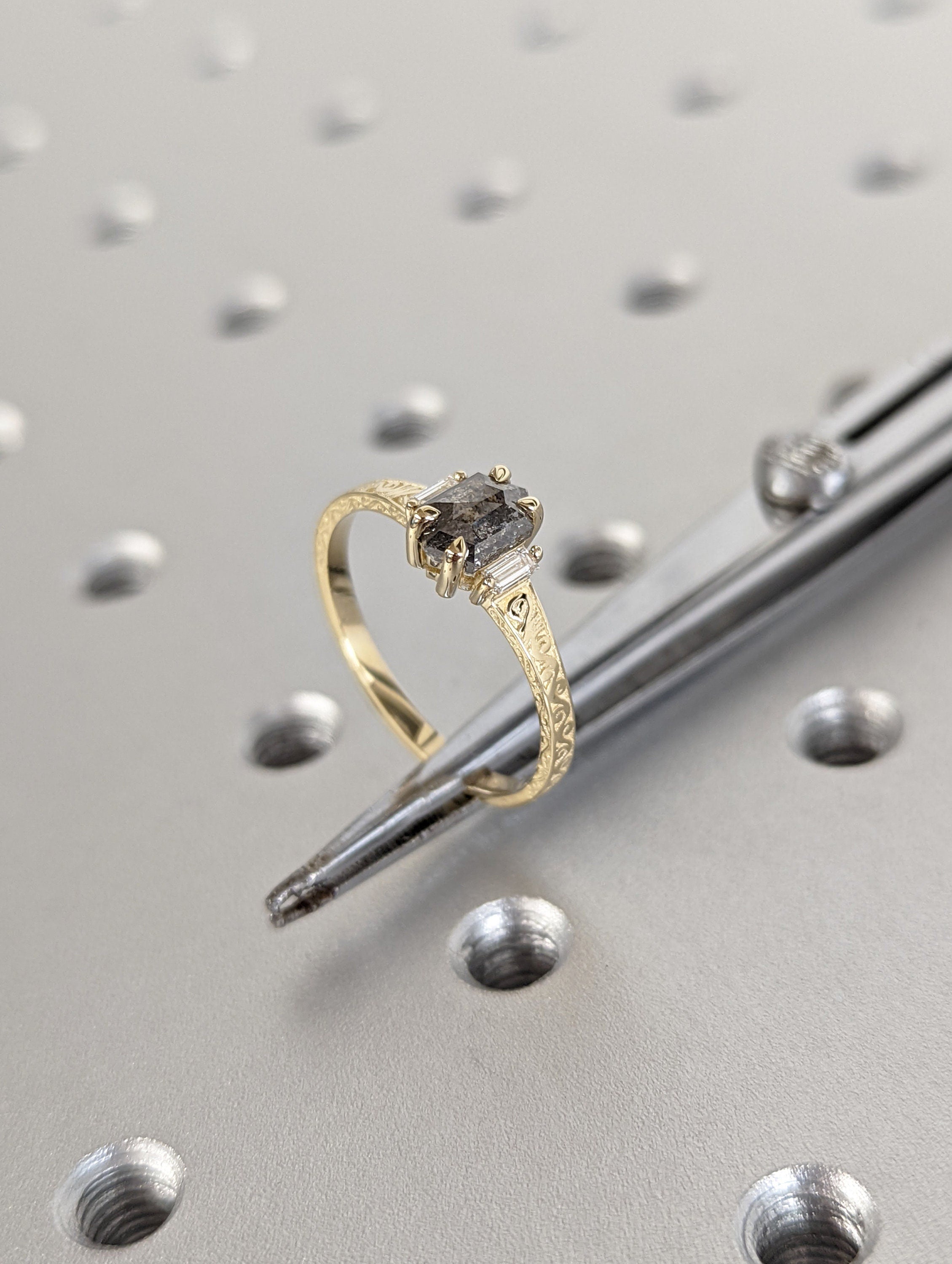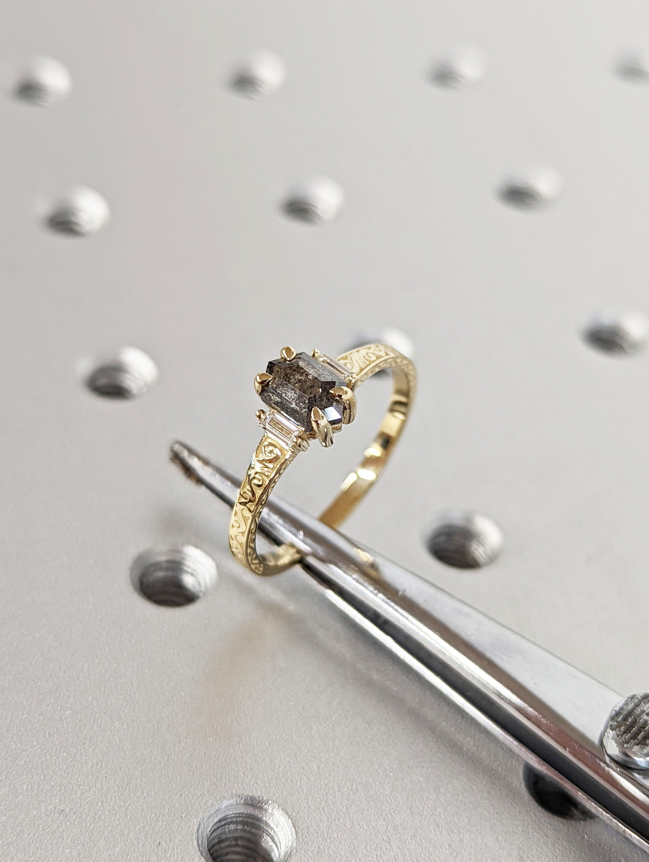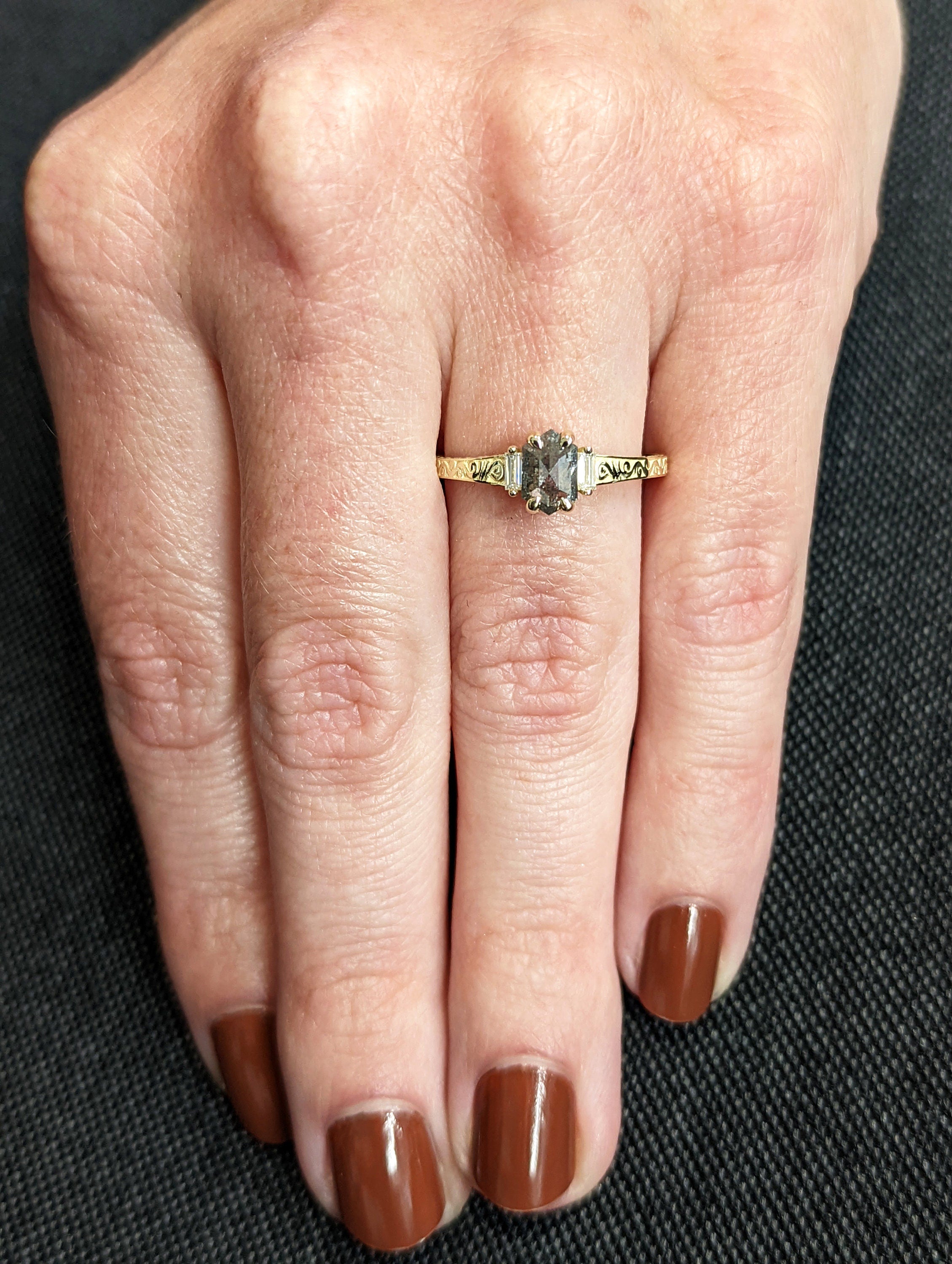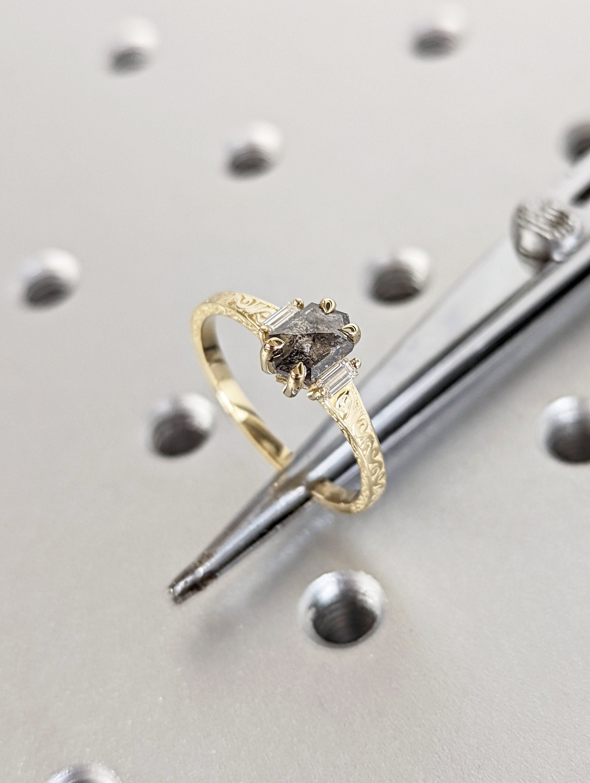ONE-OF-A-KIND Hexagon salt and pepper diamond, a baguette enhanced diamond ring that is just pure uniqueness. This hand made ring is crafted of the finest quality 14k gold. This antique-inspired engagement ring features a basket setting, held on a square-shaped band, adorned with undulating wave filigree and edged with milgrain.