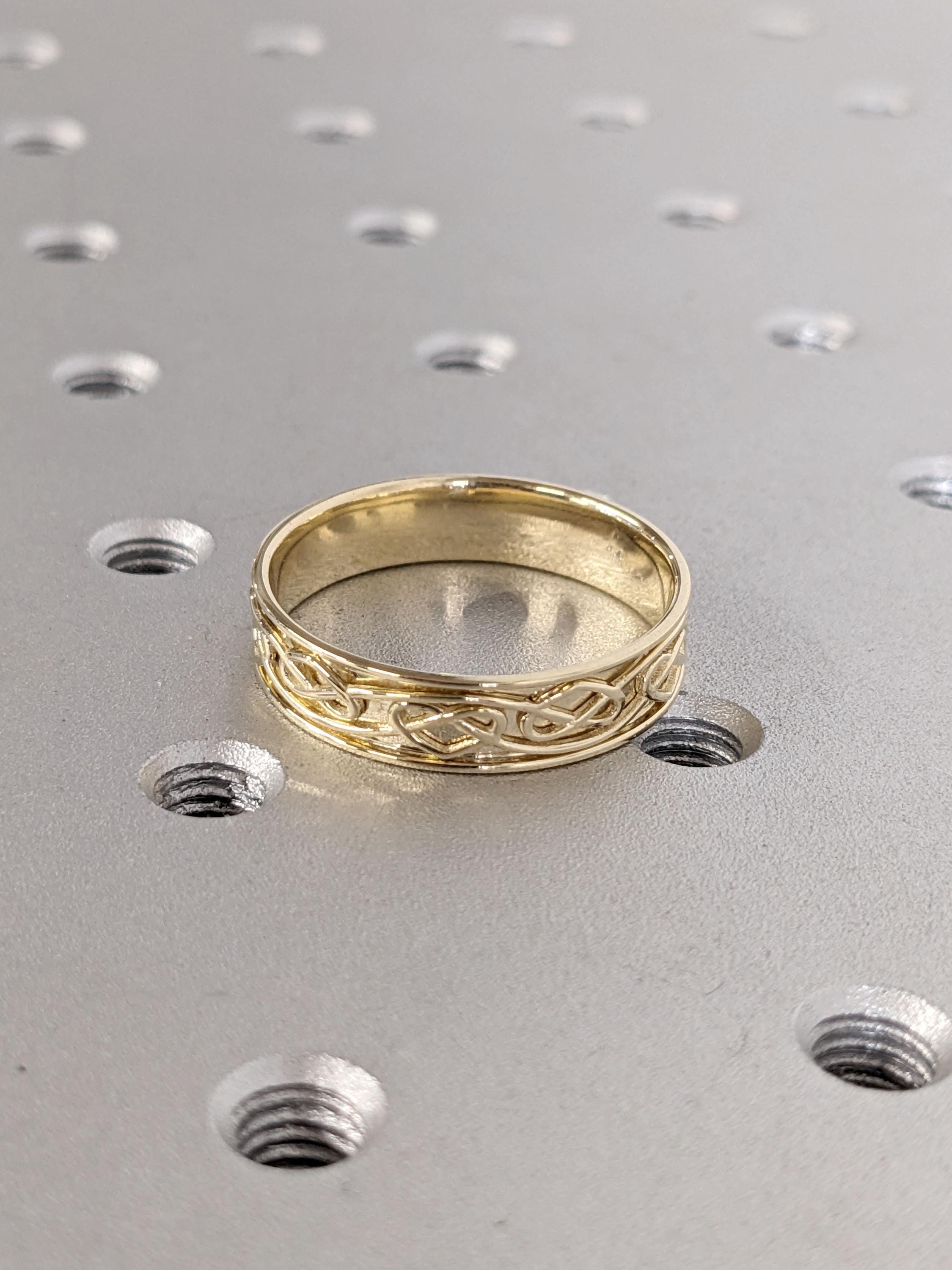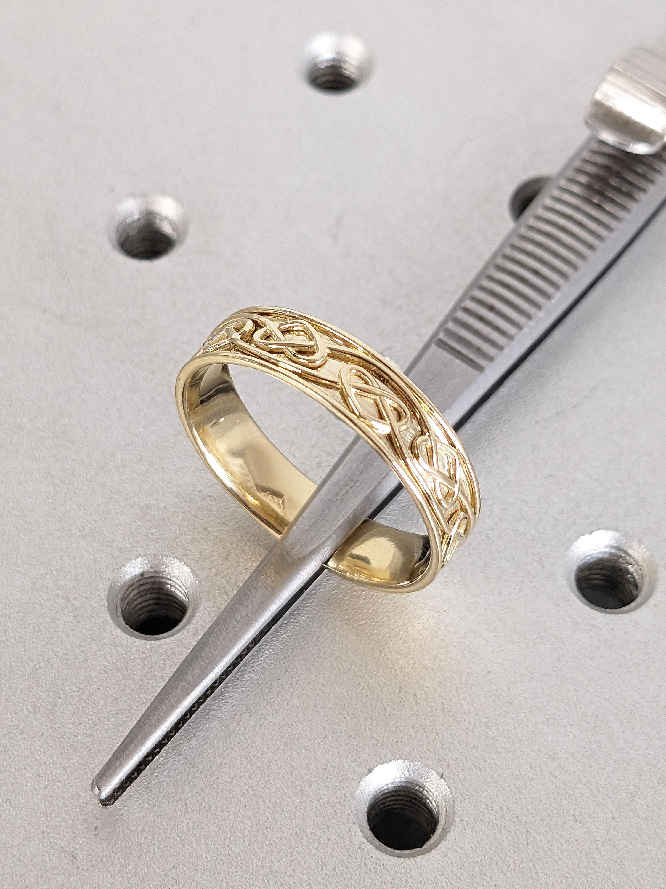 Crafted with character and heritage, this men’s band features the Celtic love knot motif, a symbol of strength, loyalty, and eternal connection. The 5mm width gives it a solid, substantial feel, while the vintage-inspired detailing adds depth and timeless appeal. A powerful design for the man who values tradition, symbolism, and enduring style.