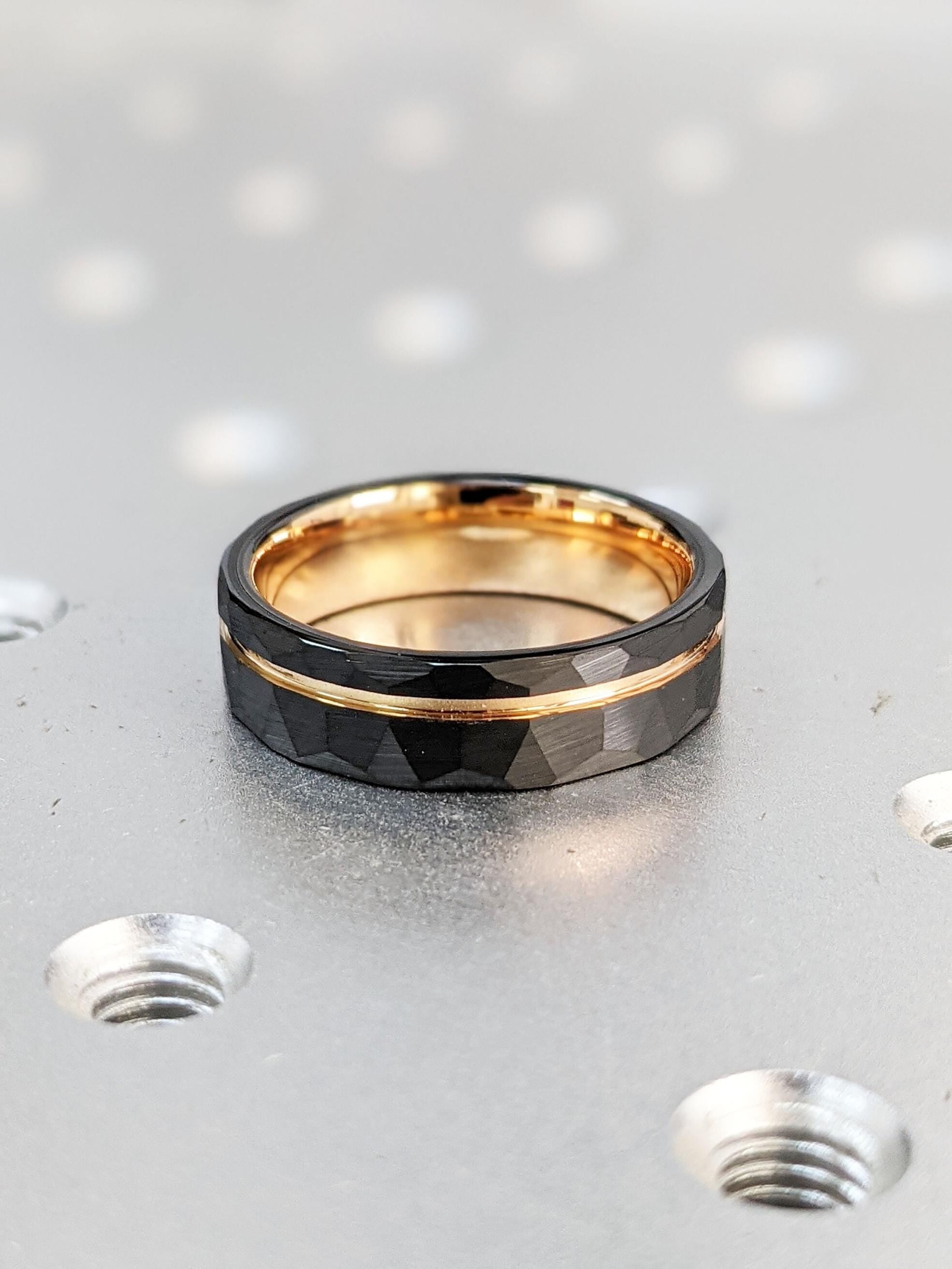 This timeless men’s band blends rugged texture with modern sophistication. The organic hammered black top and sides create a bold contrast against the rose gold stripe and inner band, giving it a sleek yet masculine appeal. Crafted from durable tungsten carbide, this ring is designed to stand the test of time — strong, scratch-resistant, and built for everyday wear.