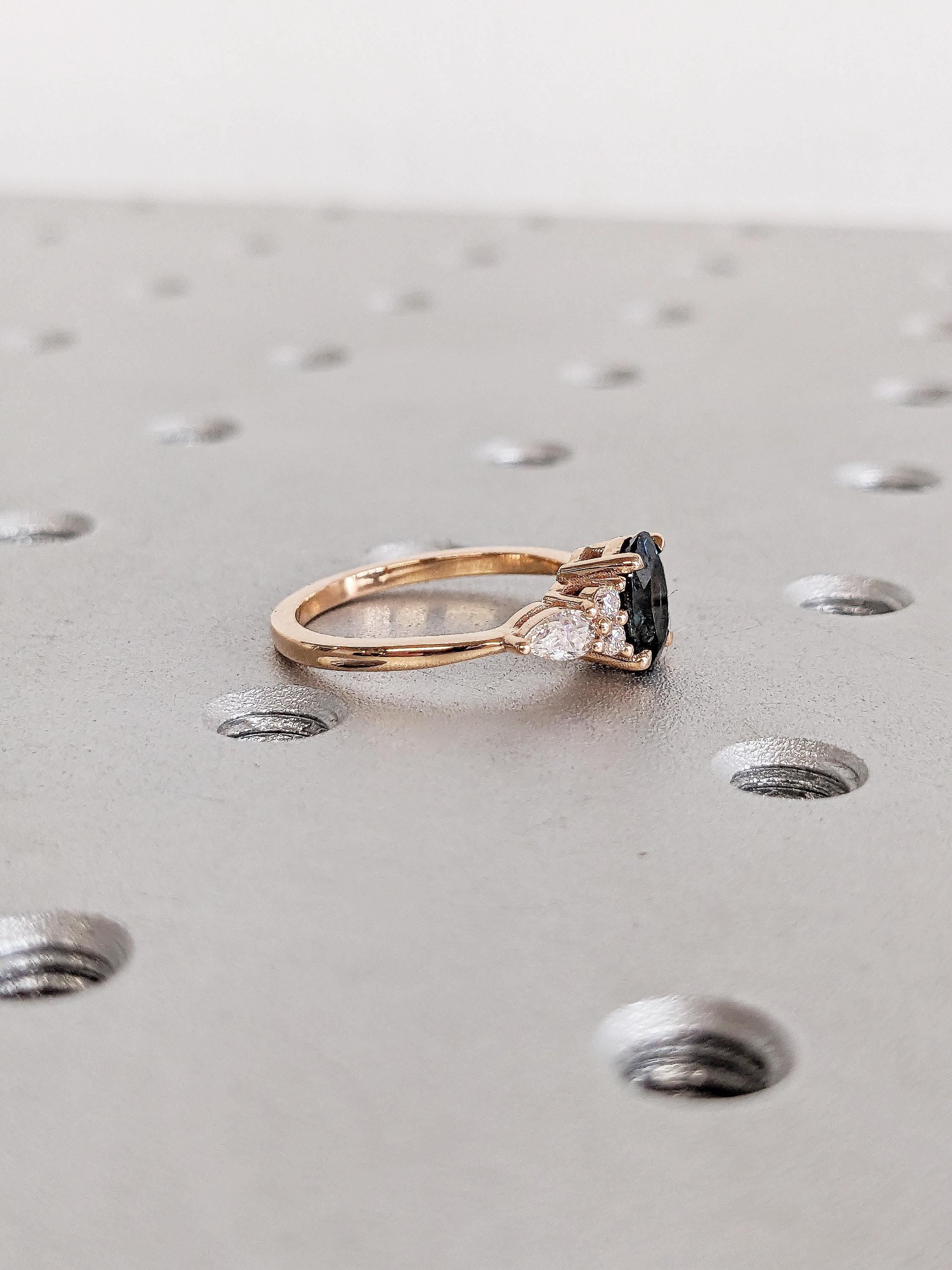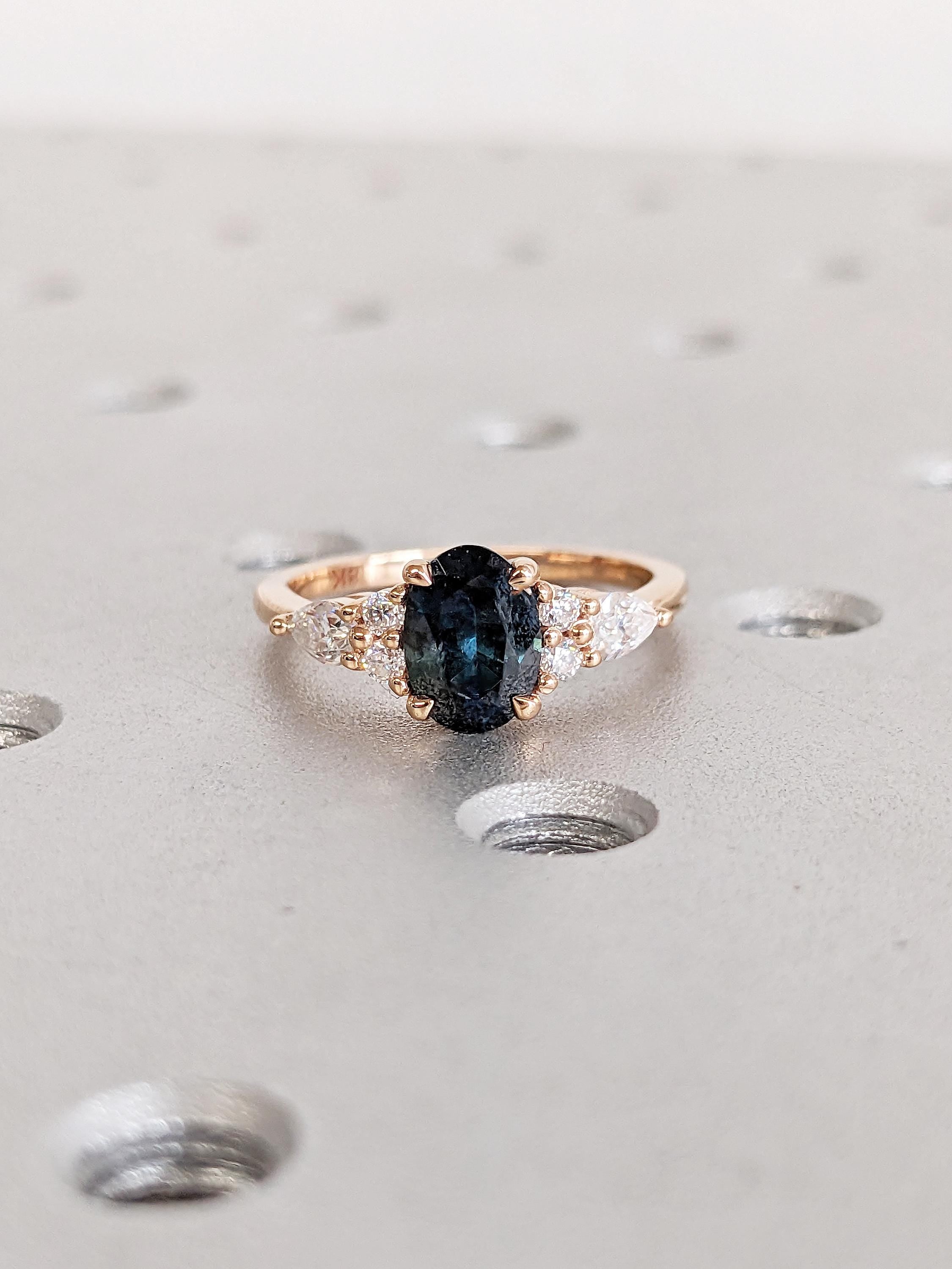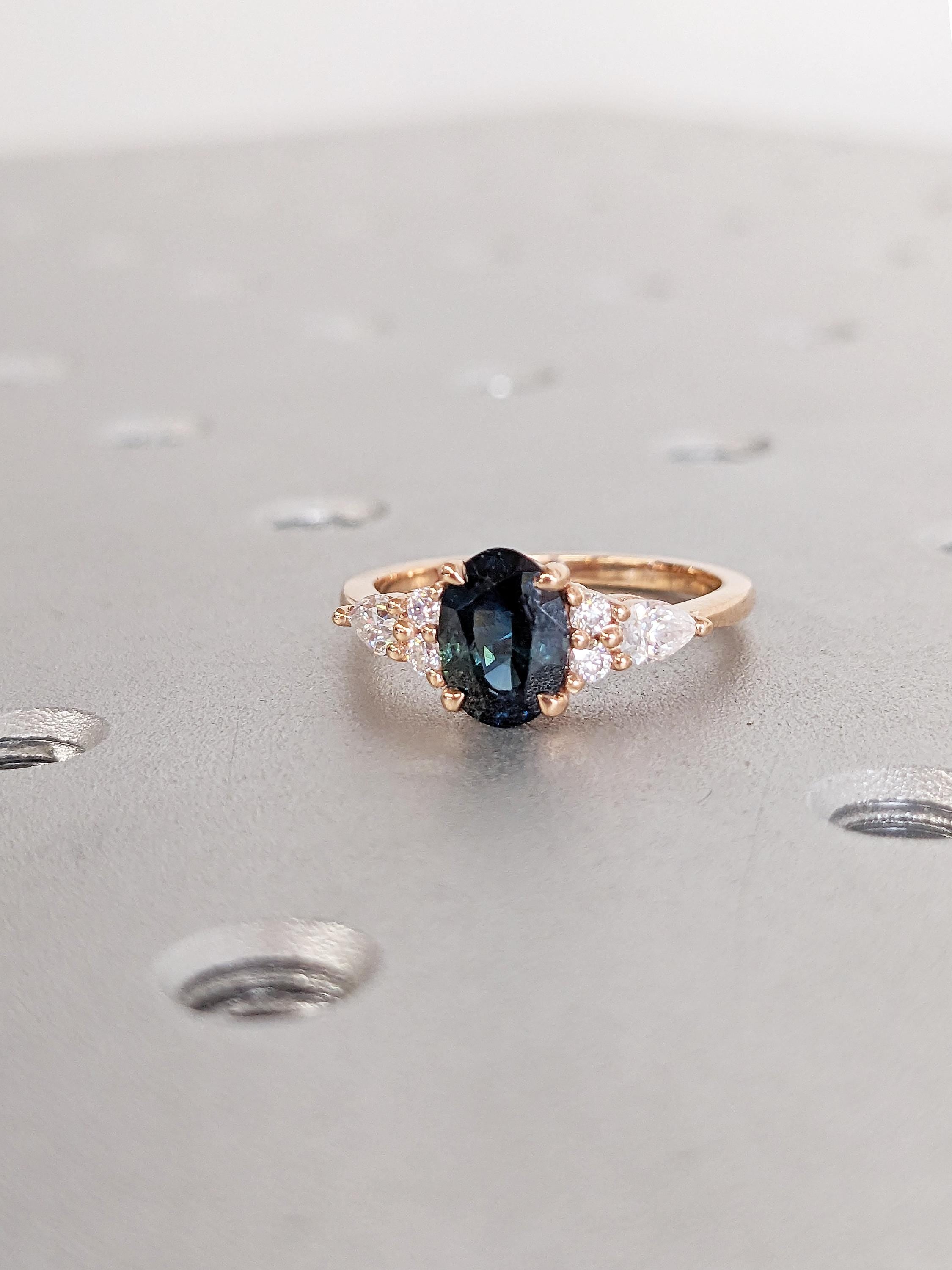 Rose Gold Women Wedding Ring, Blue Green Sapphire Ring, Oval Engagement Ring, Birthstone Ring, Diamond Cluster Ring, Unique Anniversary Ring