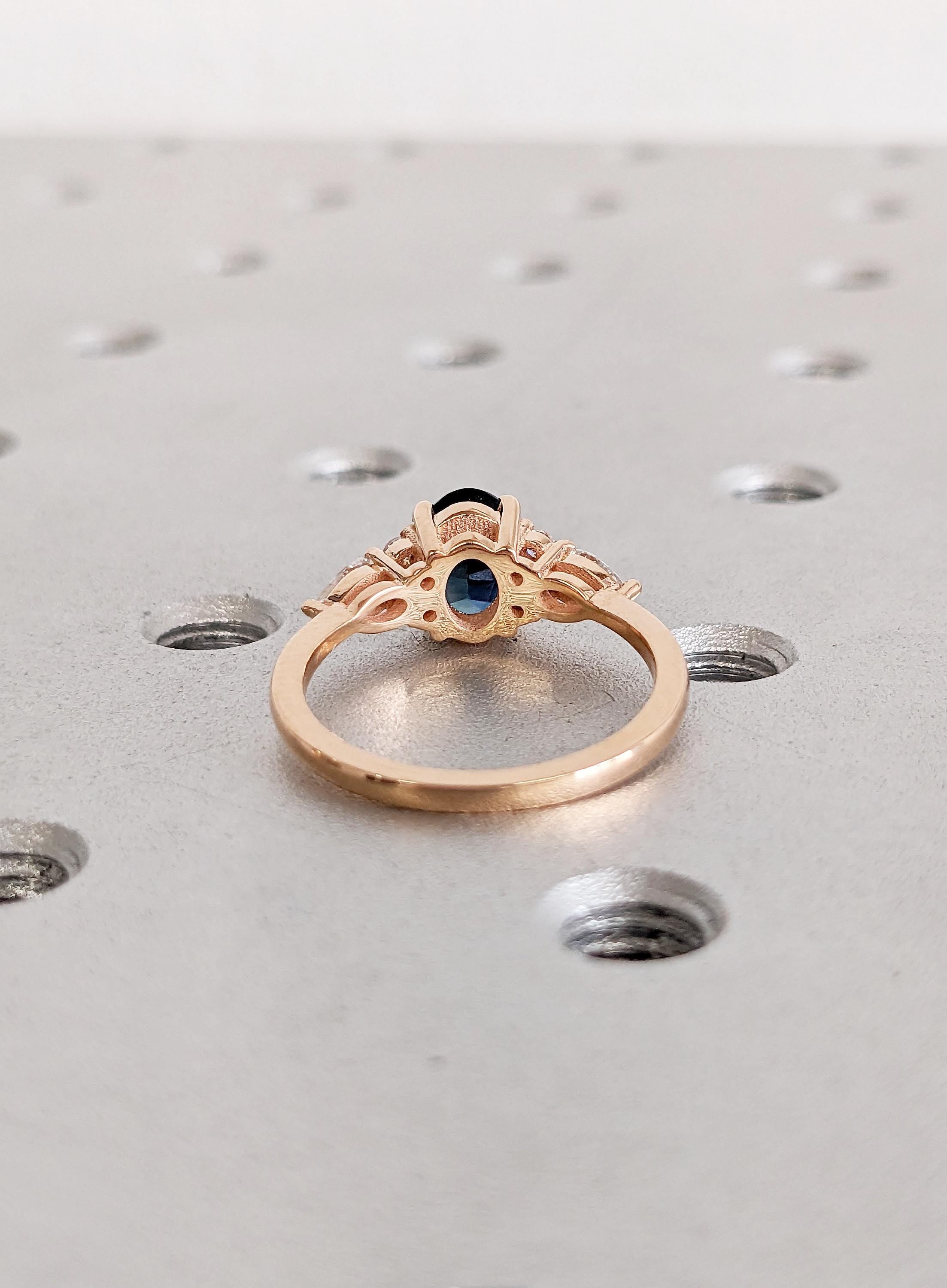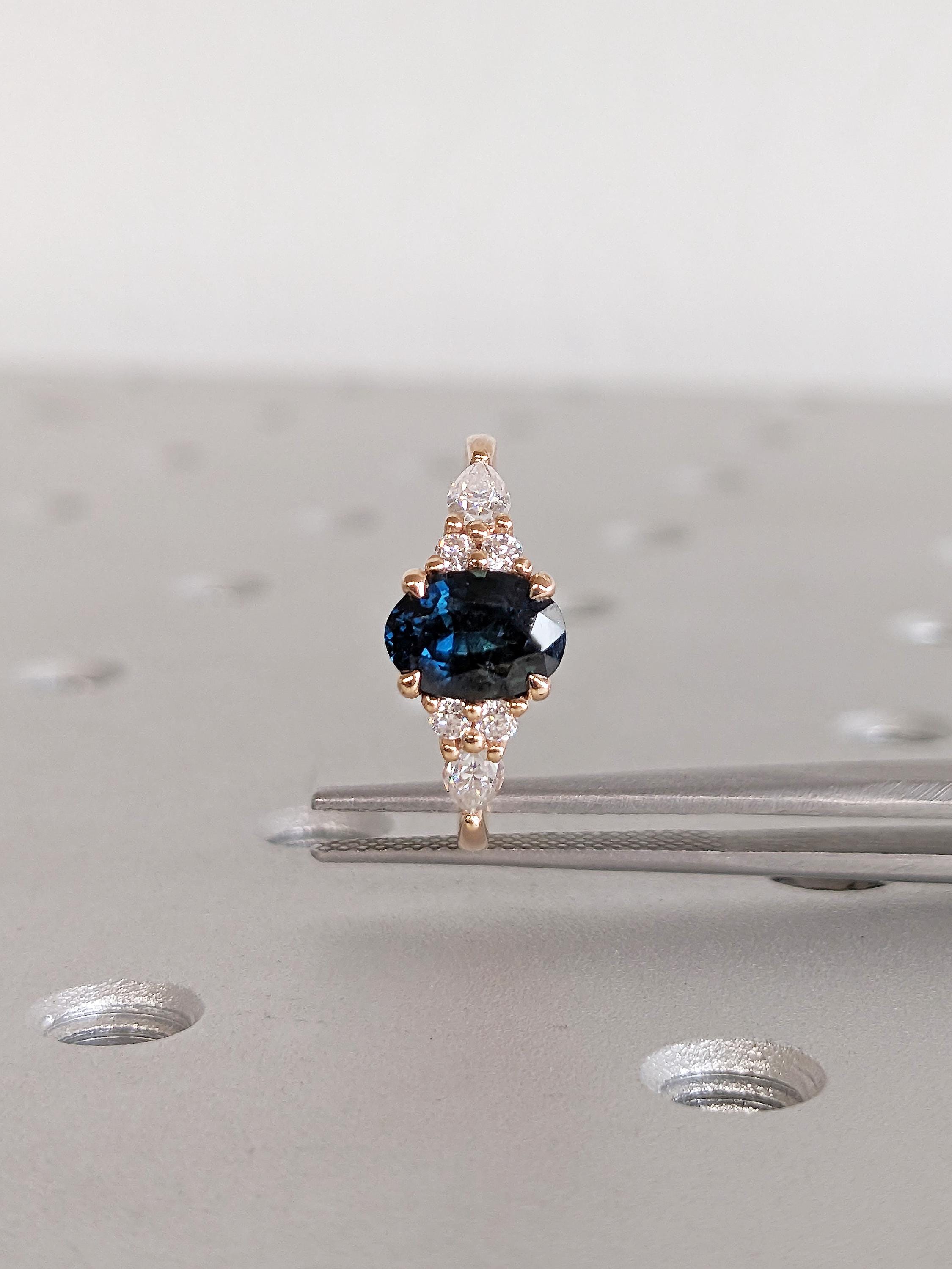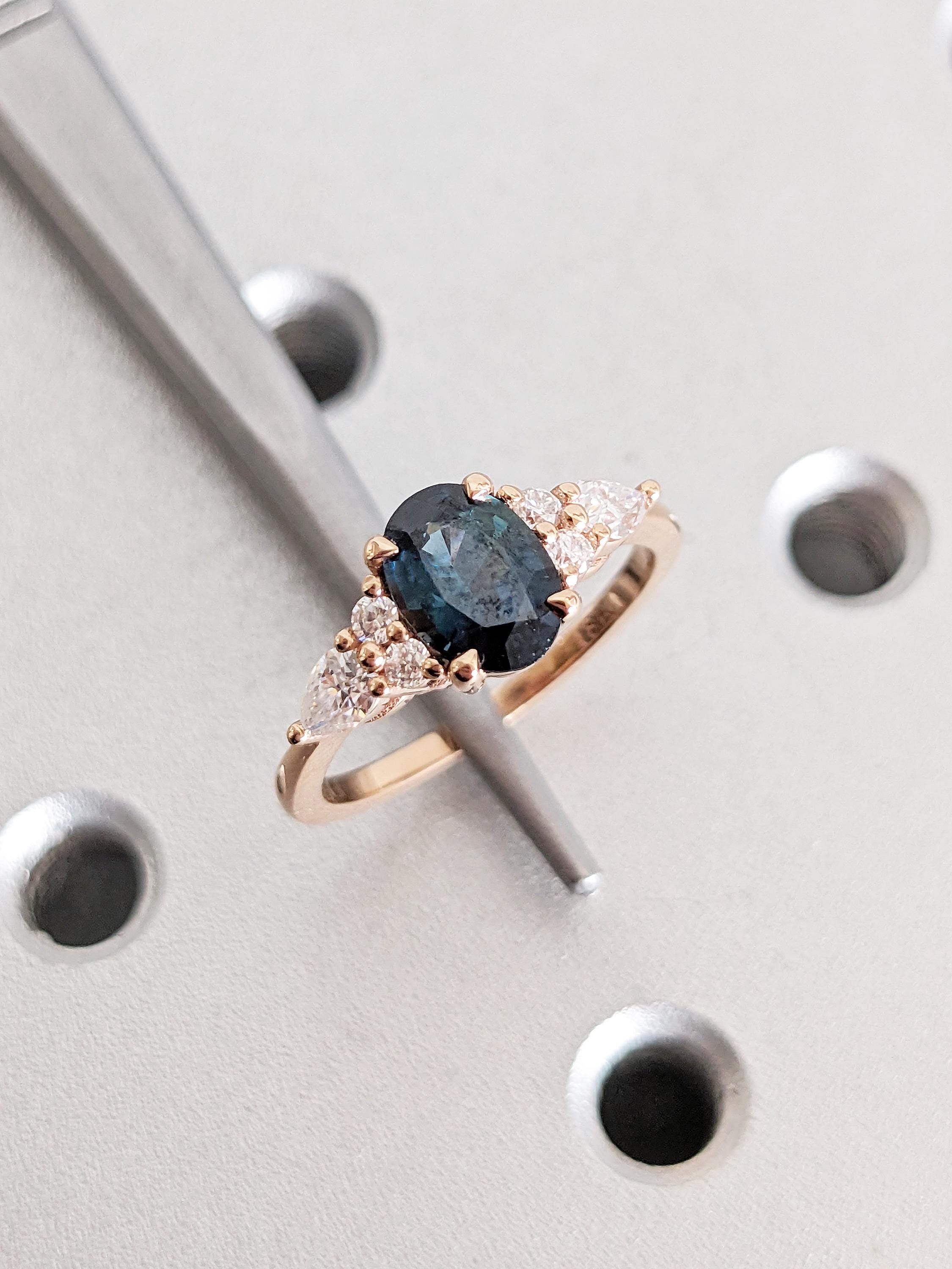 Rose Gold Women Wedding Ring, Blue Green Sapphire Ring, Oval Engagement Ring, Birthstone Ring, Diamond Cluster Ring, Unique Anniversary Ring