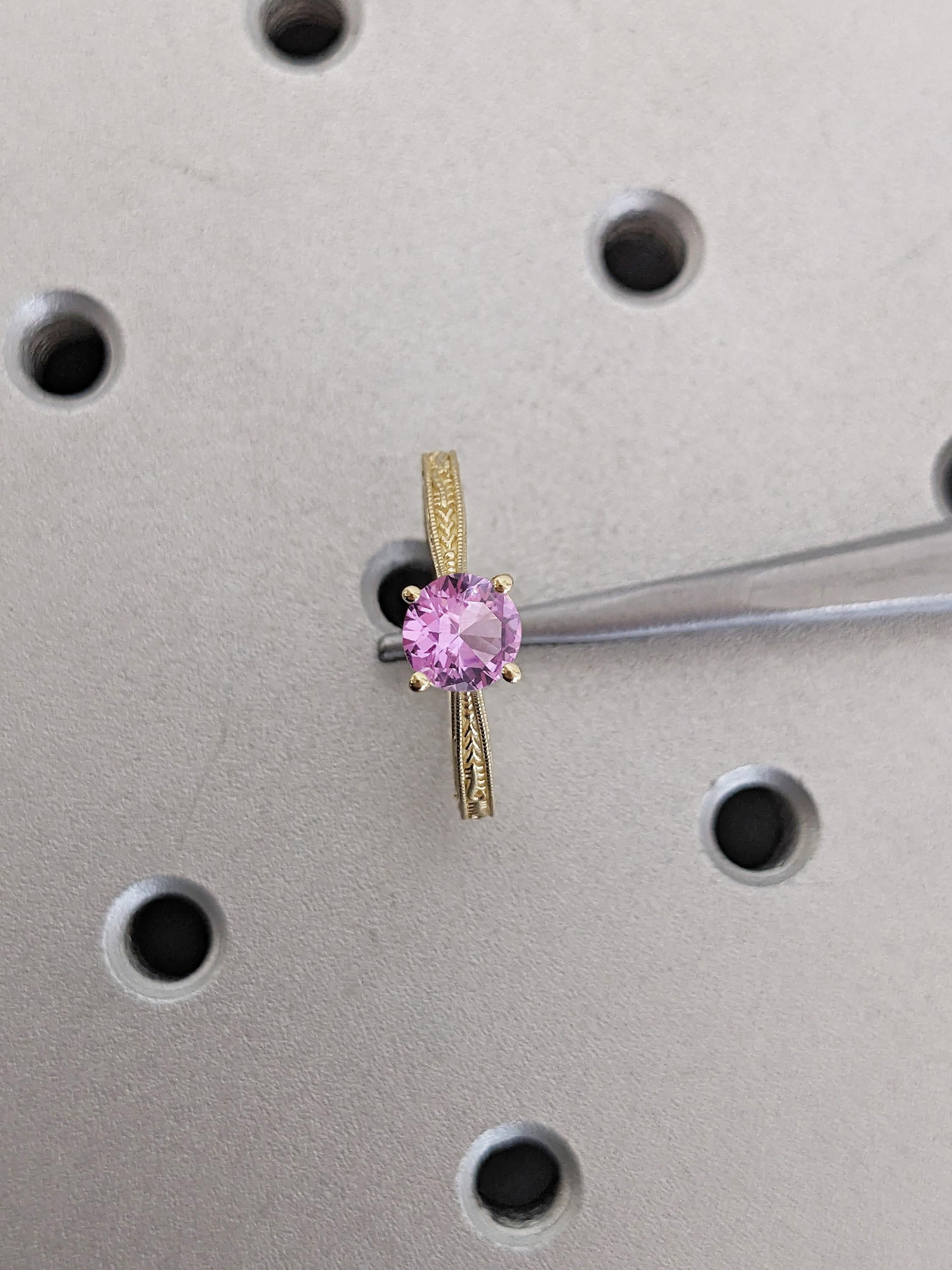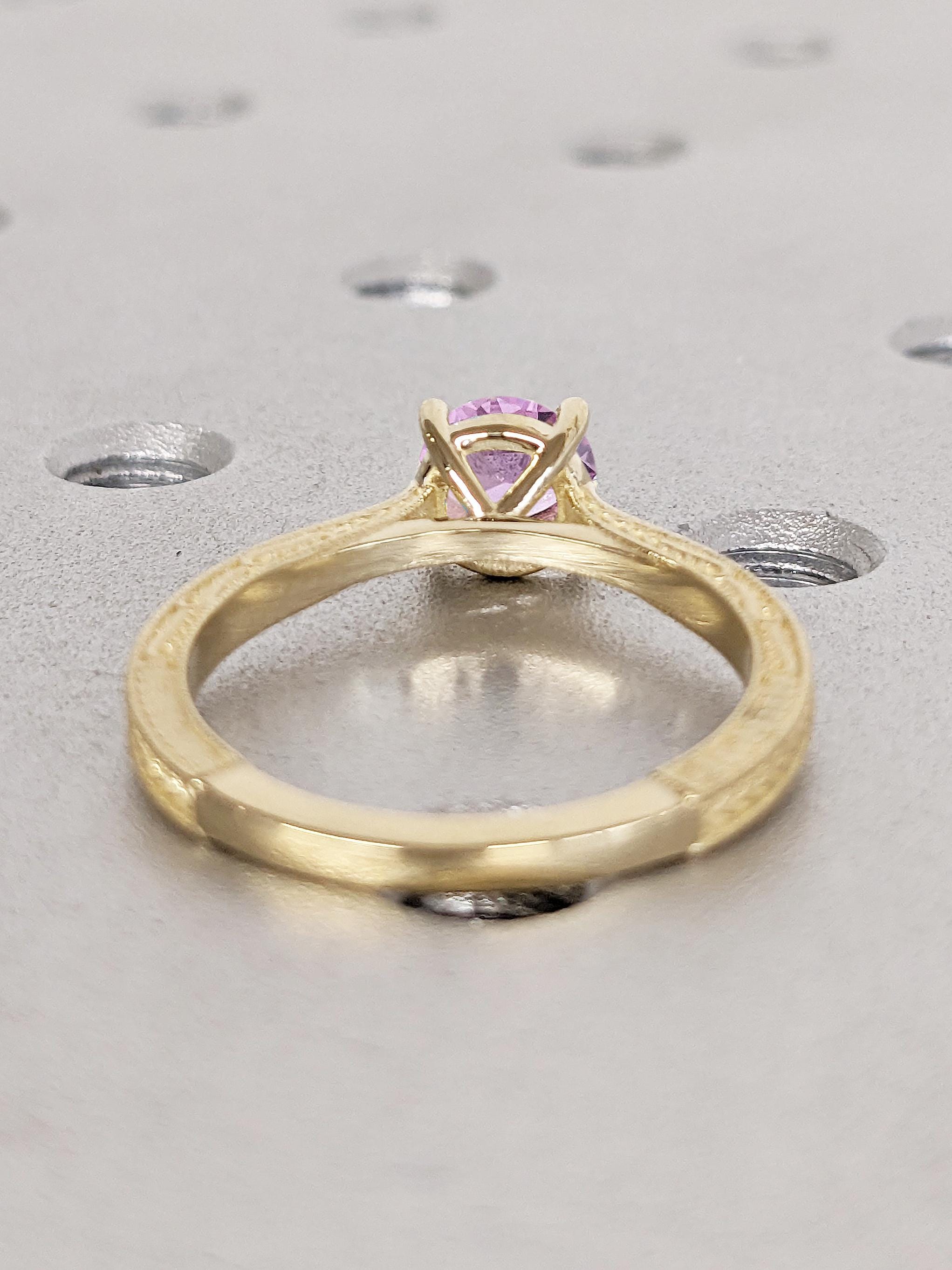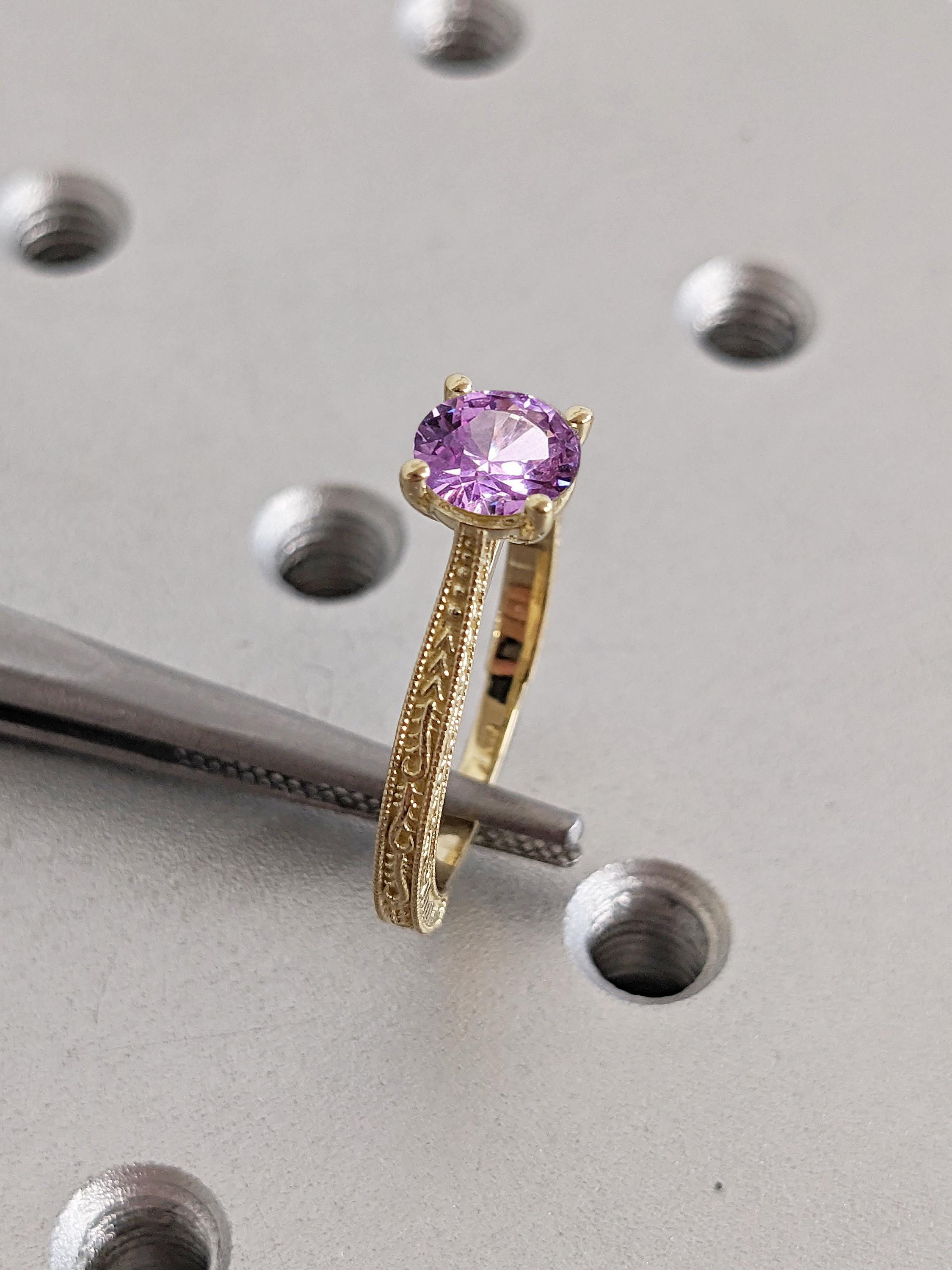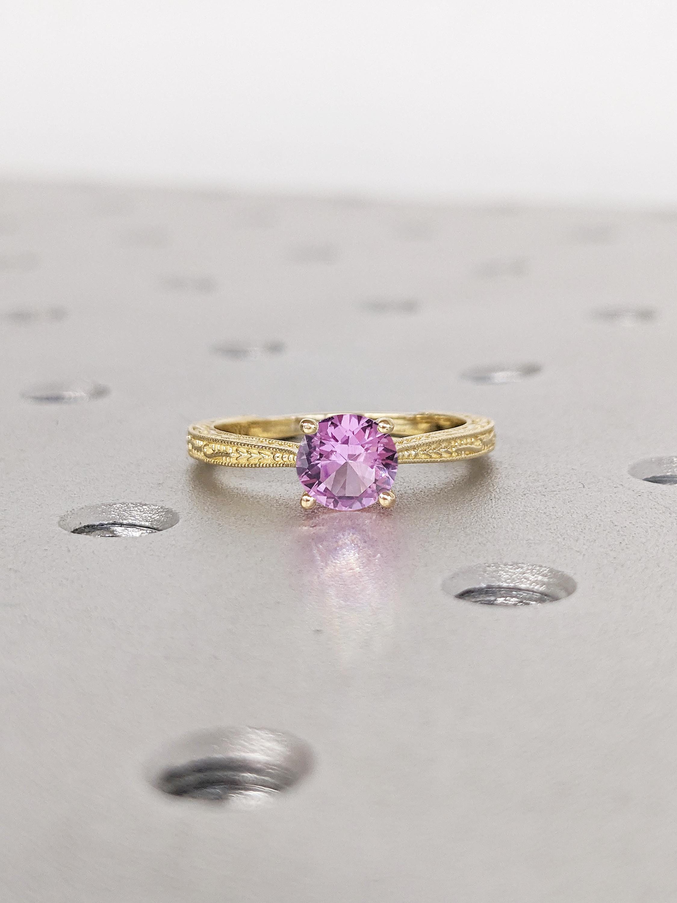 This exquisite engagement ring showcases a round cut Lab Alexandrite at its center, elegantly secured in a classic prong setting. The gold band is adorned with intricate filigree patterns, adding a touch of vintage charm, while delicate milgrain detailing enhances its timeless elegance. A perfect blend of sophistication and romance, this ring is a stunning symbol of everlasting love.