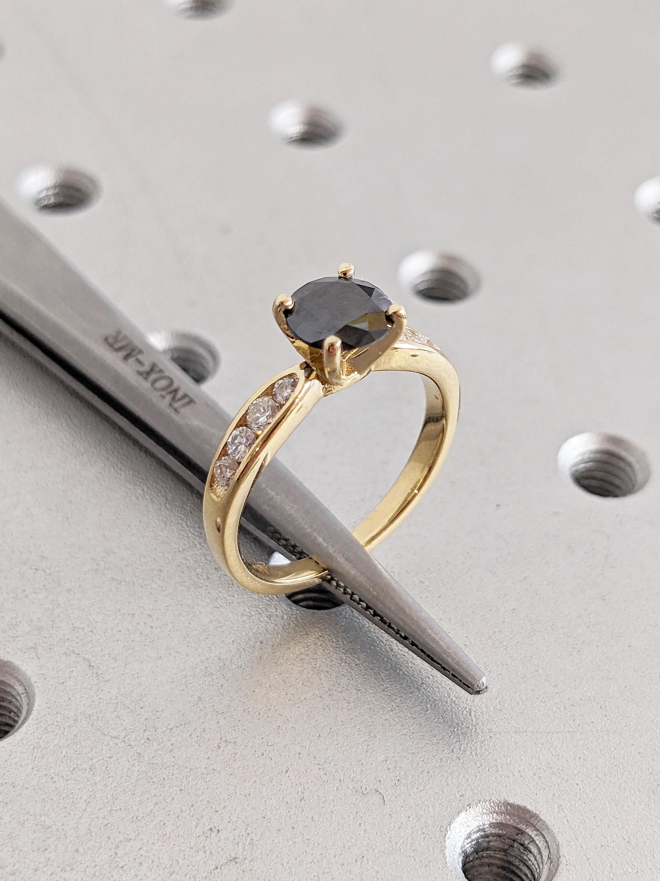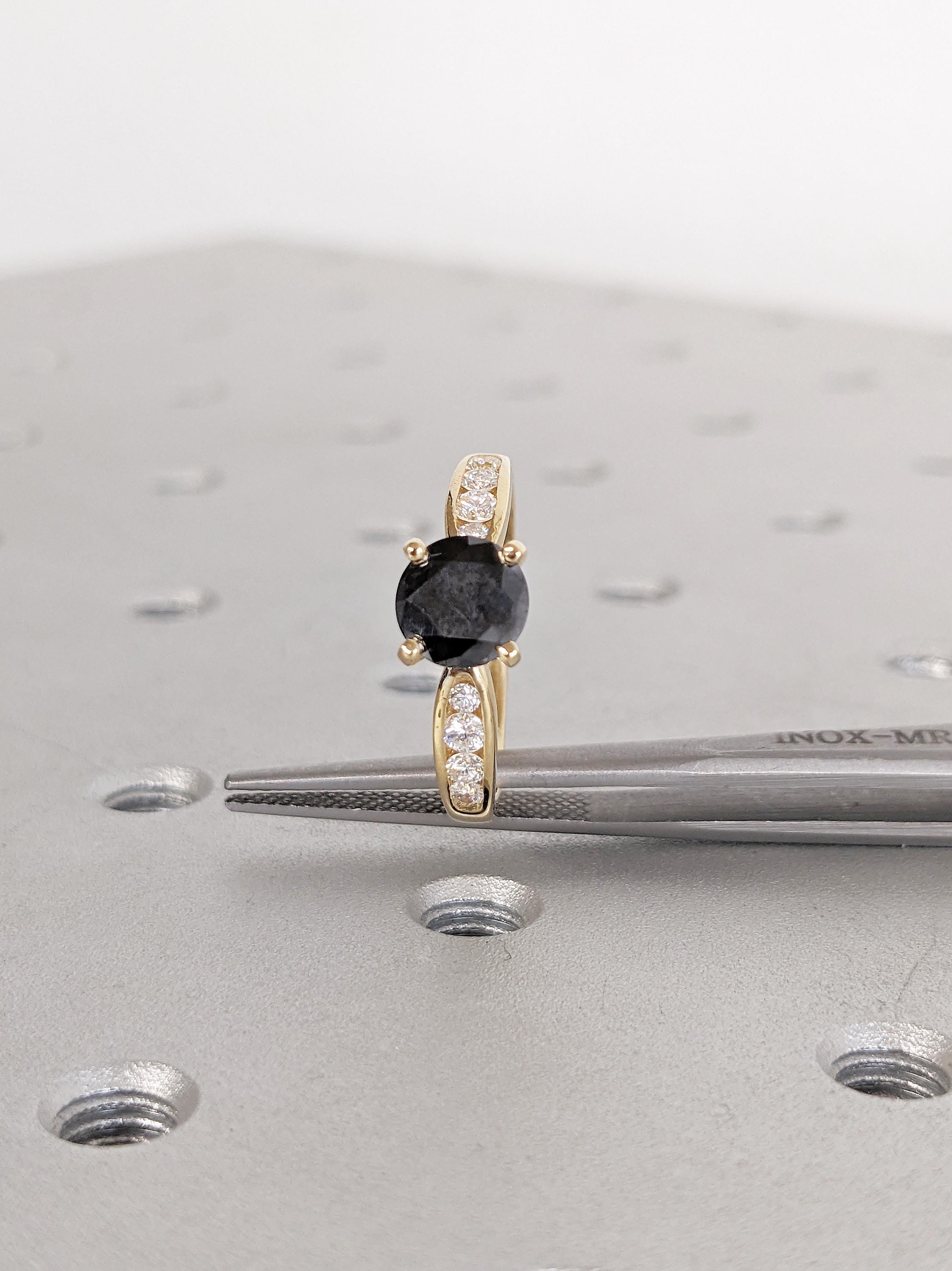 This stunning engagement ring features a round cut Black Diamond at its center, complemented by a row of sparkling side stones in channel settings along the band. Choose from Natural Diamonds, Lab Grown Diamonds, or Moissanite for the side stones. A timeless design that blends modern elegance with striking contrast. This is perfect for those who love a sophisticated statement piece.