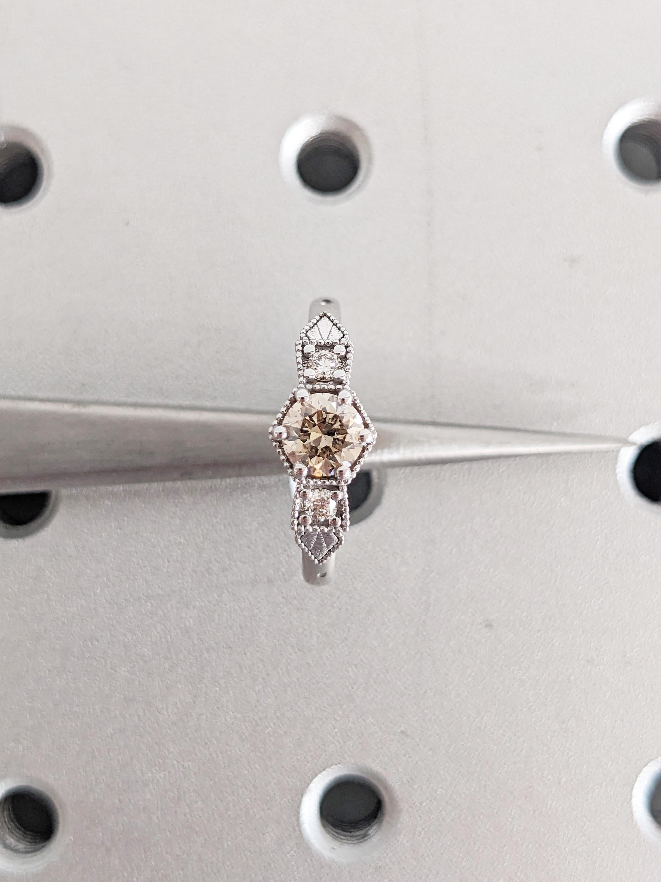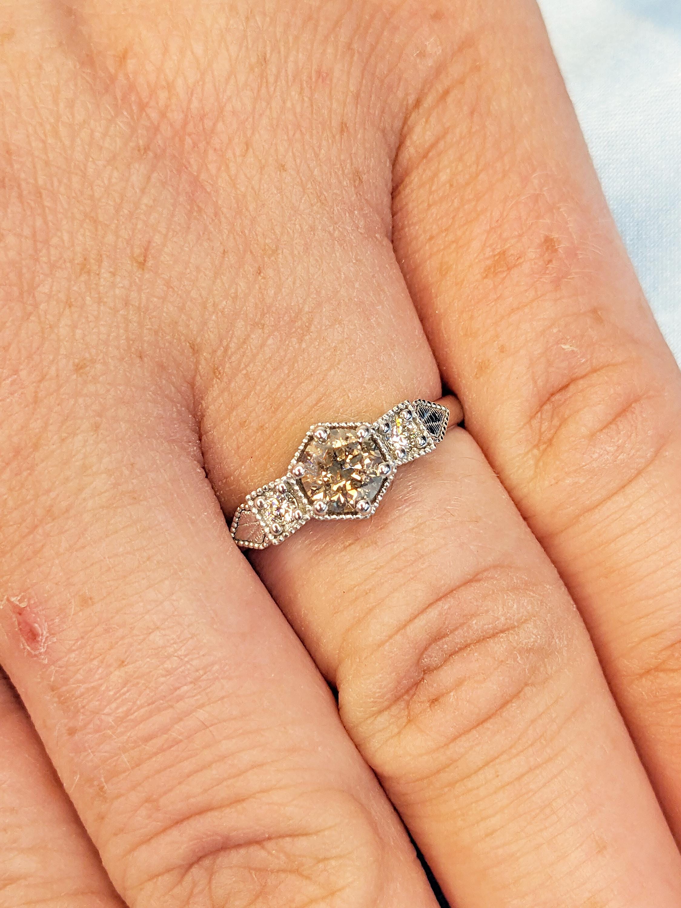 Embrace refined elegance with our hexagonal setting, showcasing your choice of Natural Diamonds or Moissanites that perfectly accentuate the warm glow of a champagne-colored natural diamond centerpiece. Delicate milgrain detailing adds vintage charm, while the timeless design makes this ring a lasting symbol of love and style, crafted to make your engagement truly unforgettable.