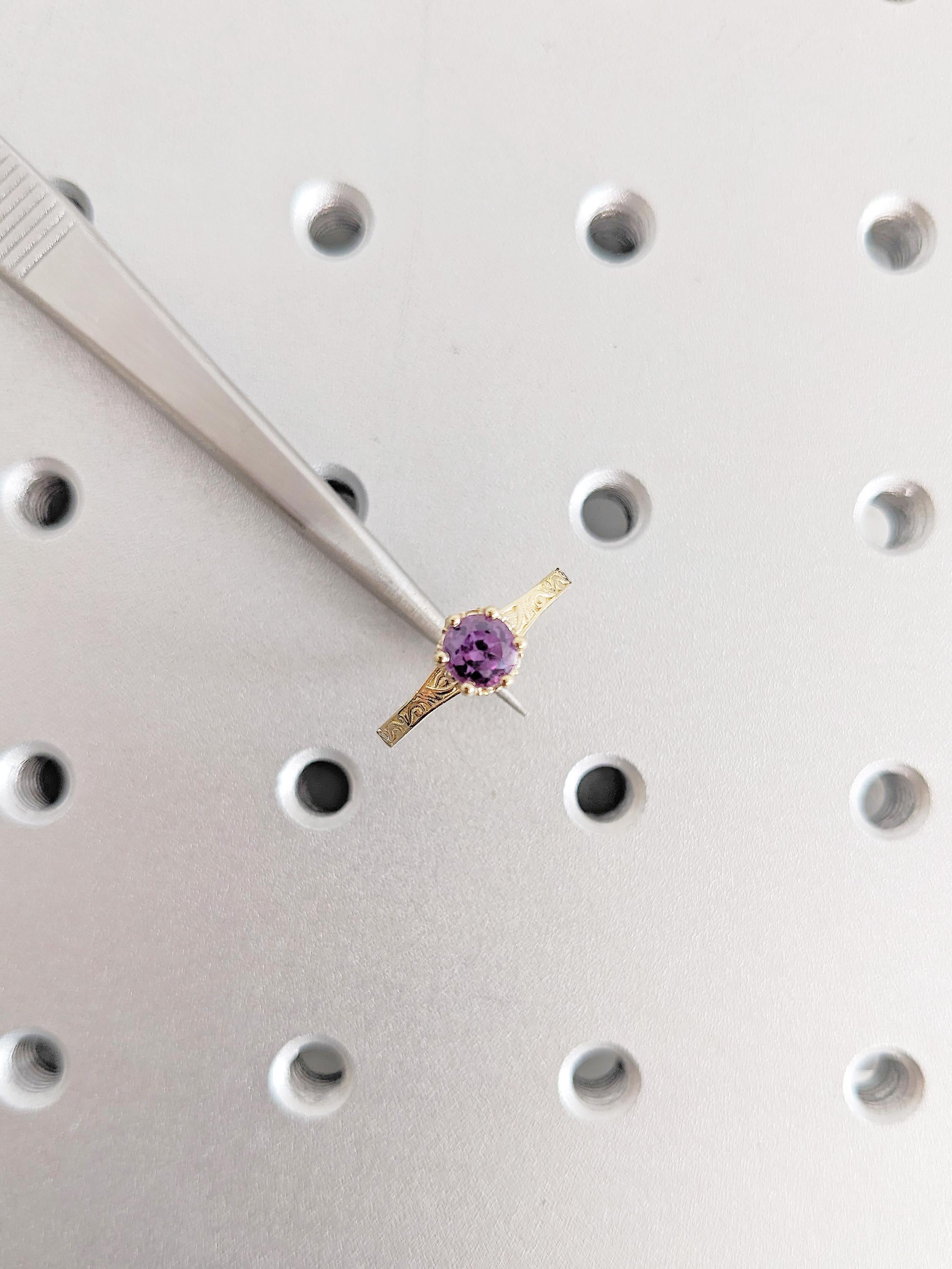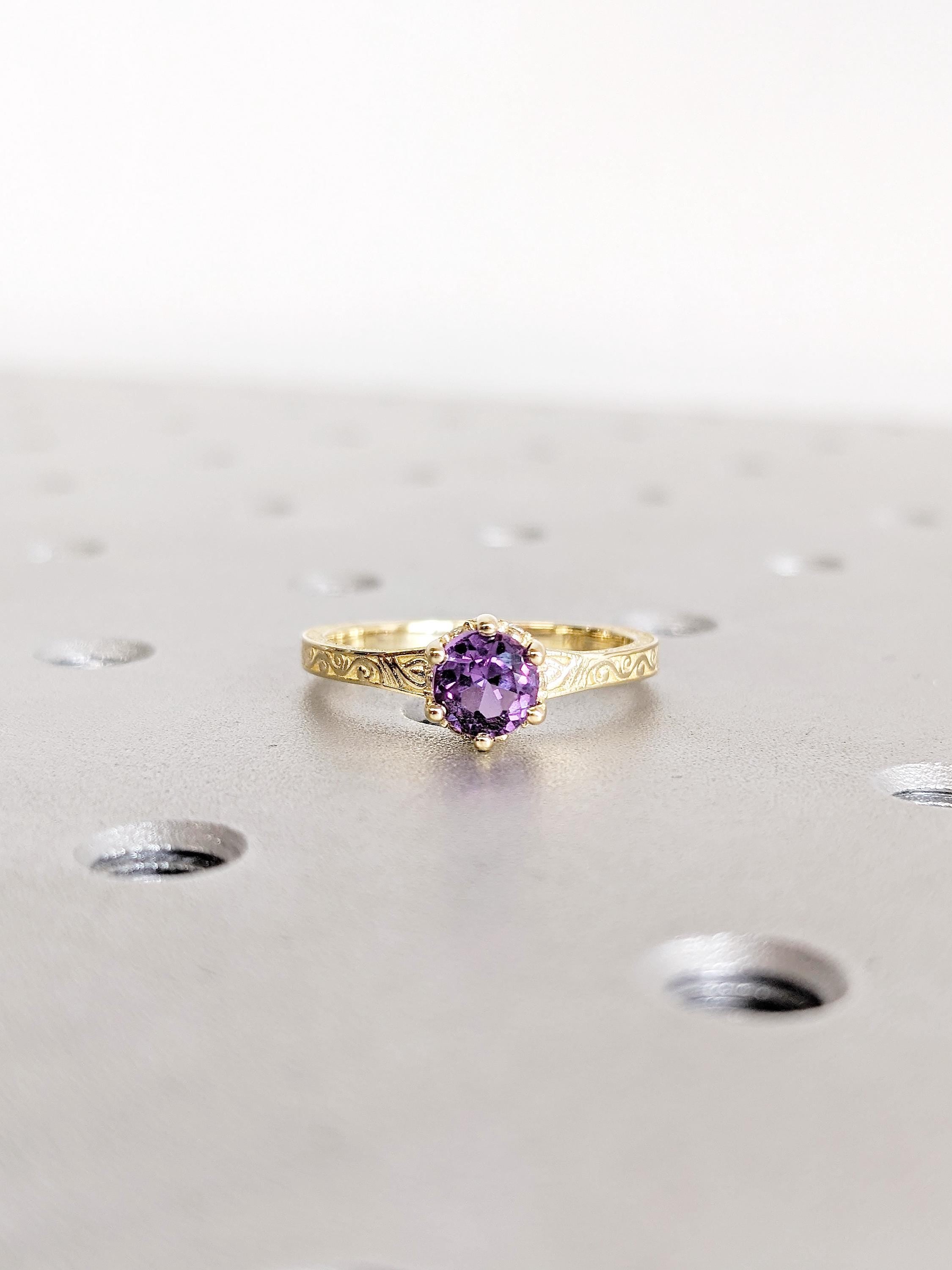 Round Cut Alexandrite Ring, 14K Yellow Gold, Vintage Filigree Hidden Halo Birthstone Ring