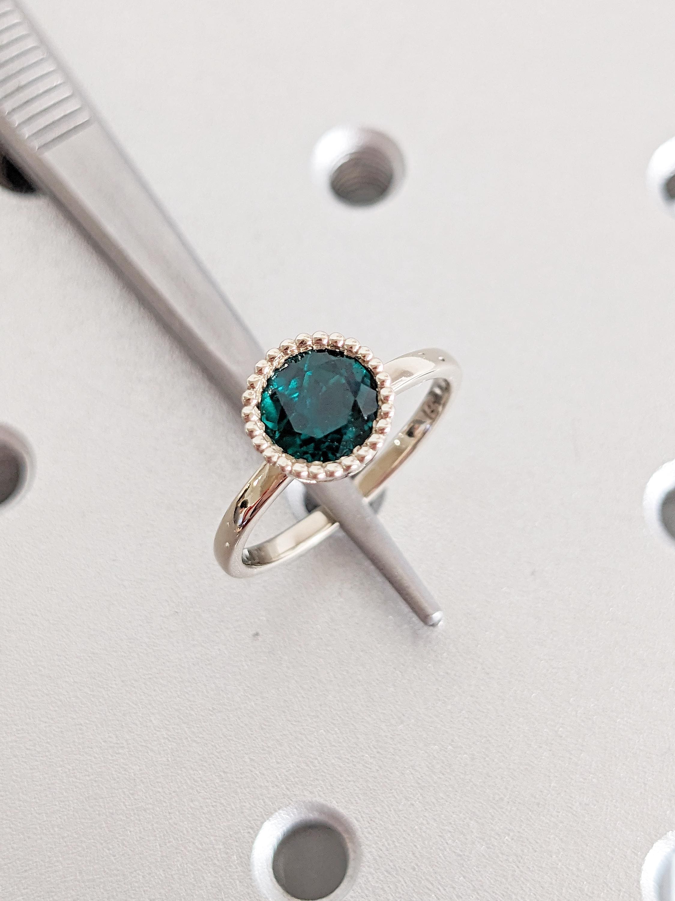 This enchanting engagement ring features a round cut Lab Emerald set in a delicate milgrain bezel basket setting. The rich green hue of the emerald is beautifully framed by the intricate beaded detailing, while the open basket design allows light to flow through, enhancing its brilliance. A timeless and elegant design, this piece blends vintage charm with modern craftsmanship.