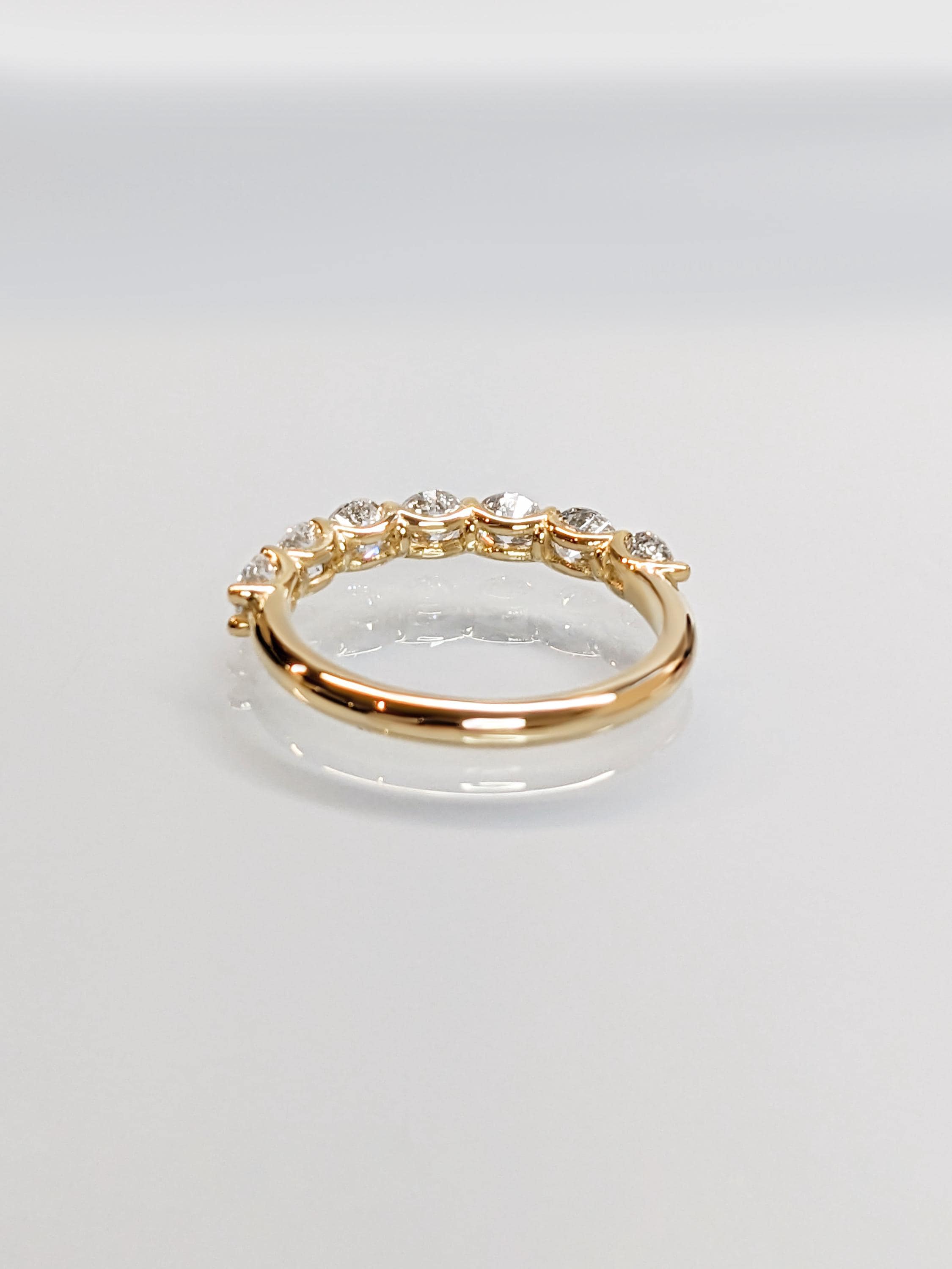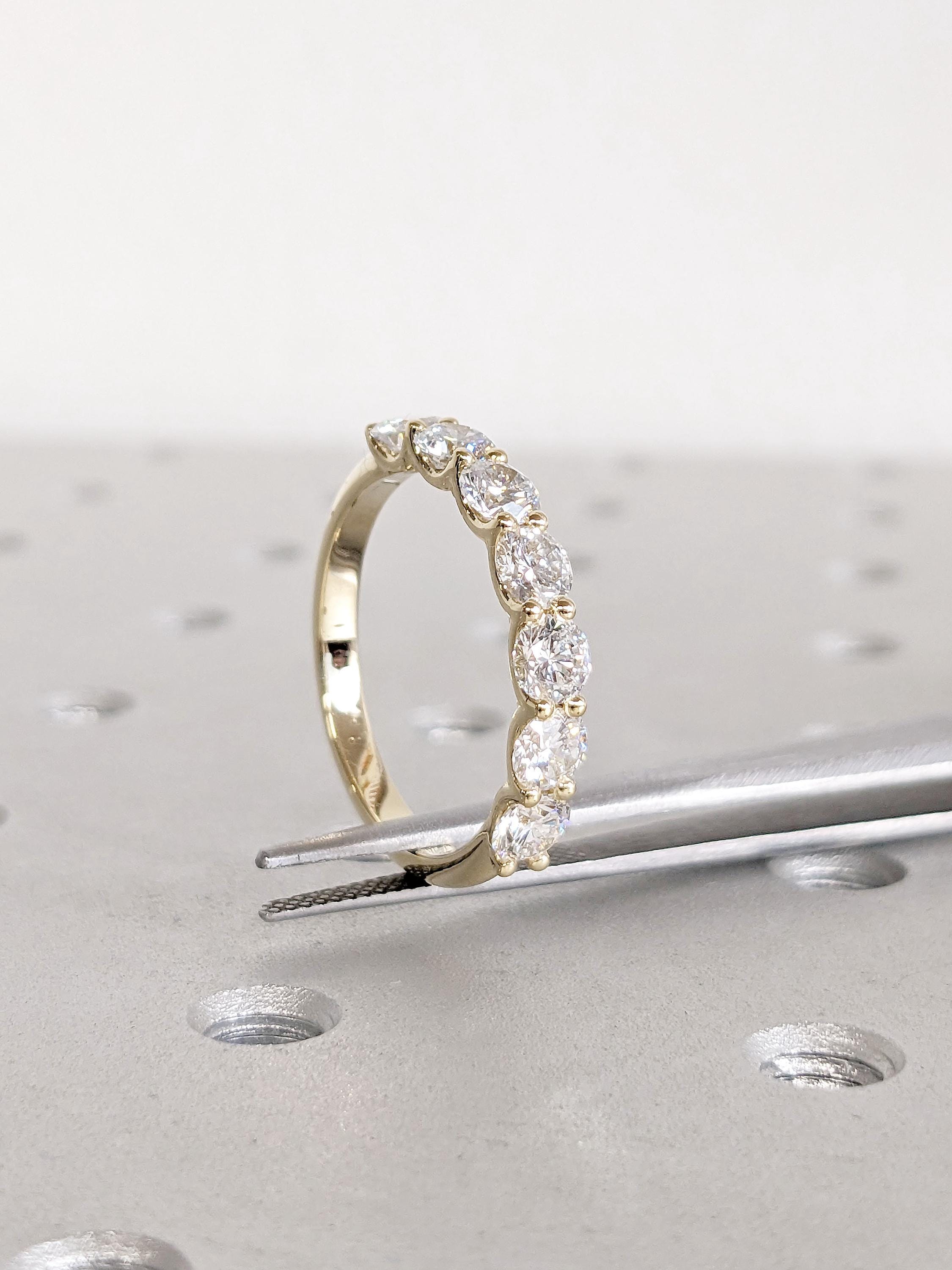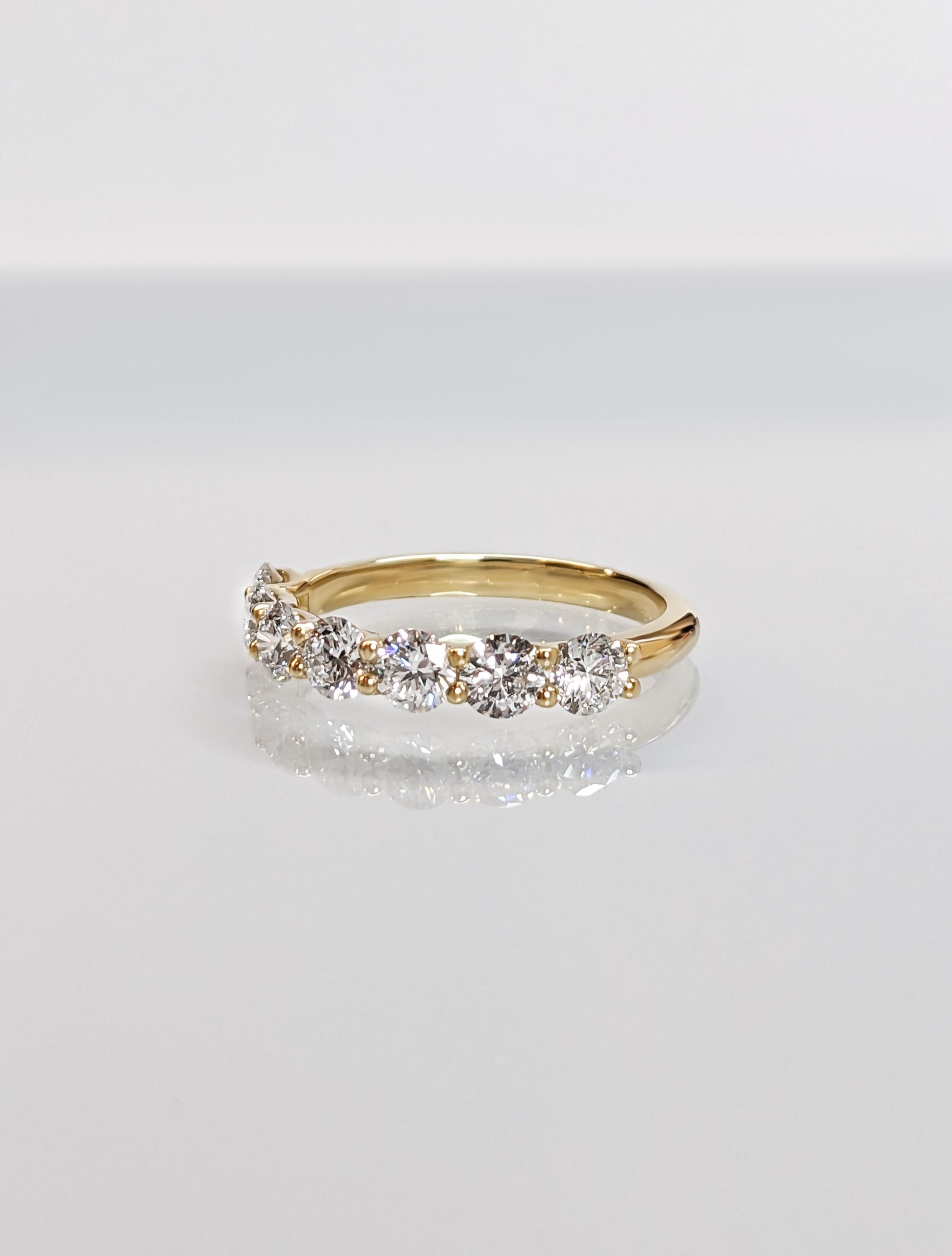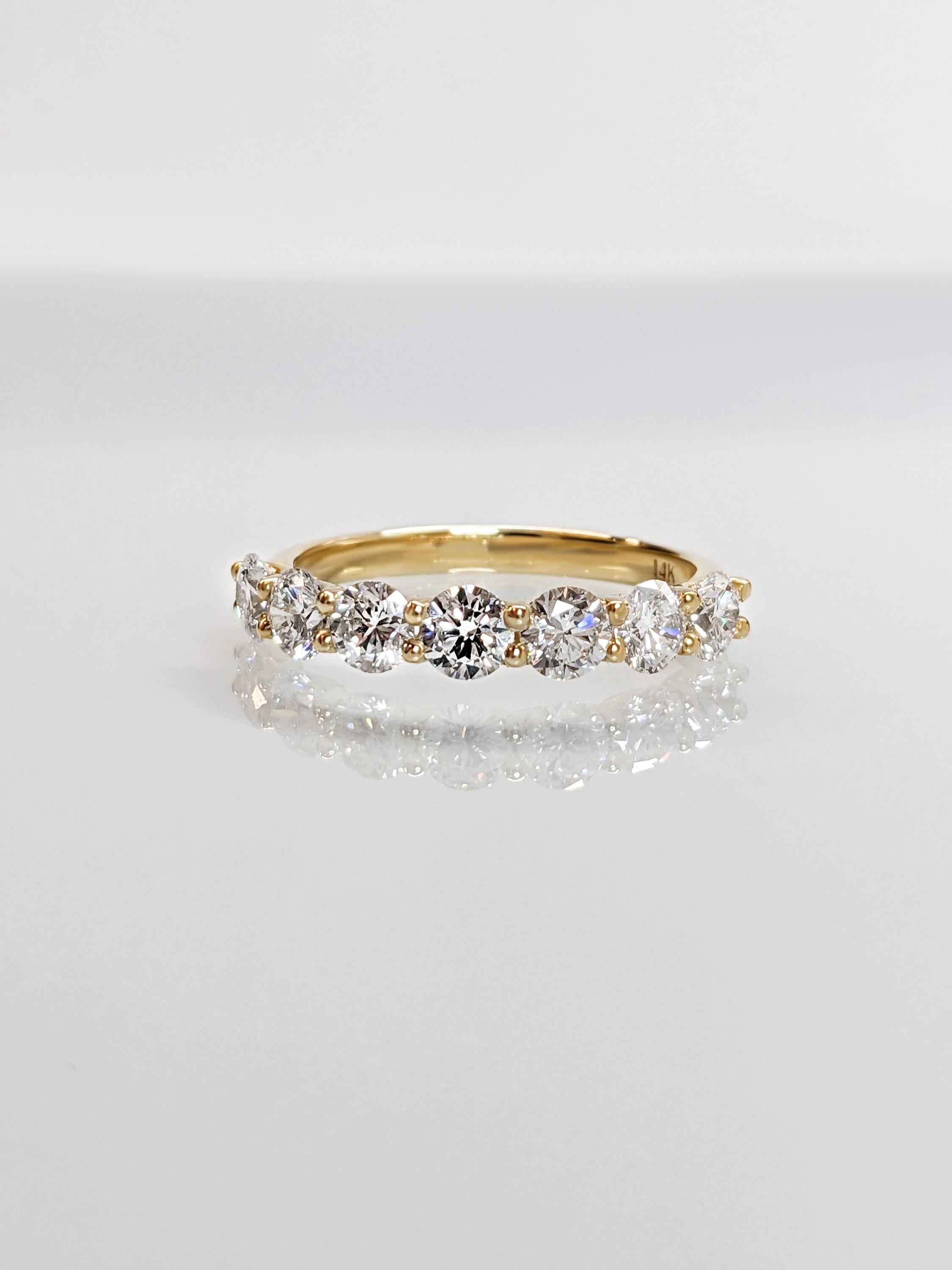 A timeless handmade ring, features seven sparkling round cut gemstones, set in elegant prong settings on a rounded top band of 2.4mm width. Customize the ring with your choice of natural diamonds, lab diamonds or moissanites to suit your budget.