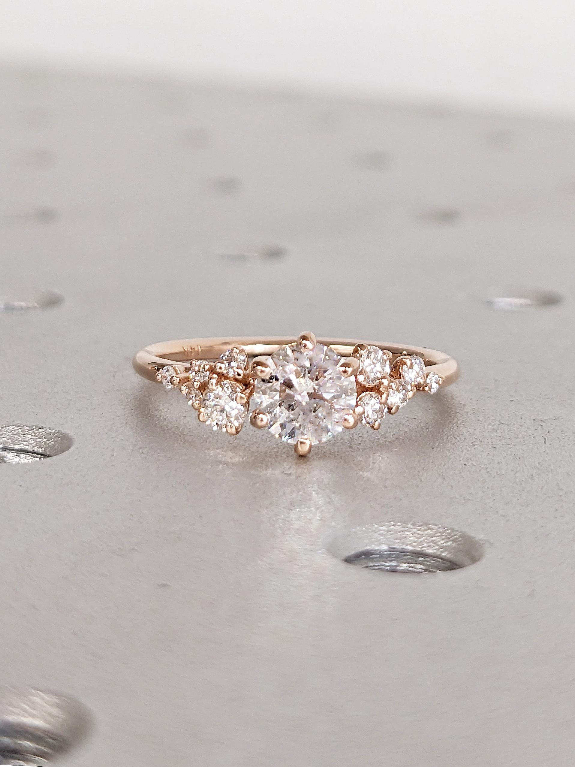 Round Cut Lab Grown Diamond Ring, Vintage 14k Rose Gold Engagement Ring, Snowdrift Diamond Cluster Ring, Art Deco Lab Created Diamond Ring