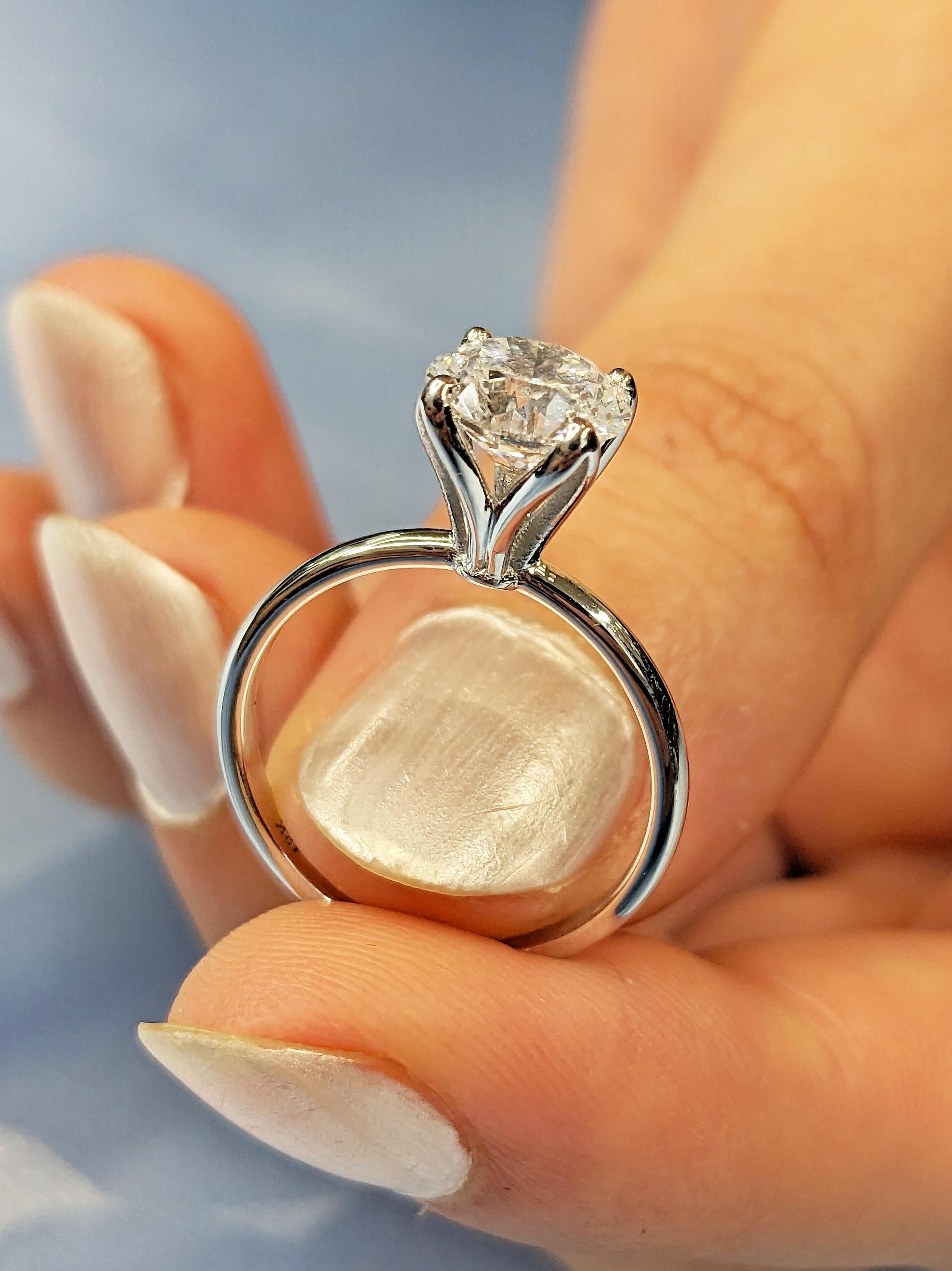This elegant solitaire engagement ring features a round cut Moissanite in a classic prong setting. Set on a sleek band, it offers timeless beauty and modern sophistication, perfect for a love that lasts forever.