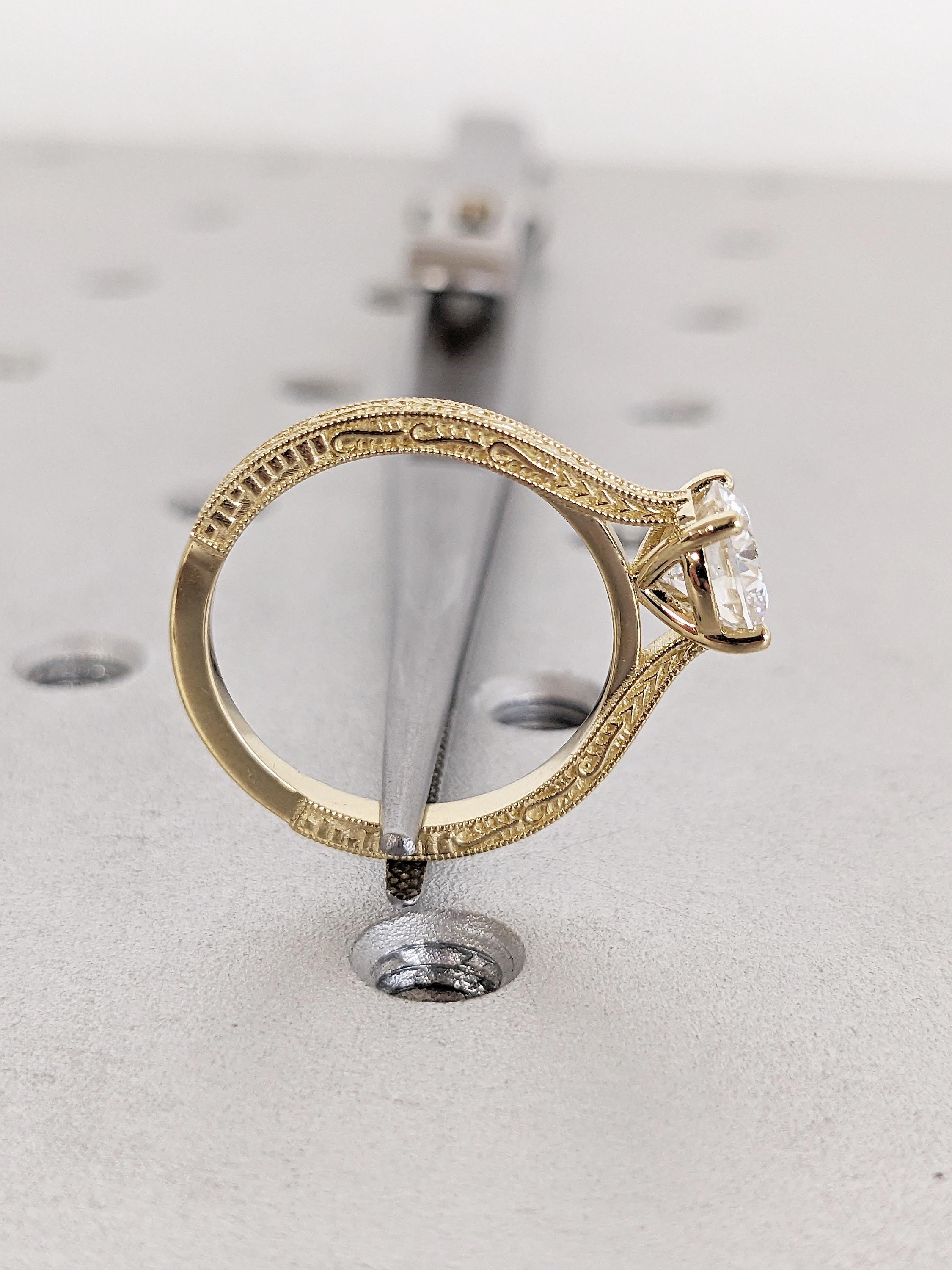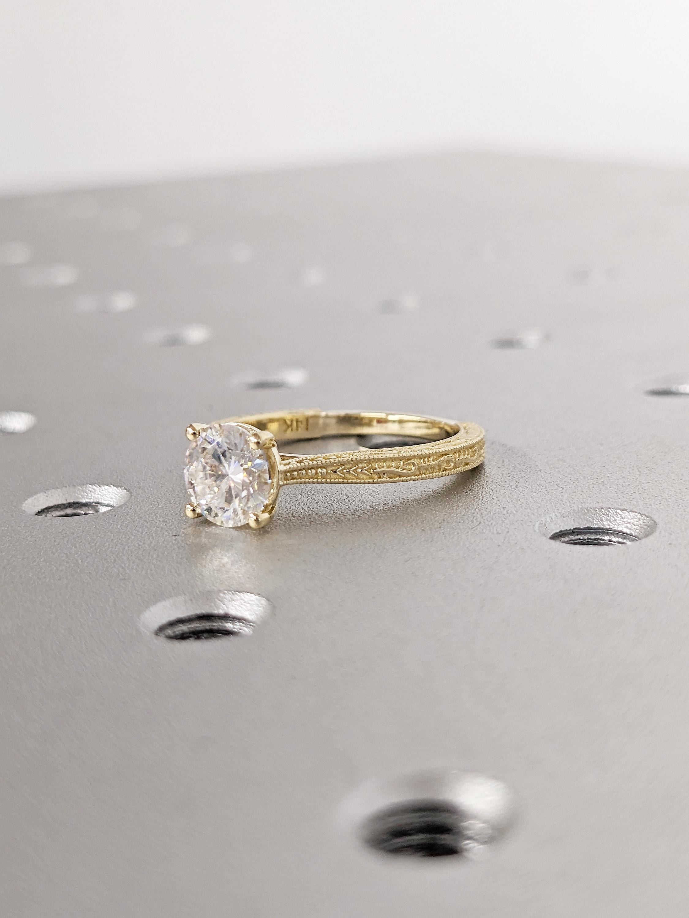 This exquisite engagement ring showcases a round cut Moissanite at its center, elegantly secured in a classic prong setting. The gold band is adorned with intricate filigree patterns, adding a touch of vintage charm, while delicate milgrain detailing enhances its timeless elegance. A perfect blend of sophistication and romance, this ring is a stunning symbol of everlasting love.