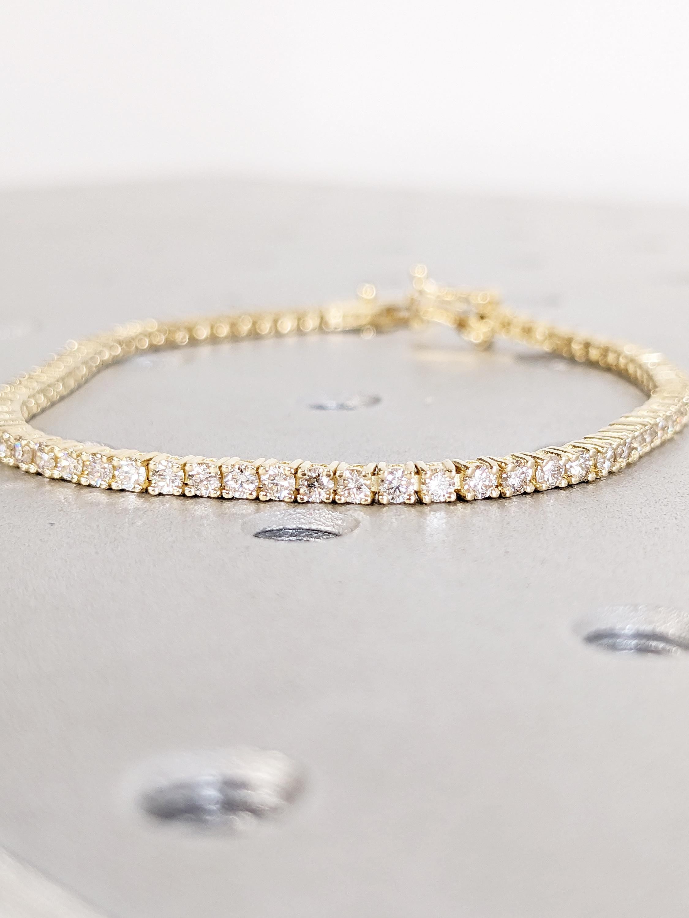 This moissanite tennis bracelet showcases a continuous row of brilliantly faceted stones set in a sleek gold prong setting, delivering exceptional fire and sparkle from every angle. Its slim, elegant profile makes it perfect for both everyday shine and special occasions. A timeless classic reimagined with the brilliance and value of moissanite.
