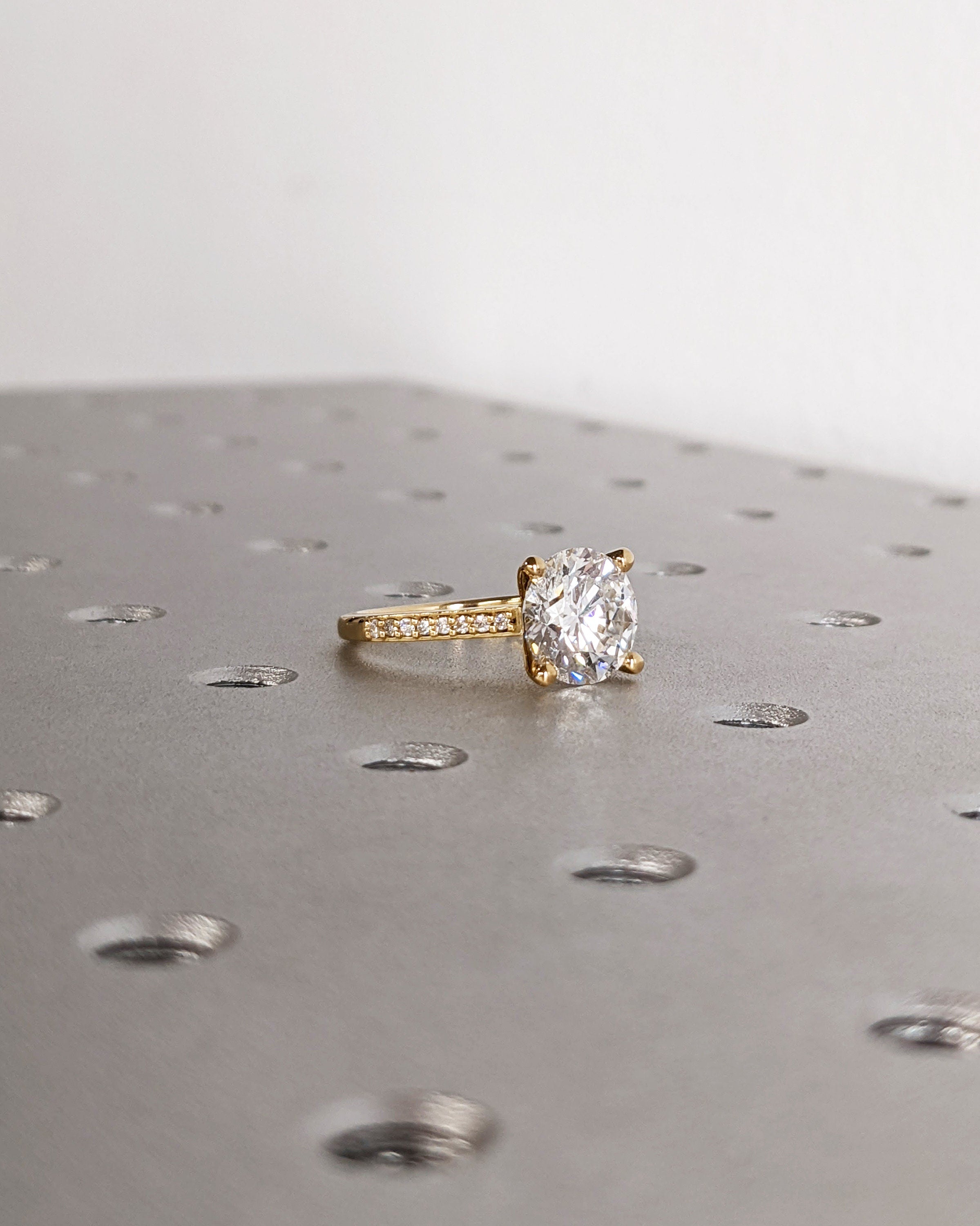 Round Cut Moissanite Wedding Ring, 14K 18K Solid Yellow Gold Band Pavé White Diamond, Timeless Women’s Engagement Ring