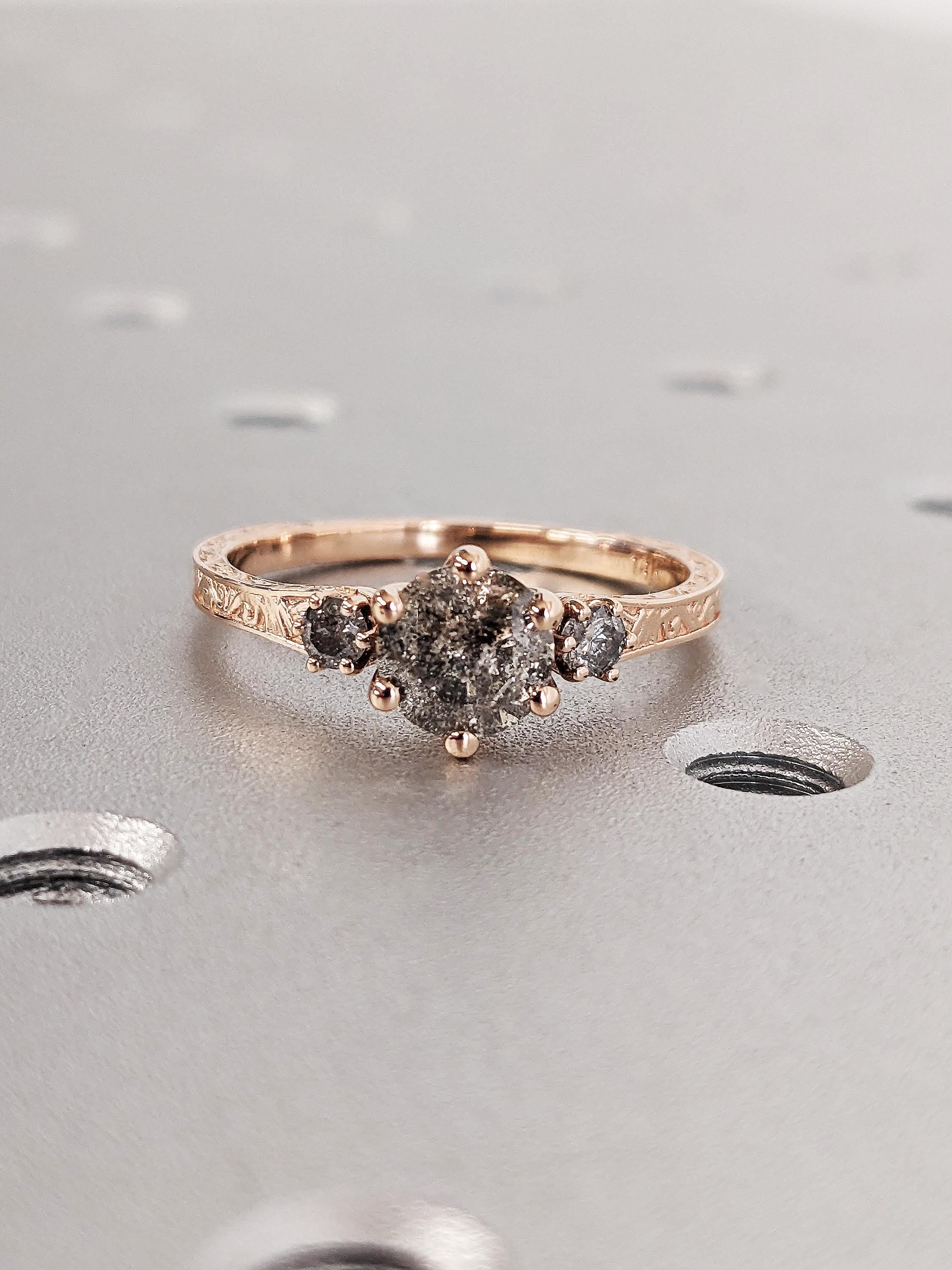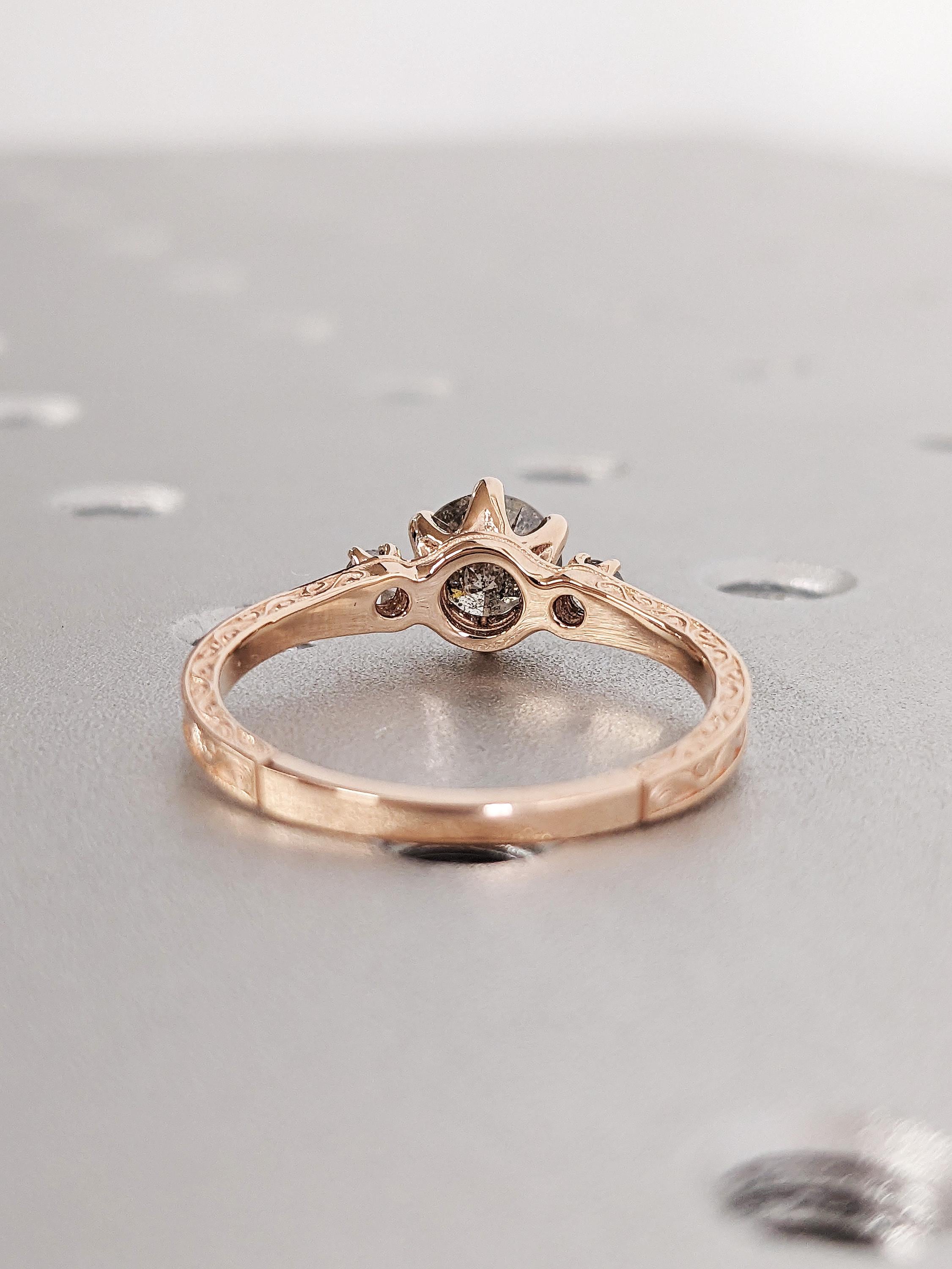 Round Cut Salt and Pepper Diamond Engagement Ring, 14K Rose Gold Art Deco 3 Stone Black Diamond Ring, Vintage Filigree Bridal Band