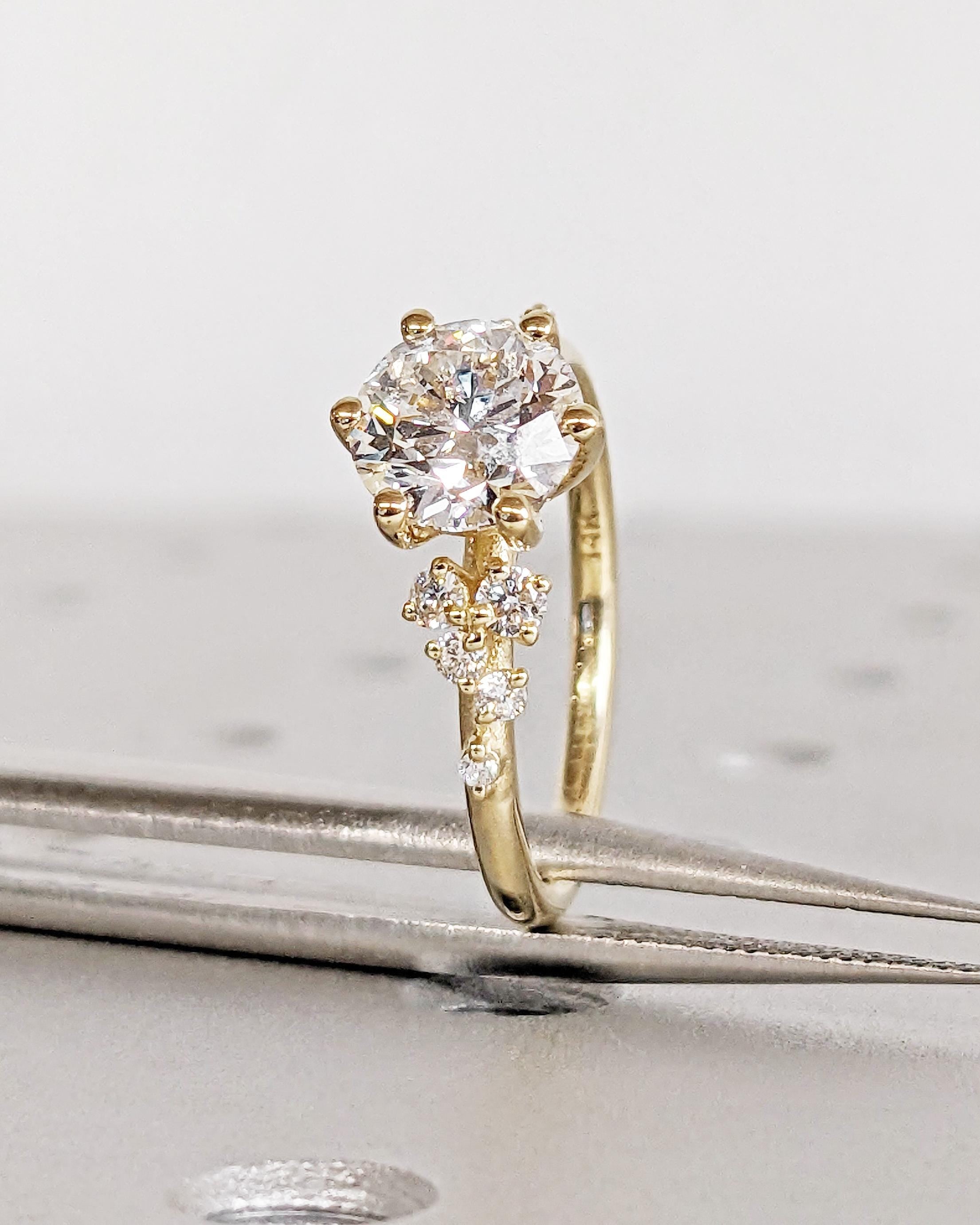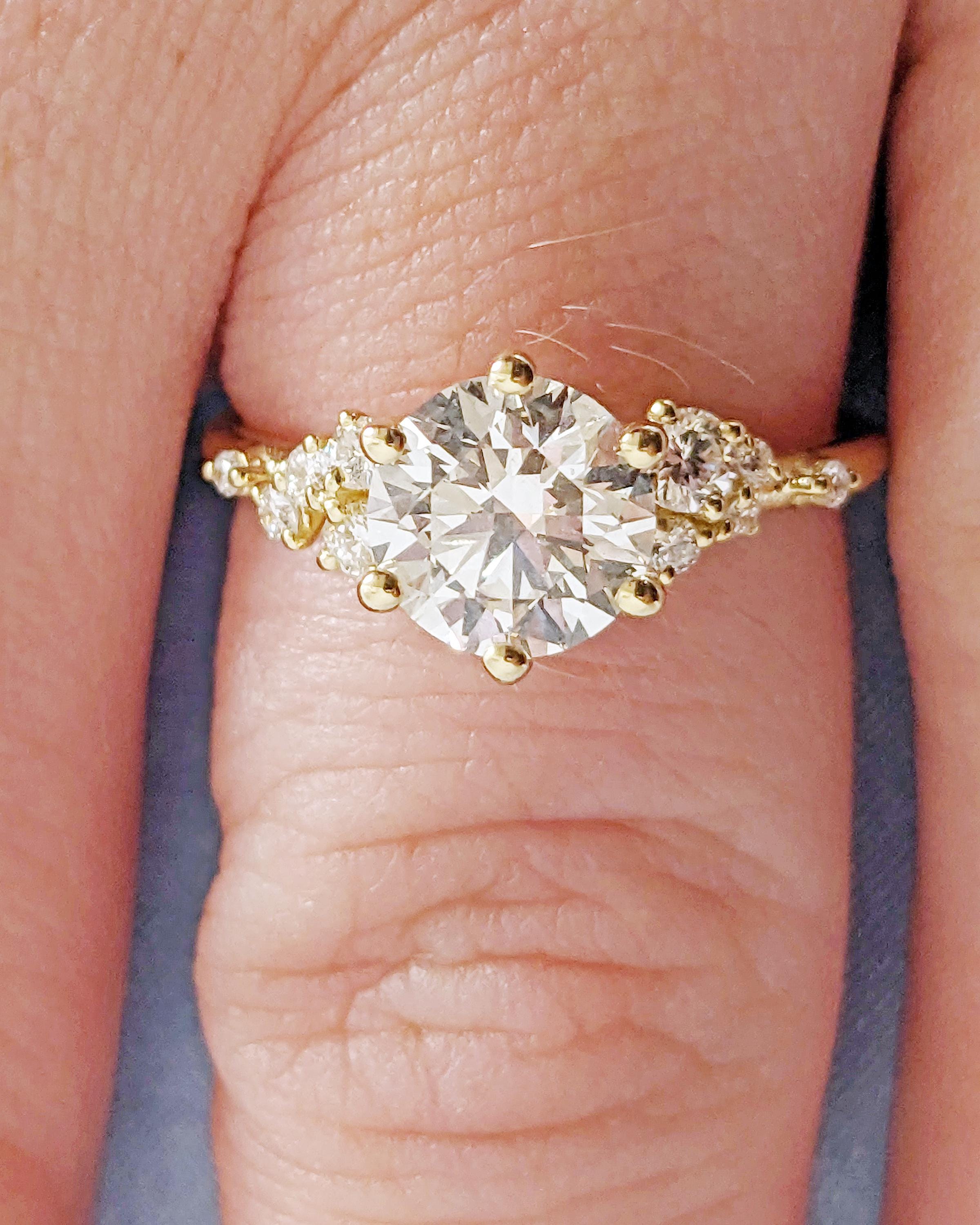 Celebrate the next chapter of your life with our elegantly designed engagement ring, showcasing a classic center stone and a delicate setting. Adorned by a cluster of exquisite Diamonds or Moissanites that glisten like freshly fallen snow, this meticulously handcrafted ring is the perfect symbol of your everlasting love.