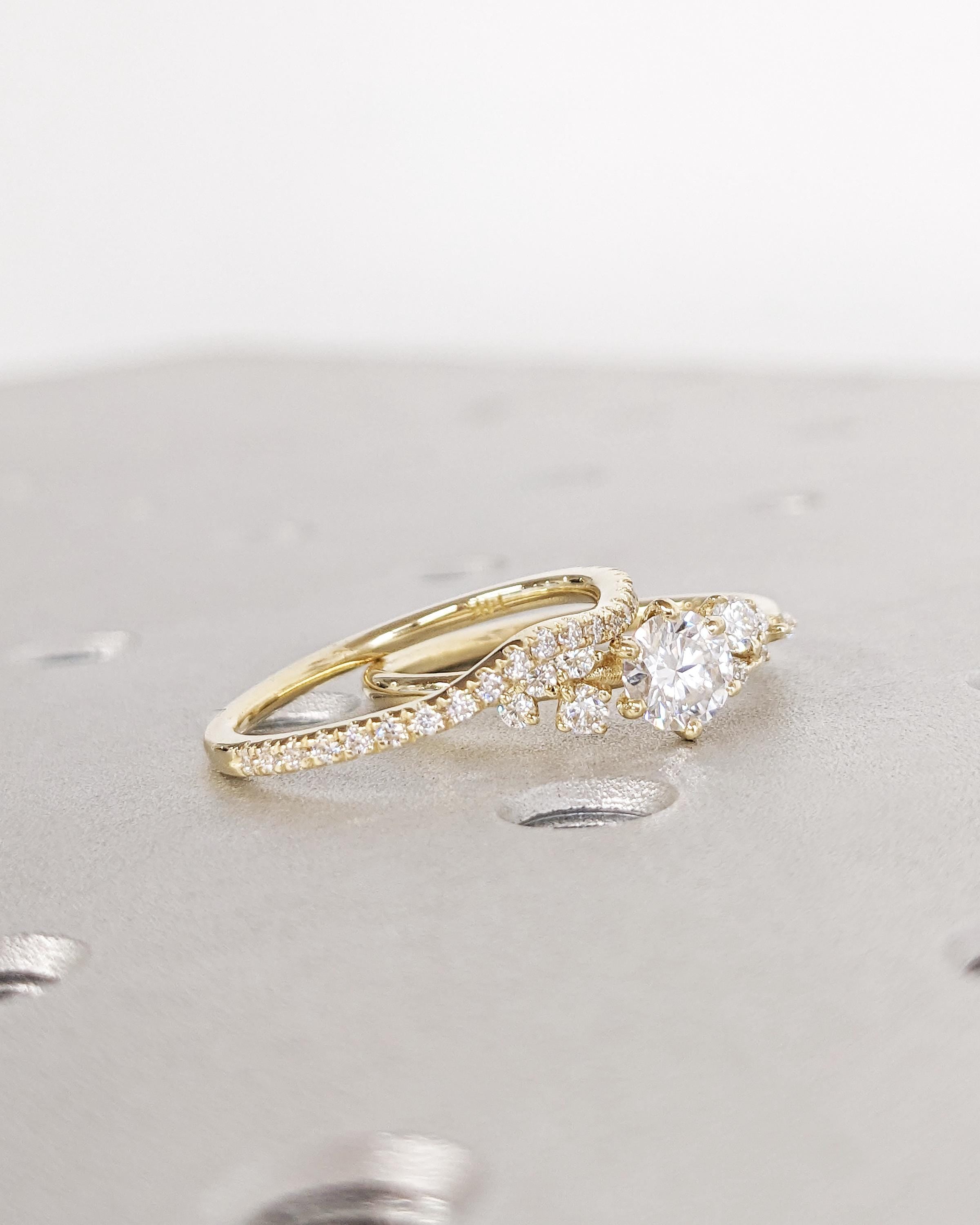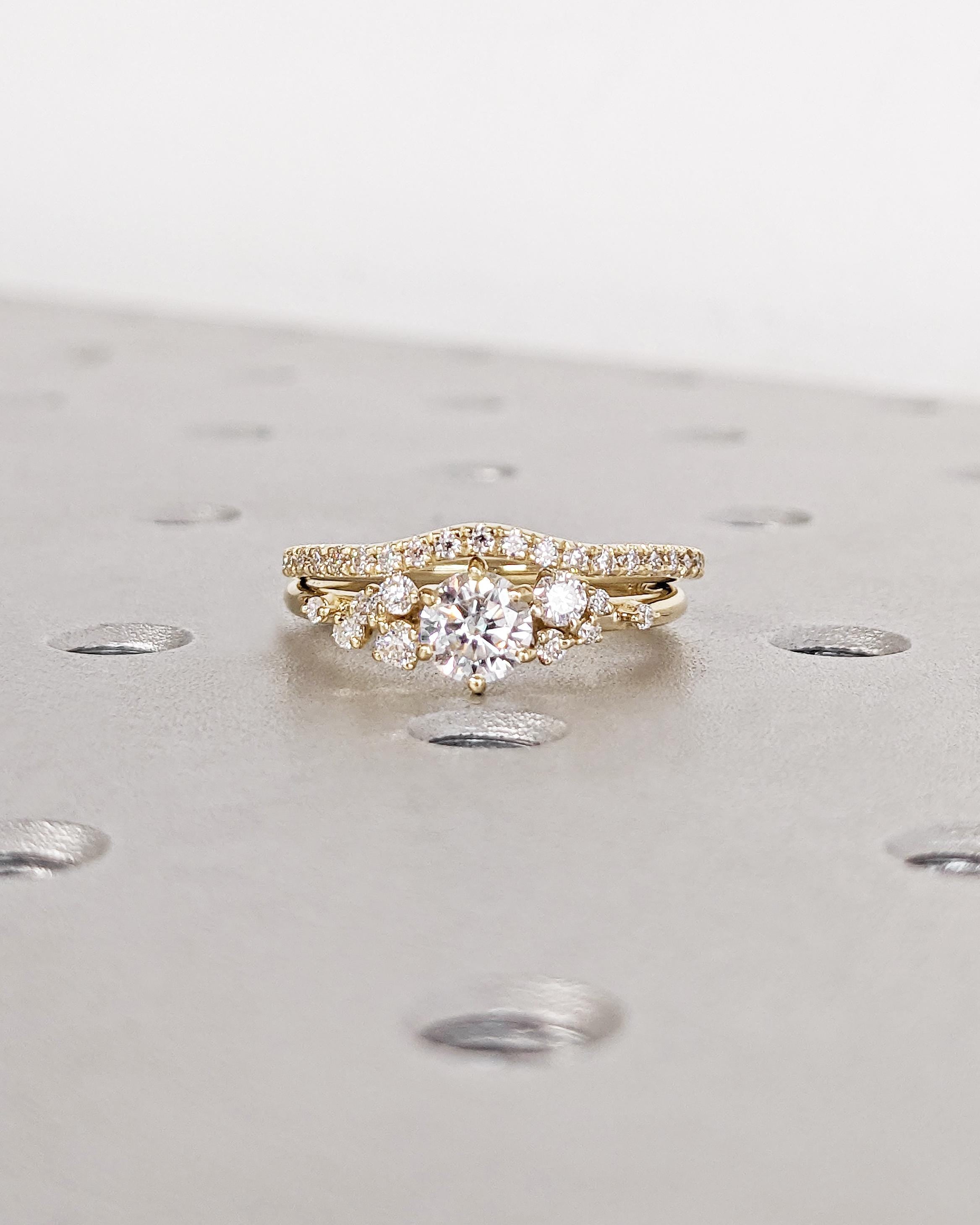 Celebrate the next chapter of your life with our elegantly designed snowdrift-inspired bridal ring set. The engagement ring showcases a classic round cut Moissanite center stone and a delicate setting, adorned by a cluster of exquisite Moissanites that glisten like freshly fallen snow. Choose the engagement ring alone, or pair it with the curved half-eternity pavé Moissanite wedding band for a complete two-piece set.