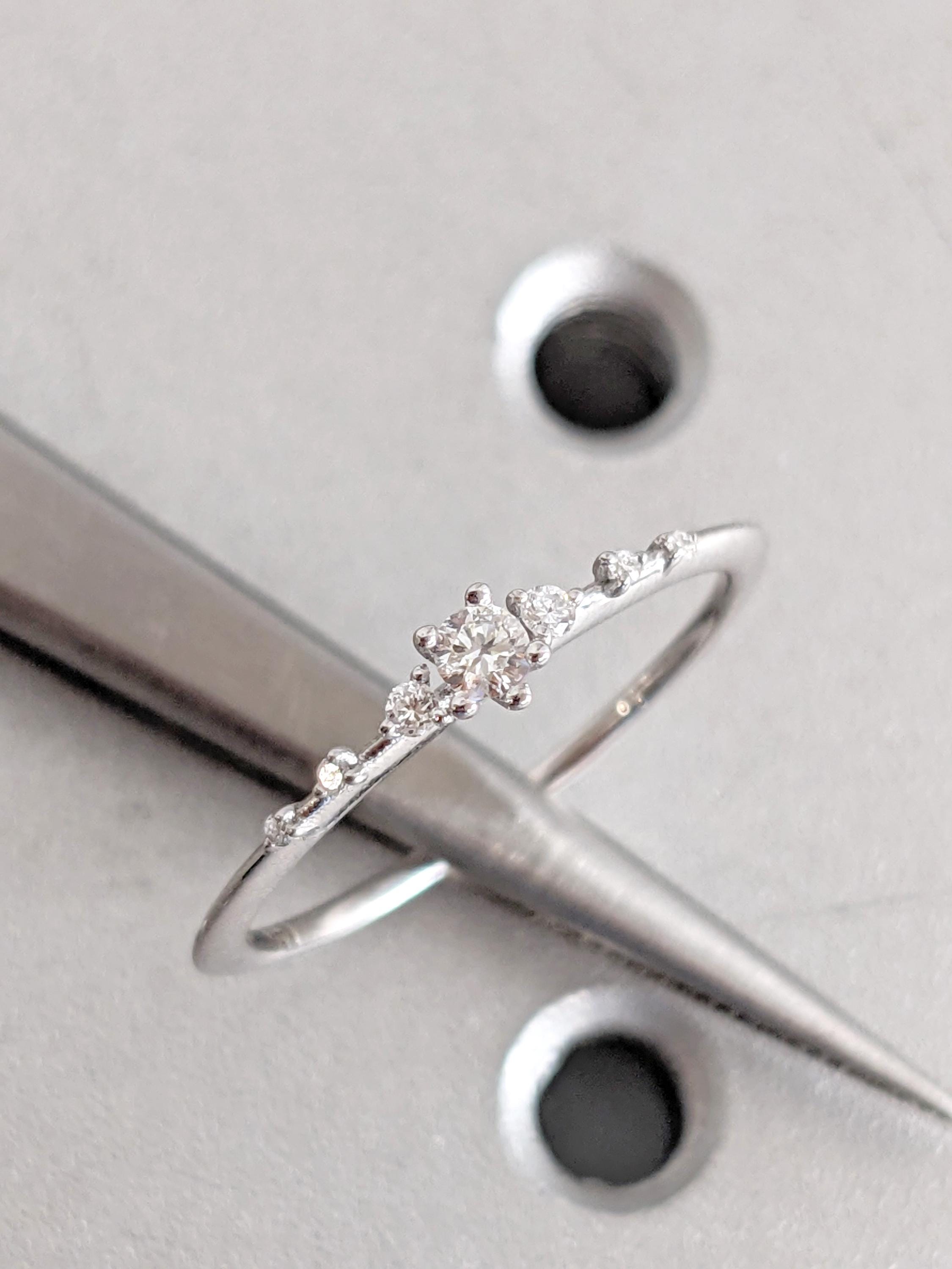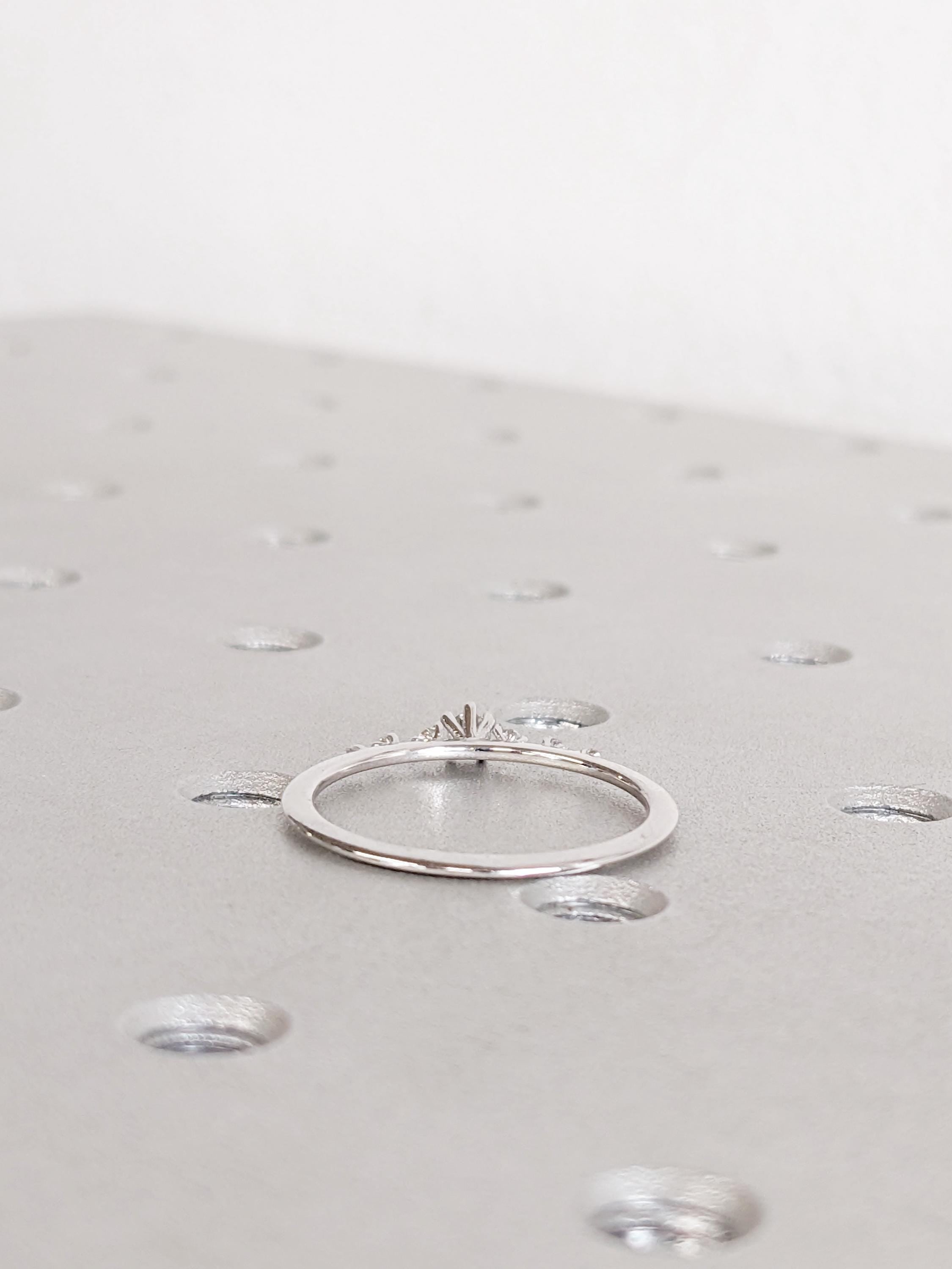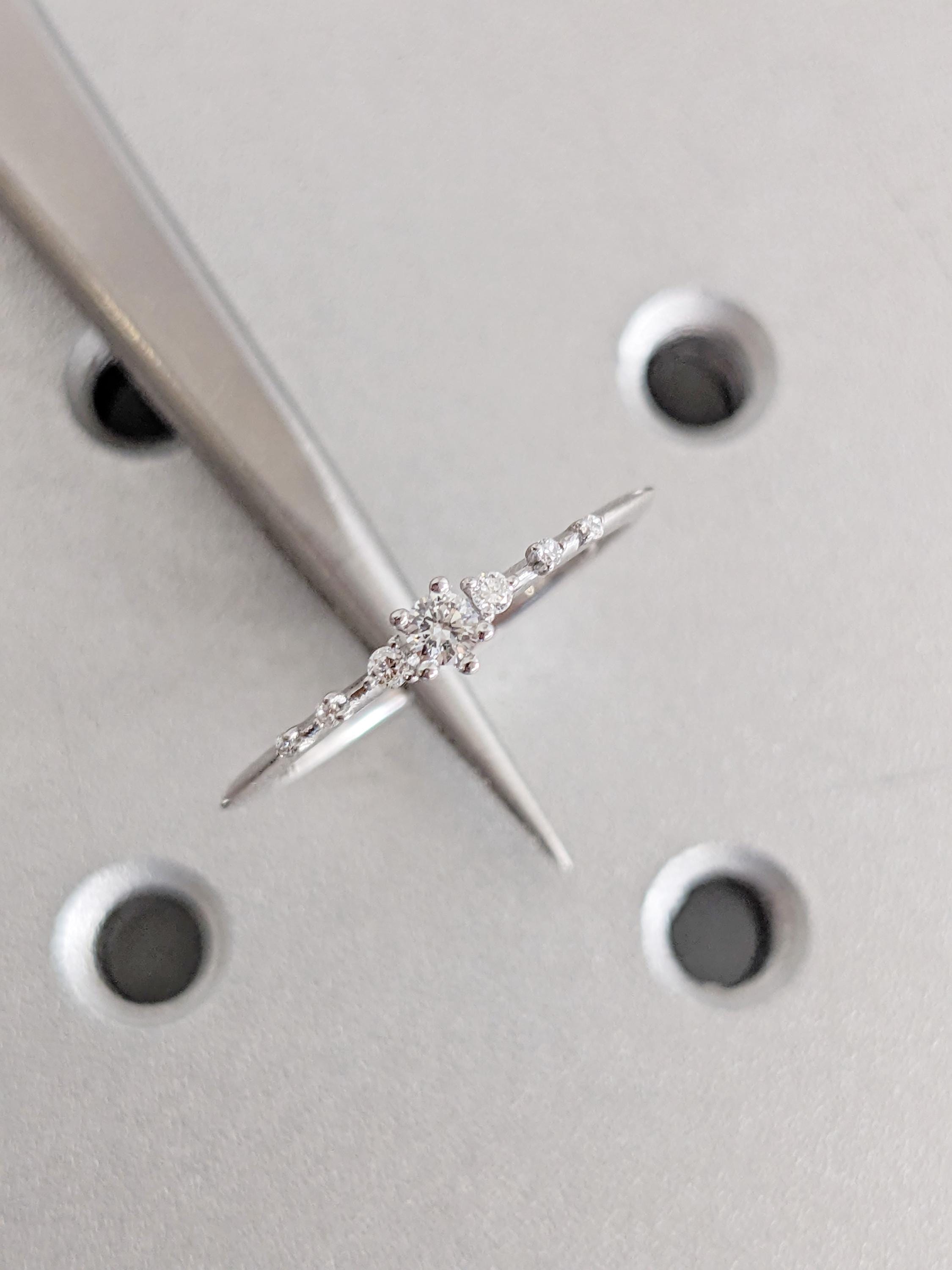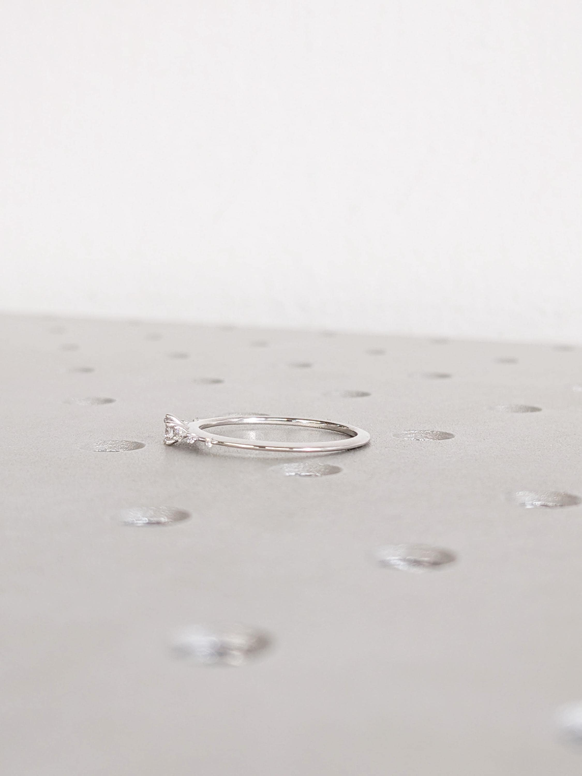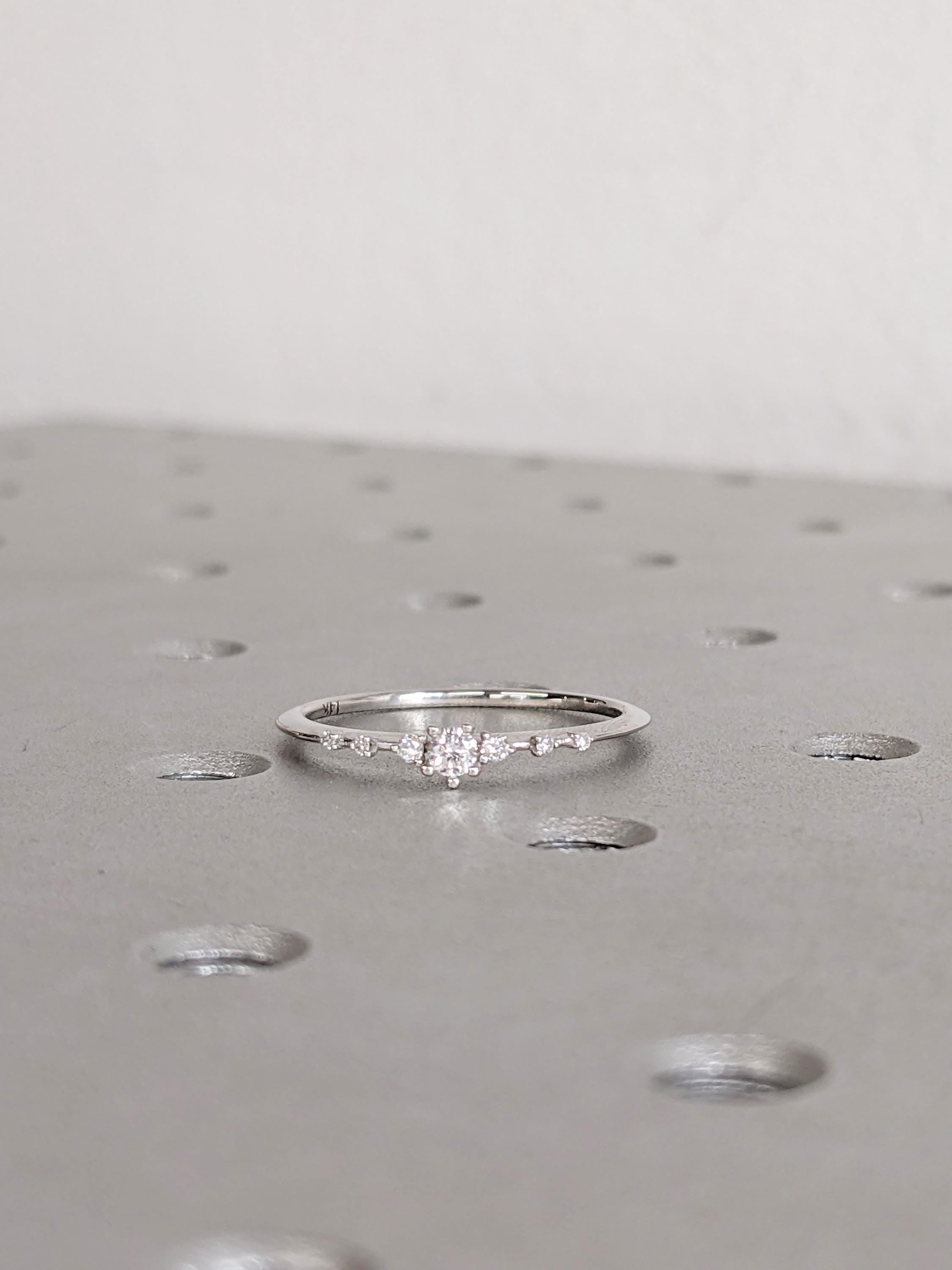 This engagement ring has a round prong-set main stone available in Diamond, Lab Grown Diamond, or Moissanite, paired with round prong-set side stones also offered in Diamond, Lab Grown Diamond, or Moissanite for a soft clustered glow. The clean, dainty design makes it a beautiful choice for an engagement ring, bridal wear, anniversary, or a meaningful everyday piece.