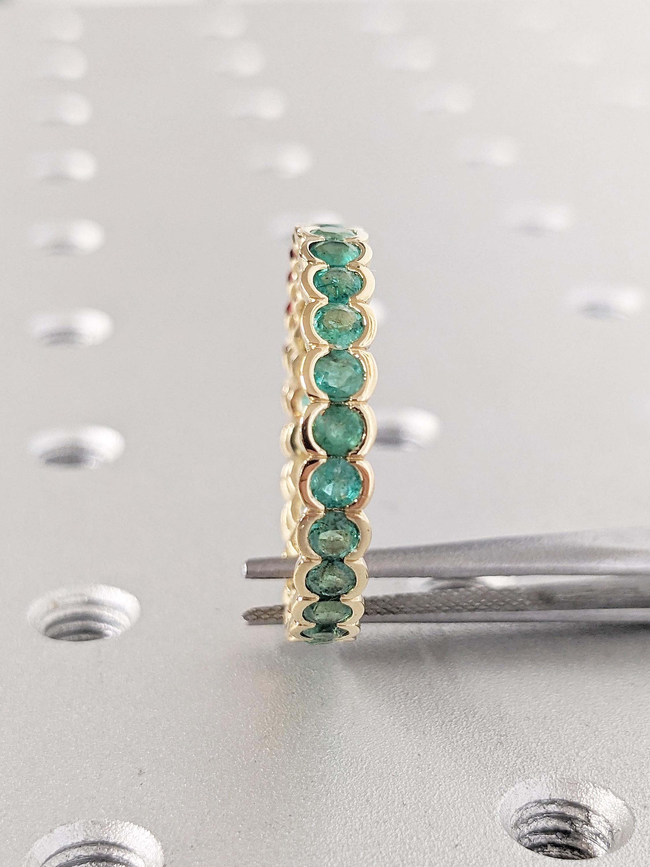 This exquisite Emerald eternity ring showcases a captivating row of round green emeralds, each securely nestled in a sleek bezel setting. Perfect as a wedding band, anniversary ring, or a timeless statement piece, this design blends durability with luxurious charm, making it a treasure to wear for a lifetime.