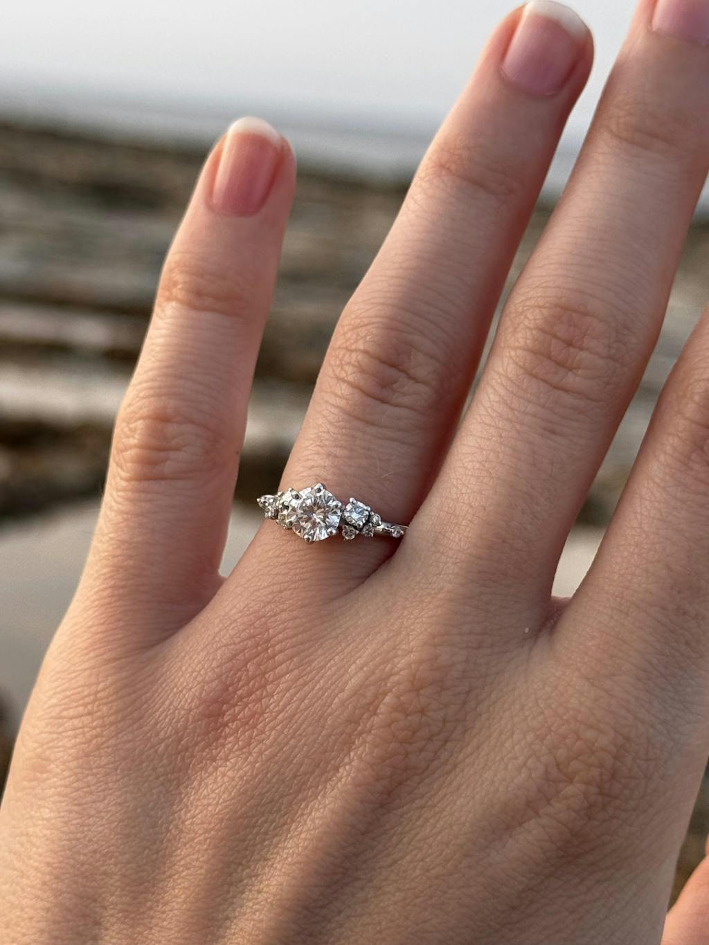 A beautiful round cut shaped lab grown diamond, set with a super delicate and thin setting, paved with a row of moissanites or diamonds from both sides, make this ring a true stunner!