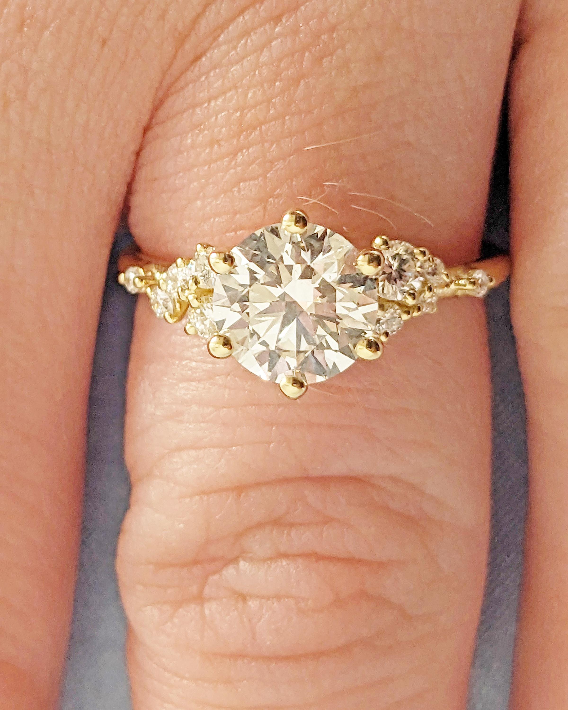 Celebrate the next chapter of your life with our round cut Lab Cultured Diamond engagement ring, set with a thin setting. Embraced by delicate snowdrift Diamonds or Moissanites cluster, sparkling like freshly fallen snow. This finely handcrafted ring is the perfect symbol of your forever love.