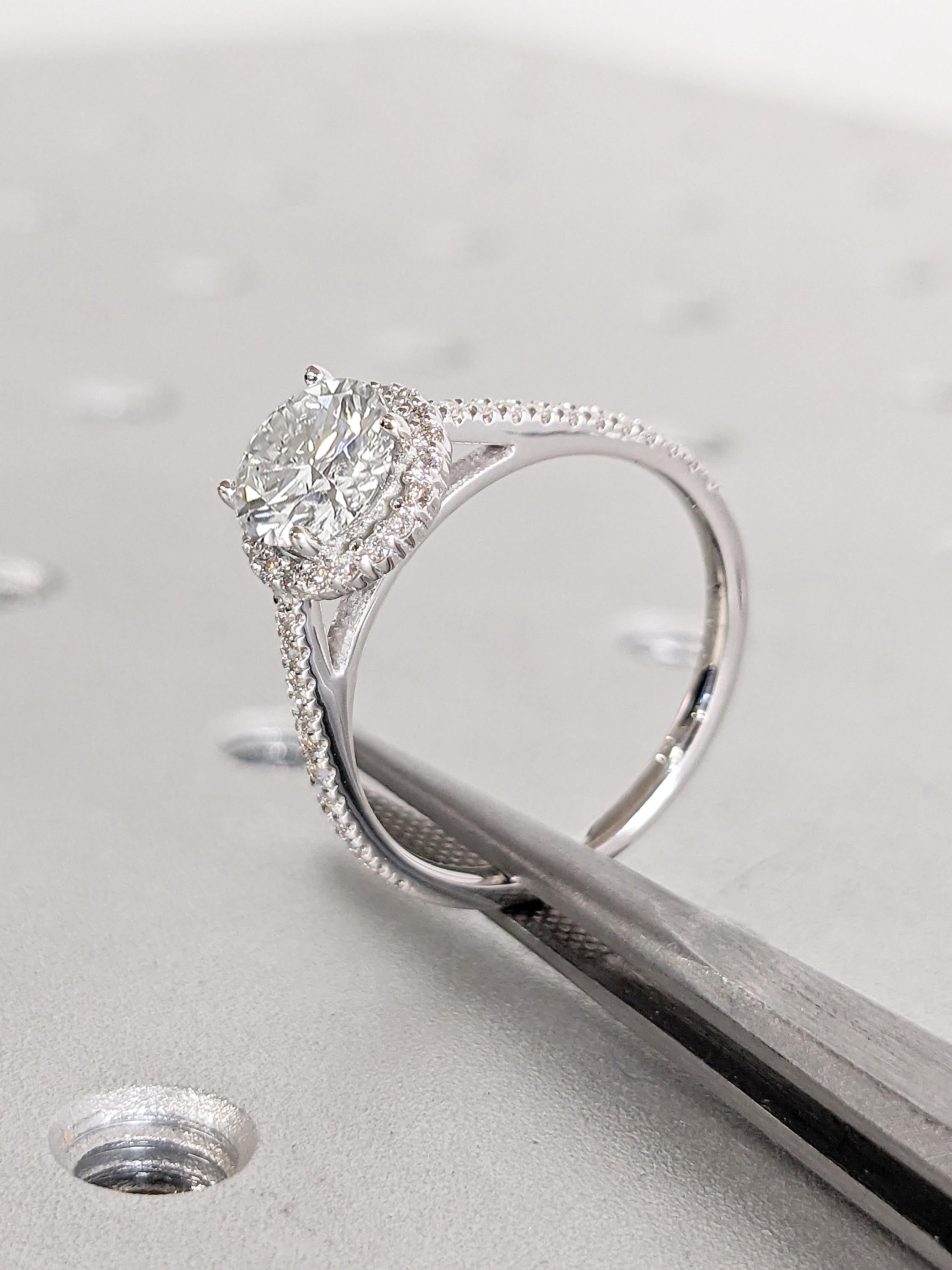 This elegant comfort-fit ring features a stunning center Lab Grown Diamond, encircled by a radiant halo of your choice of Natural Diamonds, Lab Grown Diamonds, or Moissanites. The half-eternity band, crafted in luxurious gold, is adorned with matching stones, offering brilliance from every angle. Expertly designed for comfort and style, it ensures a secure, graceful fit. A timeless blend of sophistication and sparkle, this ring is a beautiful choice for any special occasion.