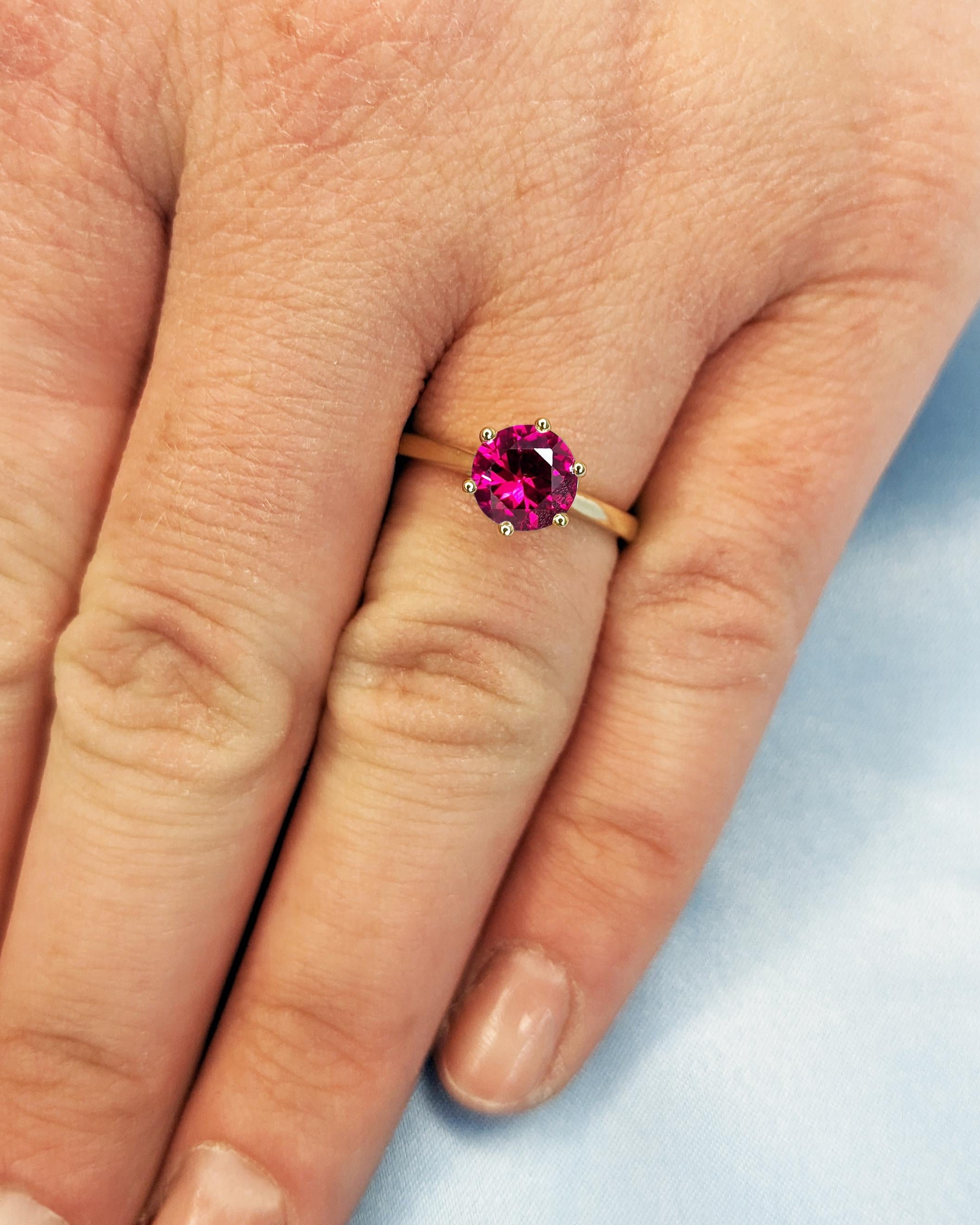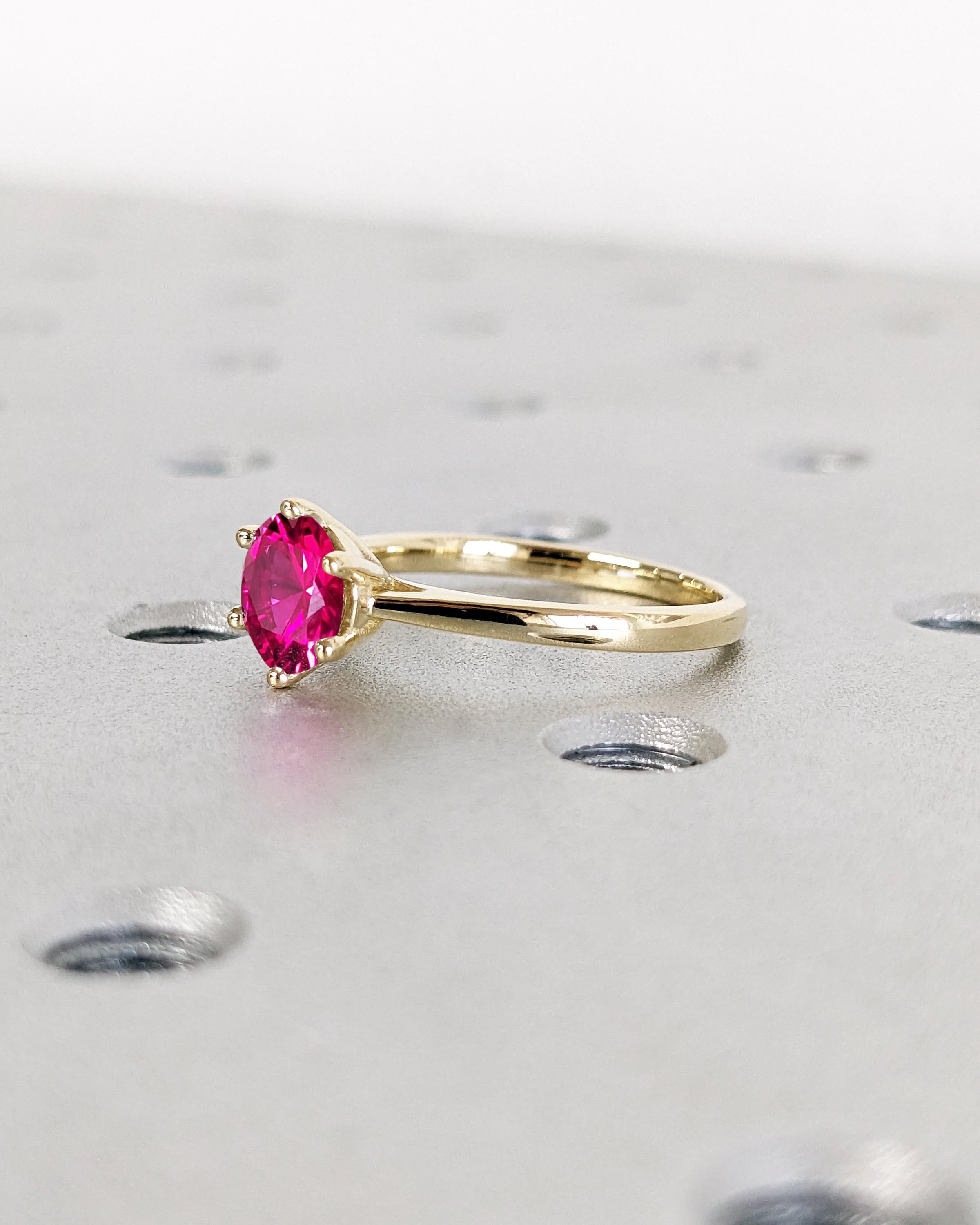 This sleek, minimalistic thin band, combined with its elevated high-profile setting, provides the perfect stage to showcase the center gemstone, a unique round cut Lab Ruby.