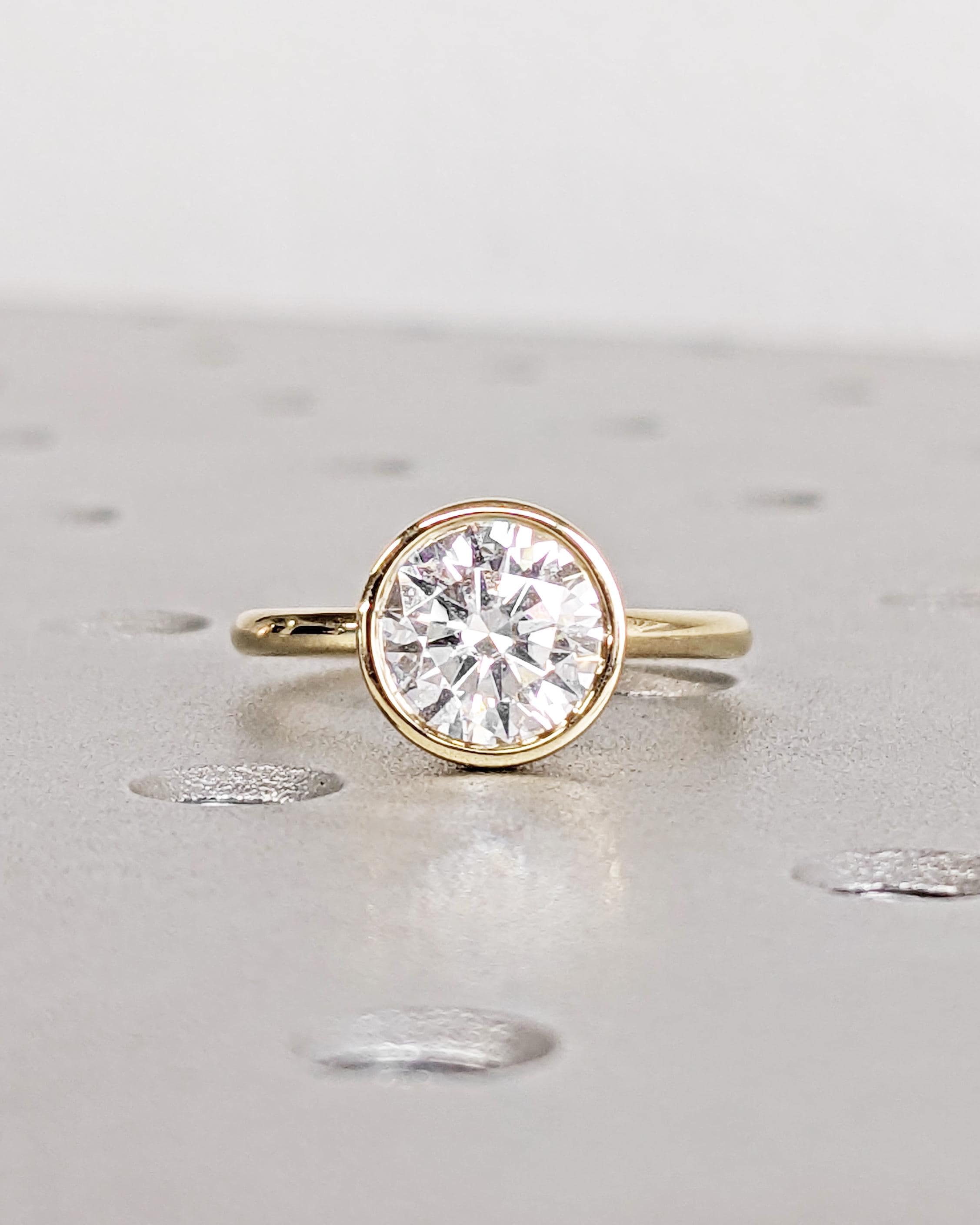 Our bezel set moissanite engagement ring brings together clean lines and delicate floral charm. The round cut center stone shines brightly above a tulip or lotus petal basket, adding a soft floral touch that makes the ring feel extra romantic. A timeless solitaire design, perfect for everyday elegance.