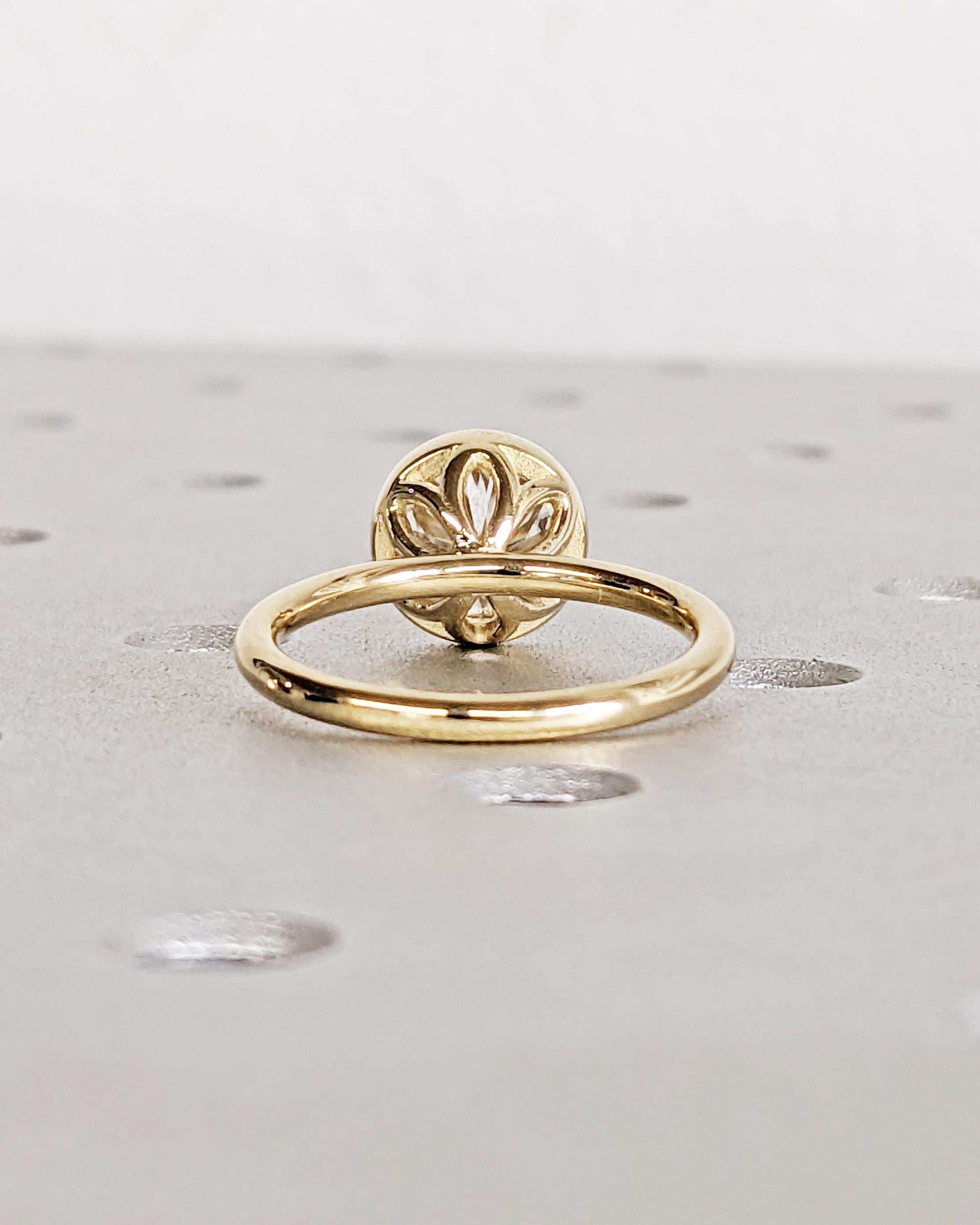 Round Moissanite Bezel Set Ring | Lotus Flower Promise Ring | Tulip Setting Petal Prongs | 14K Yellow Gold