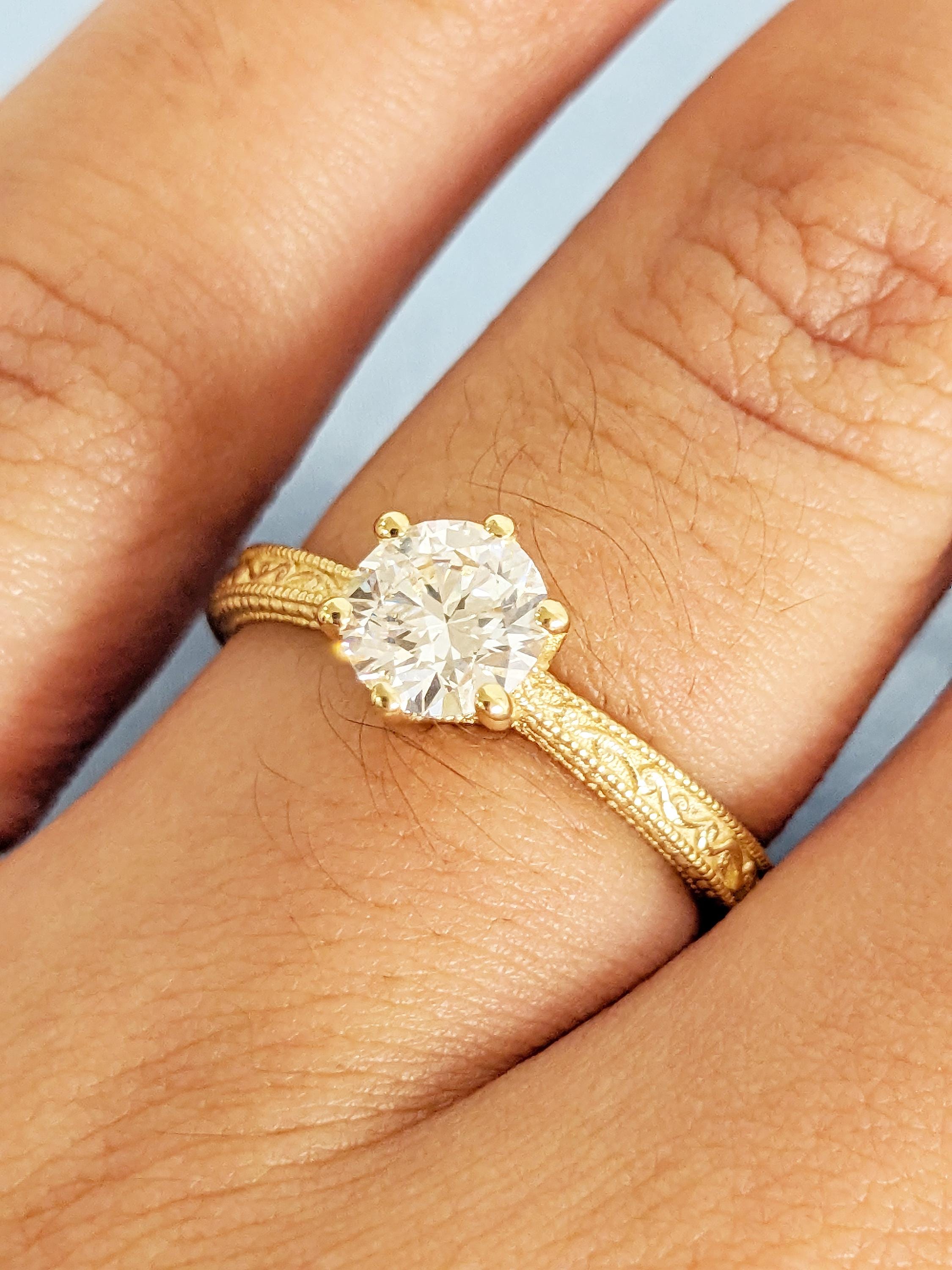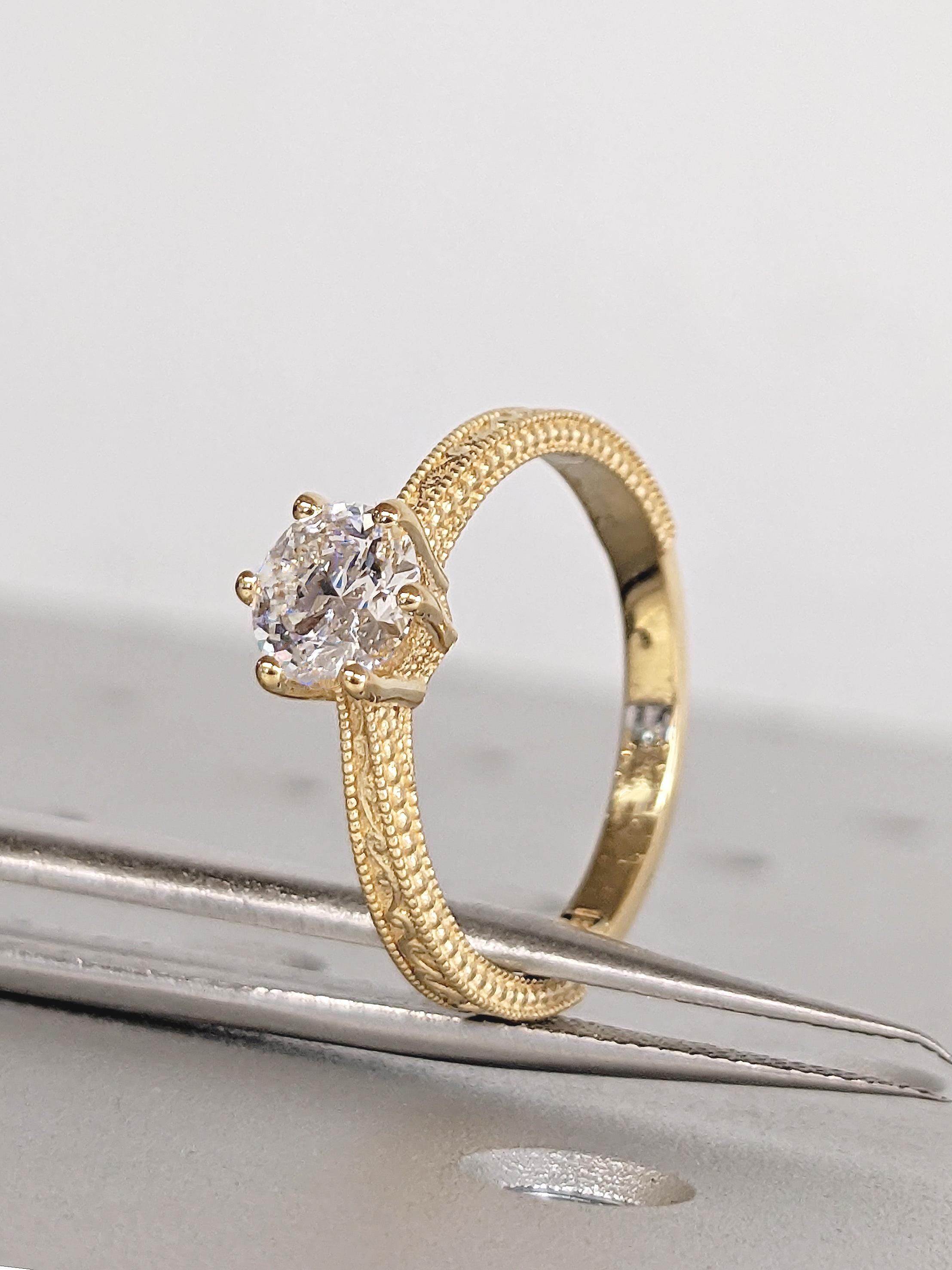This Moissanite engagement ring features a classic solitaire design with a round center stone. The gold band is enriched with delicate filigree patterns and refined milgrain detailing for a vintage-inspired look. It’s a stunning blend of modern brilliance and timeless craftsmanship.