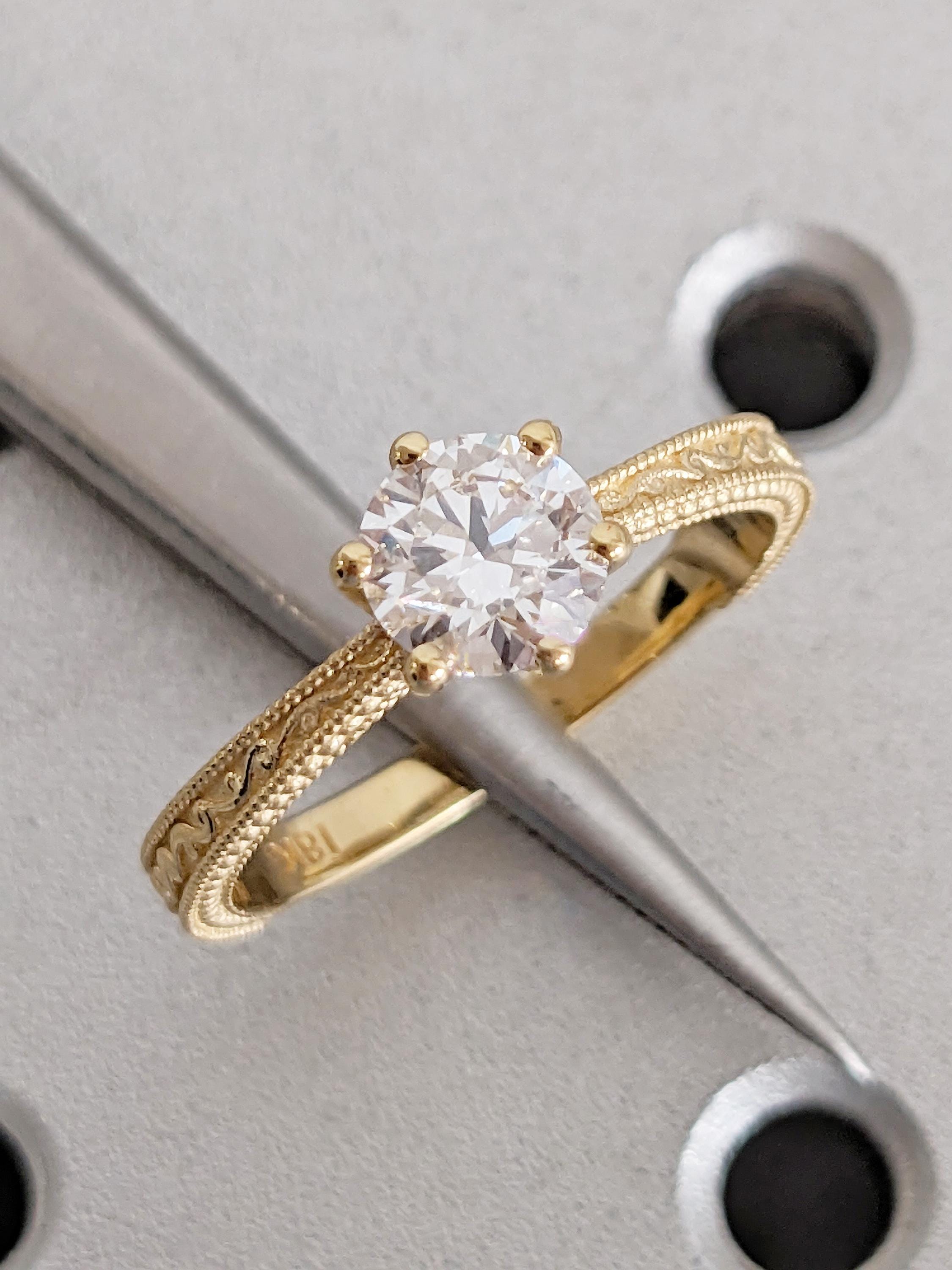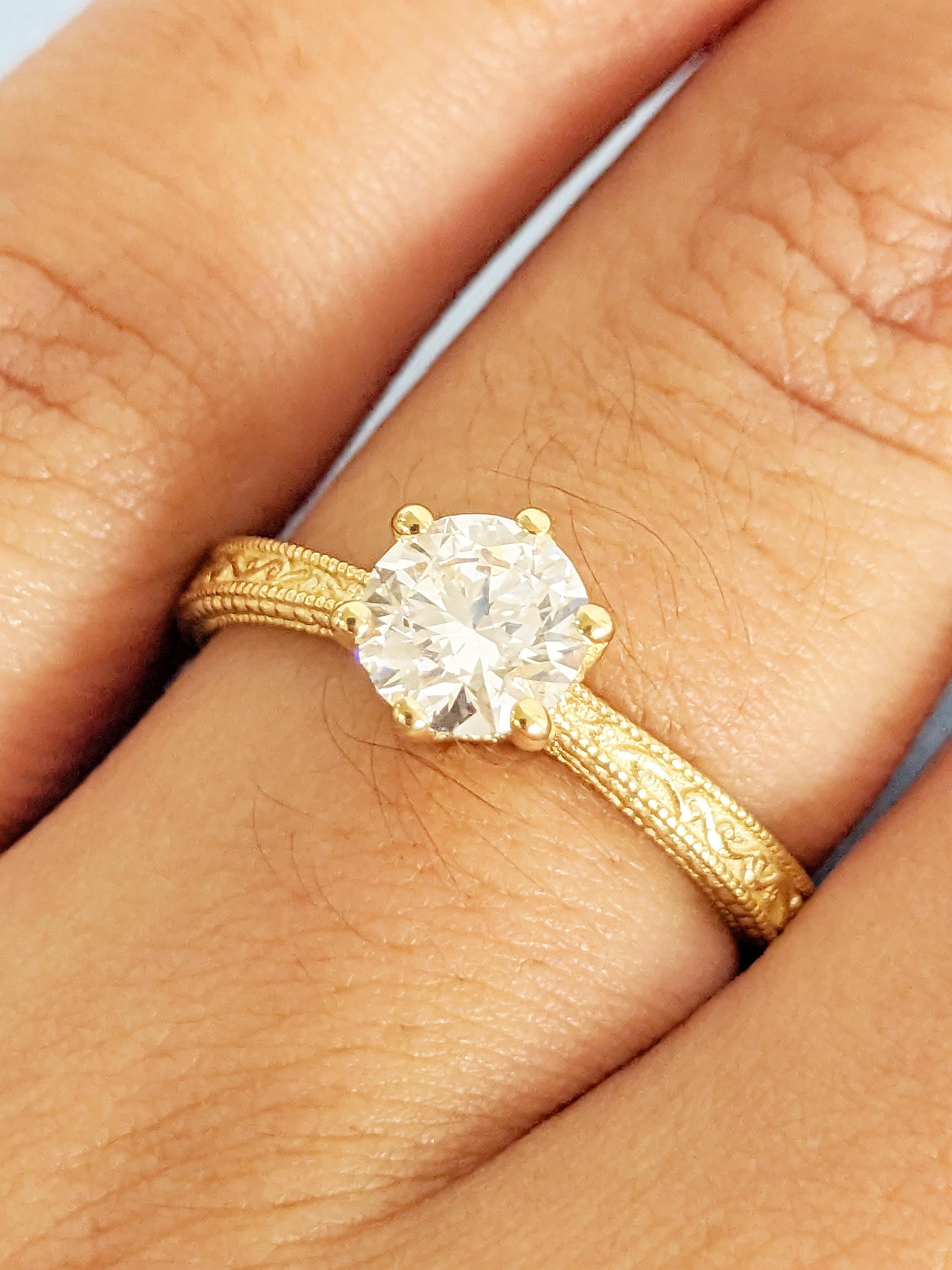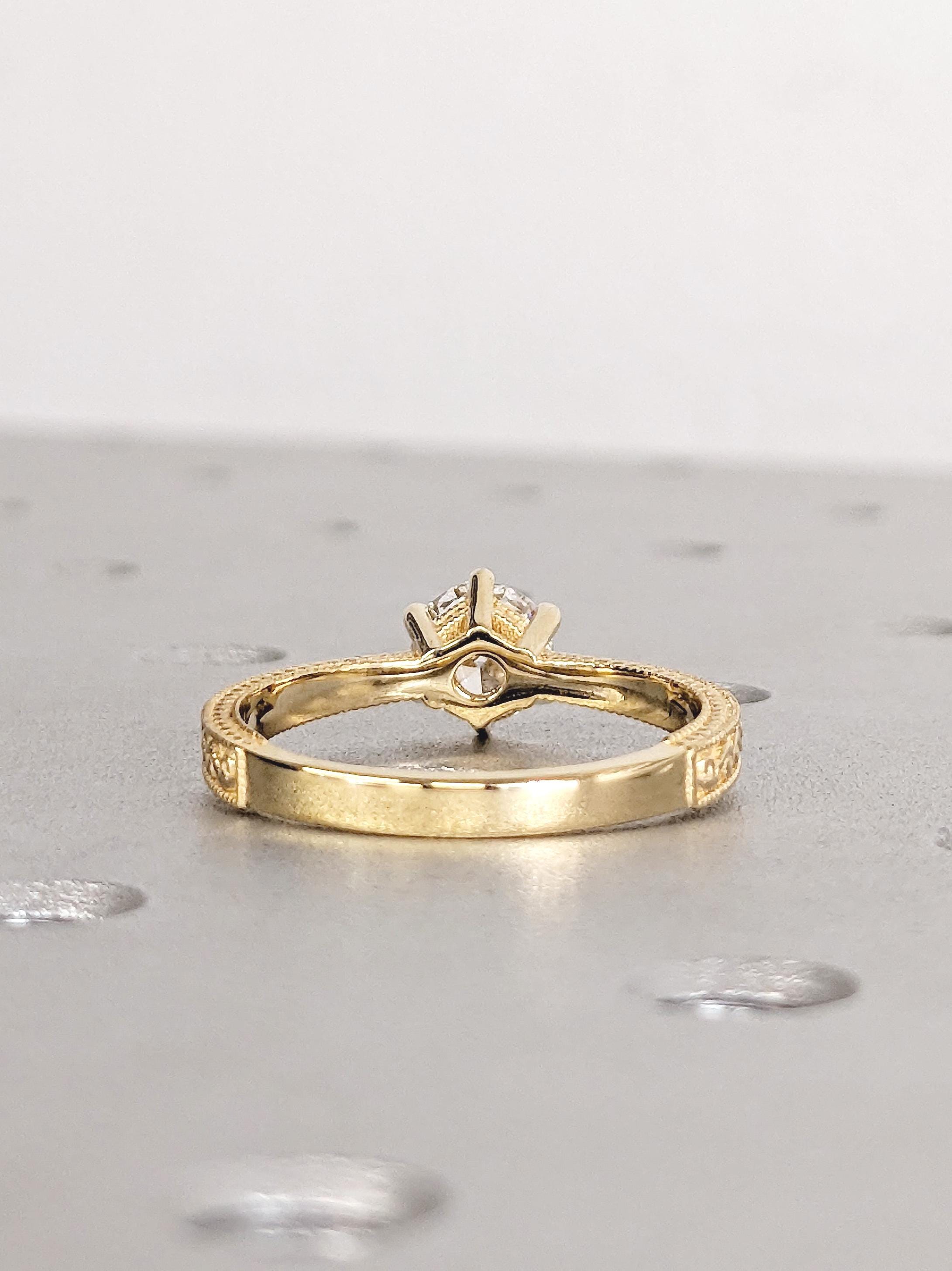 Round Moissanite Engagement Ring, Milgrain 18k Yellow Gold Solitaire Ring, Filigree Design