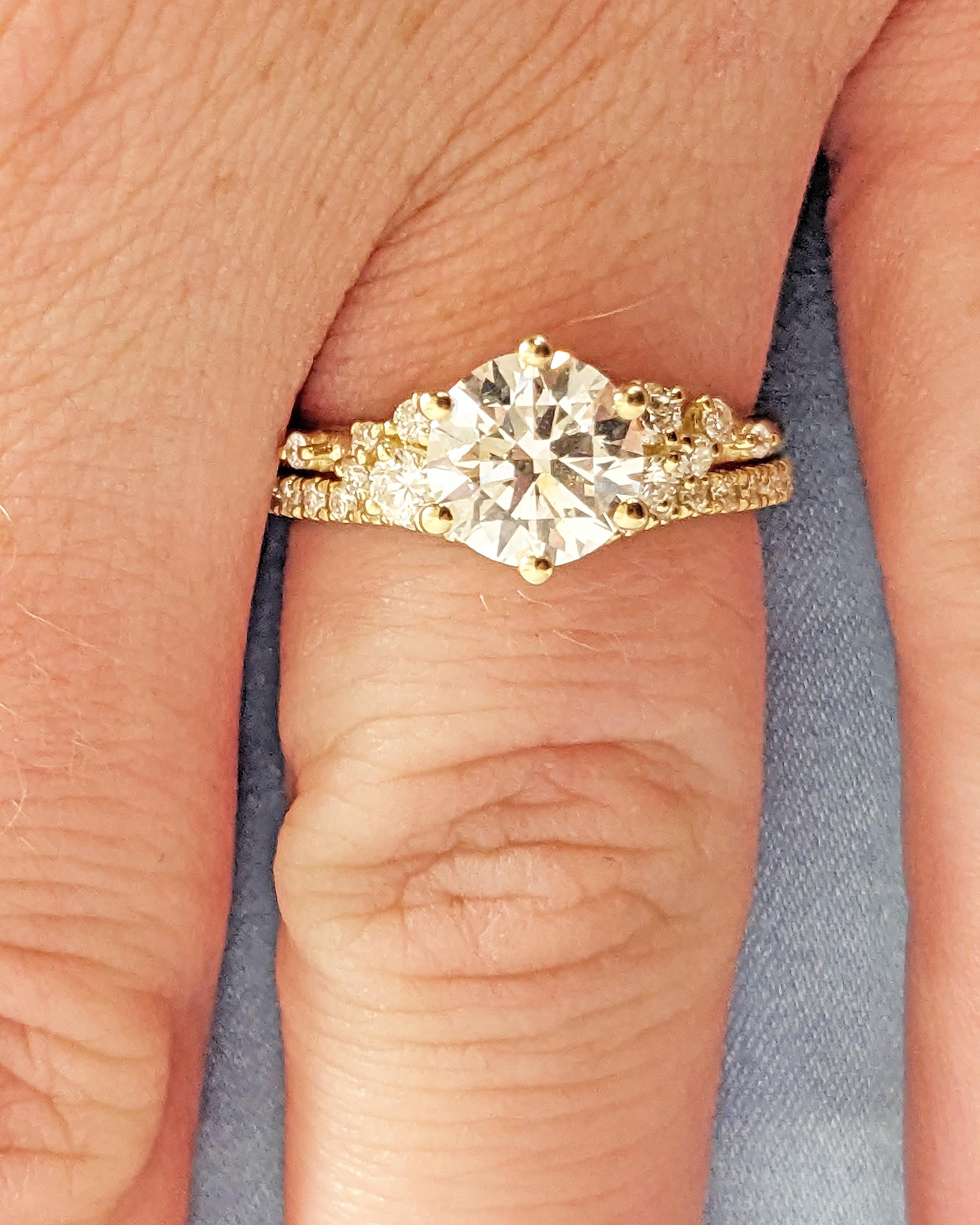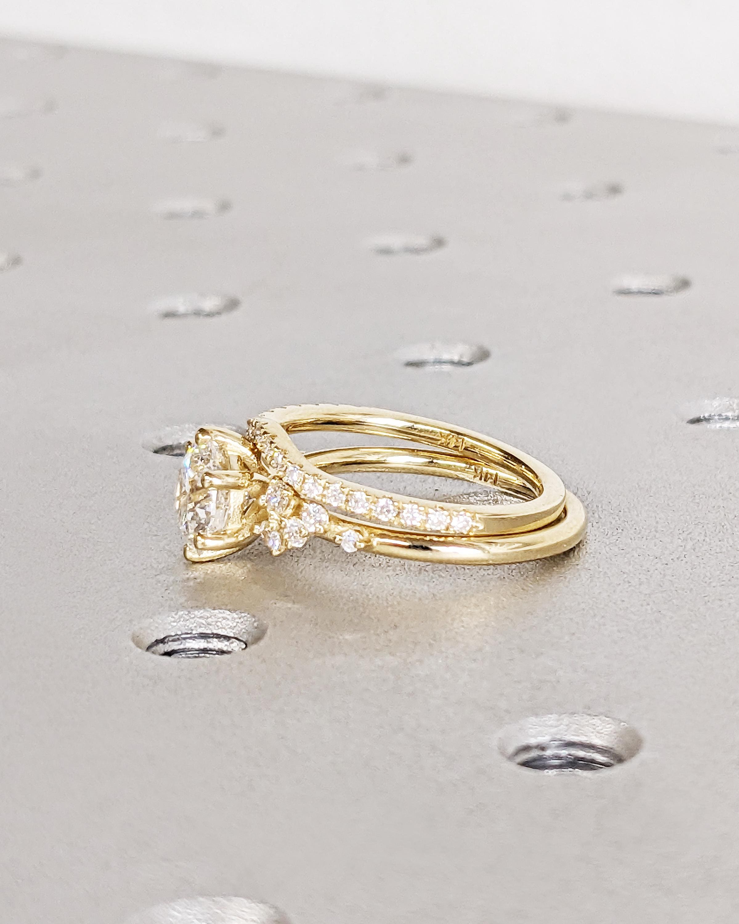 Celebrate the next chapter of your life with our elegantly designed snowdrift-inspired bridal ring set. The engagement ring showcases a classic round cut Moissanite center stone and a delicate setting, adorned by a cluster of exquisite Moissanites that glisten like freshly fallen snow. Choose the engagement ring alone, or pair it with the curved half-eternity pavé Moissanite wedding band for a complete two-piece set.