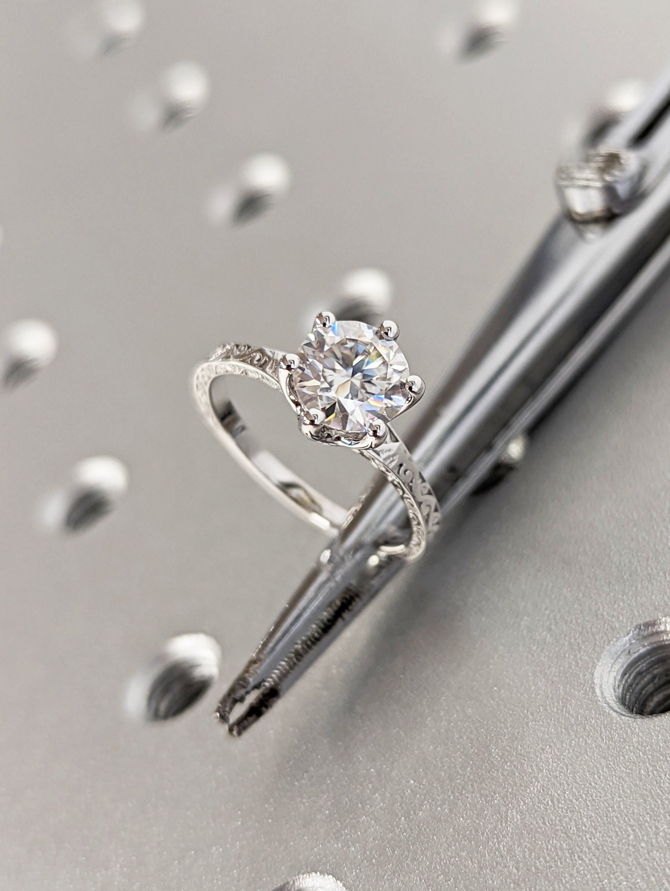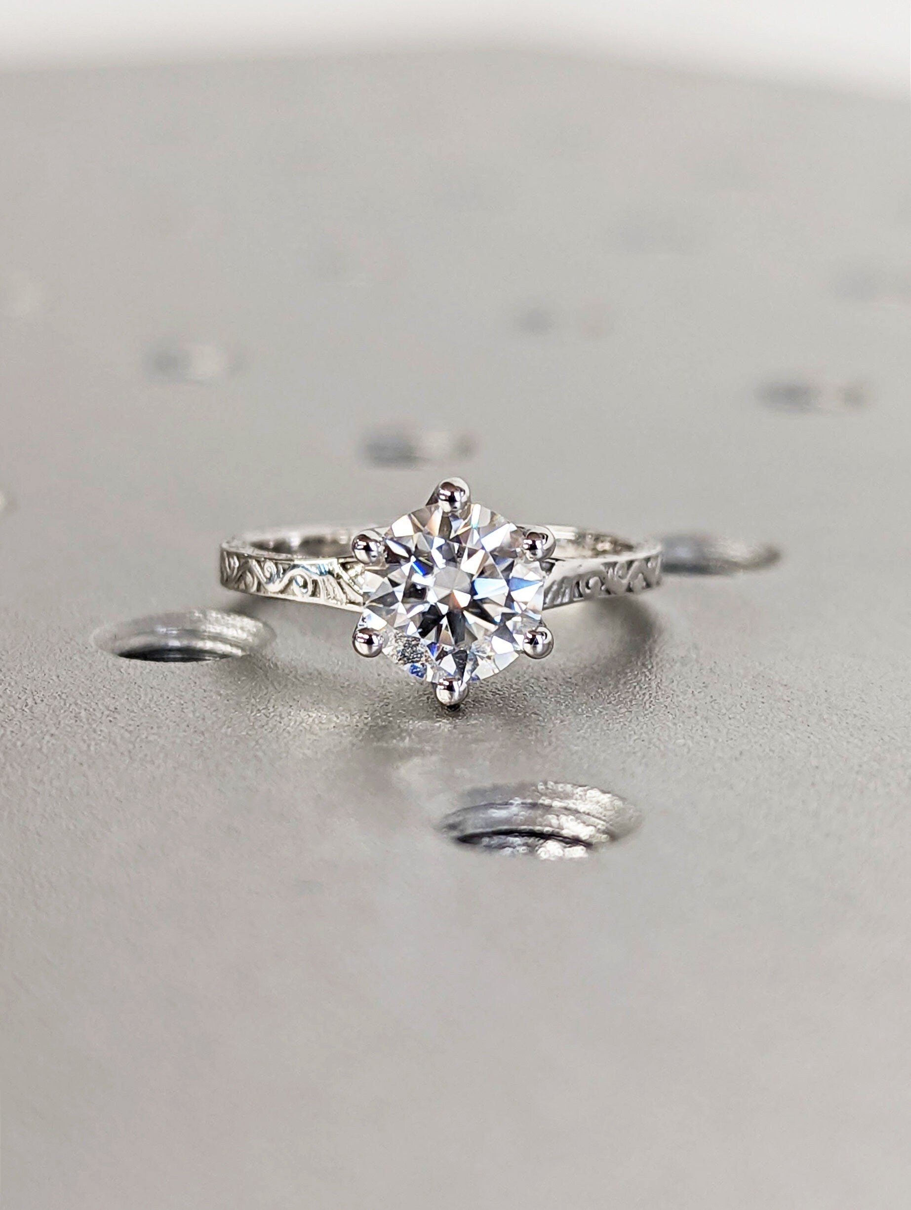 Round Moissanite engagement ring vintage unique white gold engagement ring women wedding Bridal art deco Anniversary milgrain engraved band