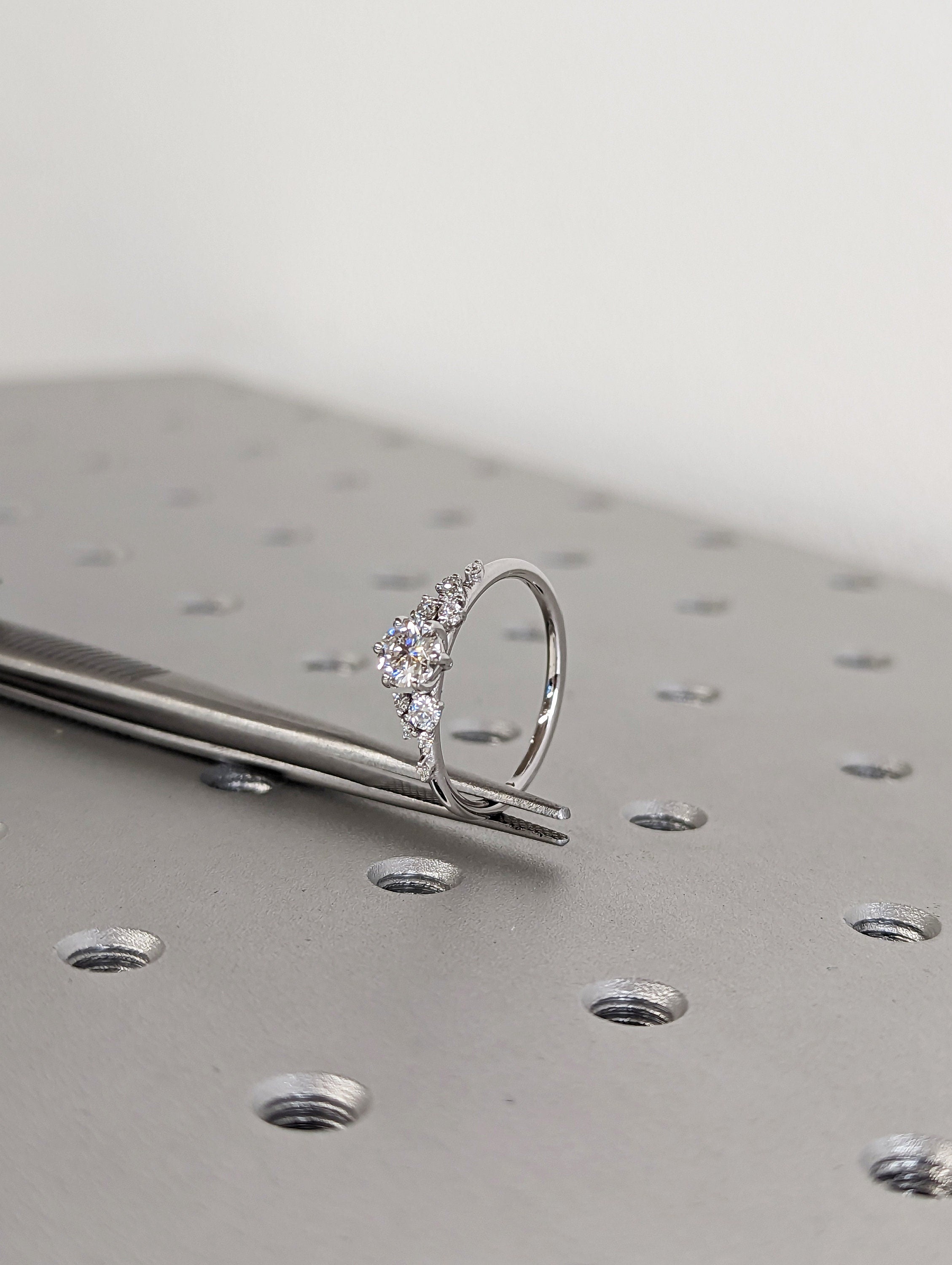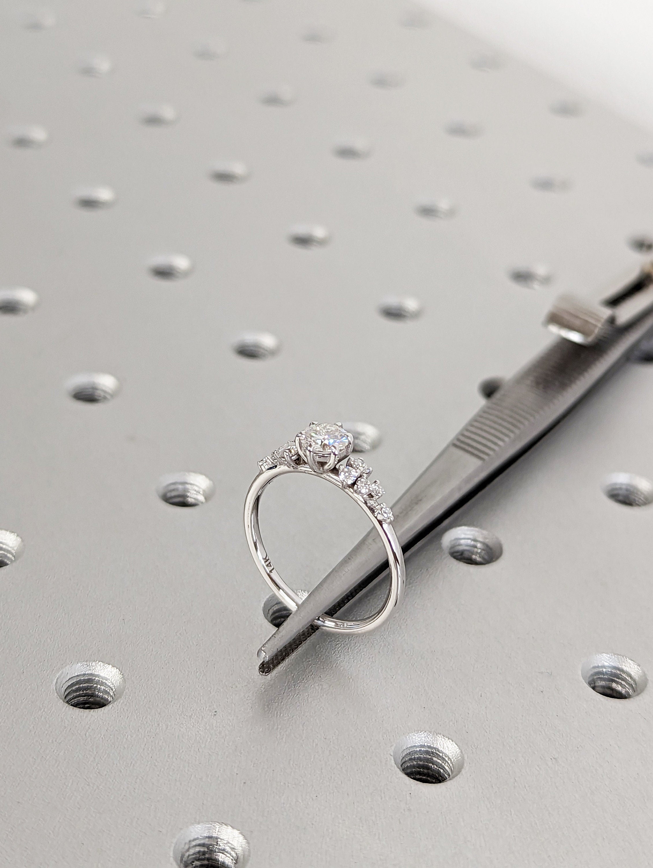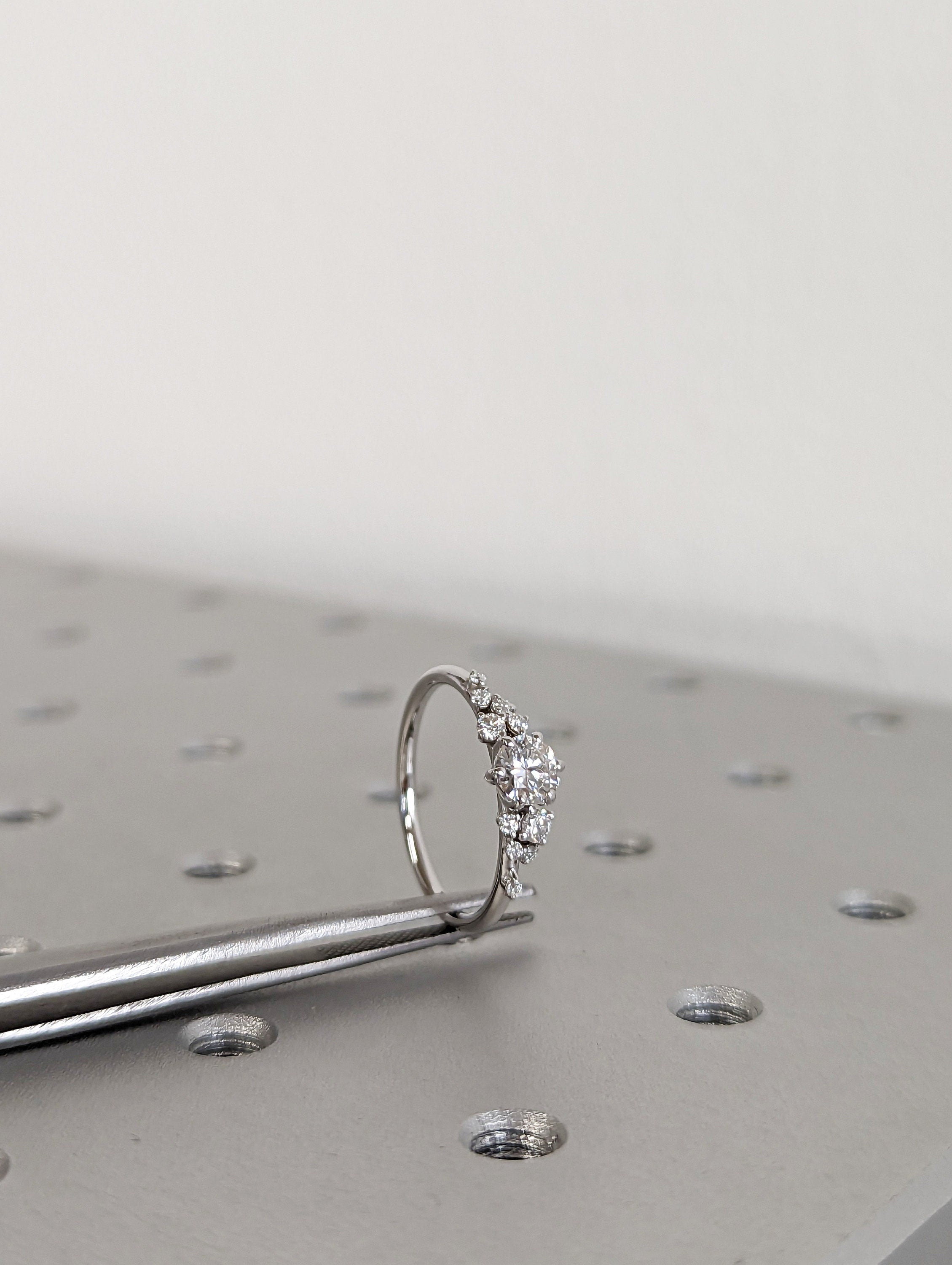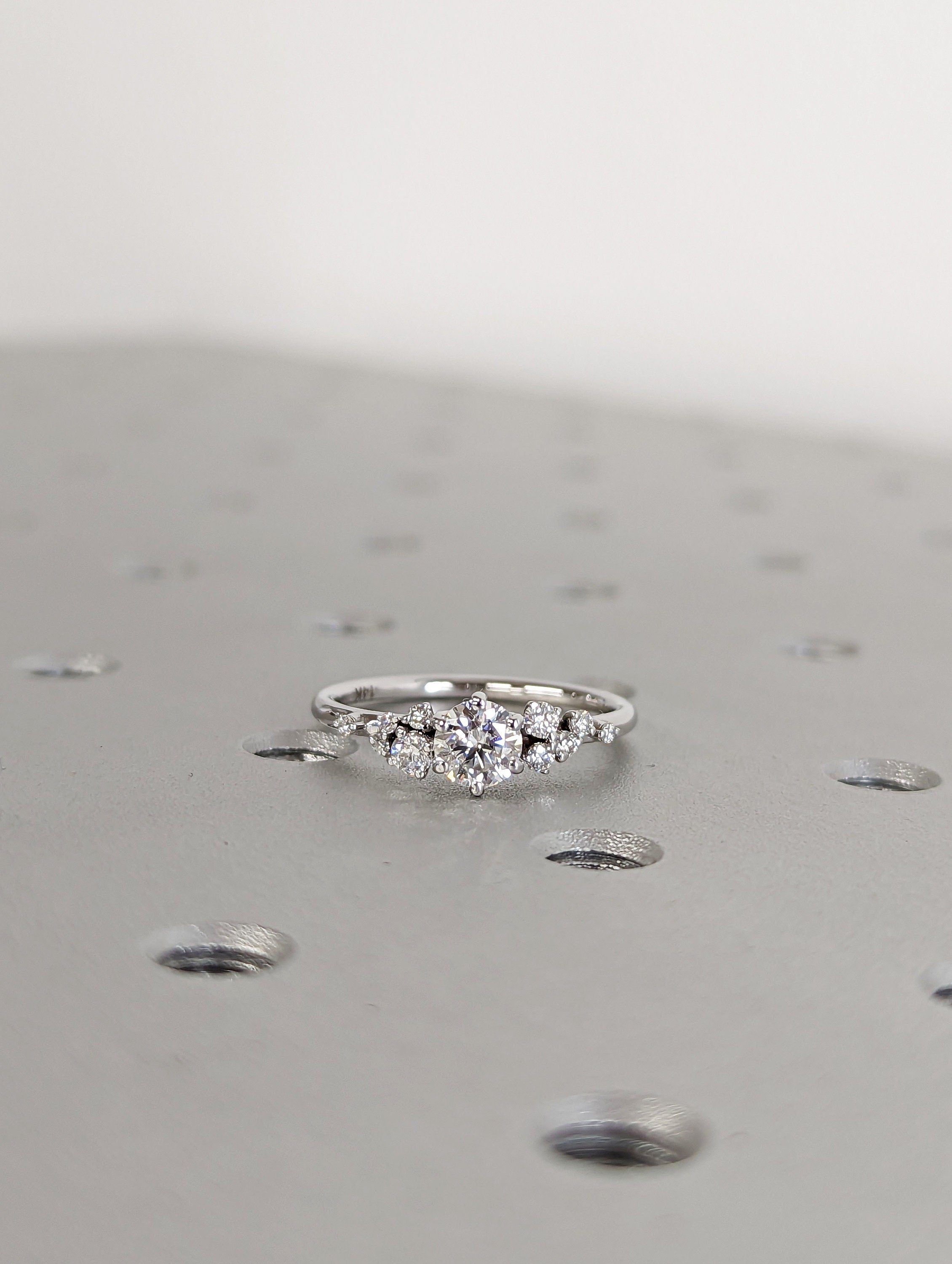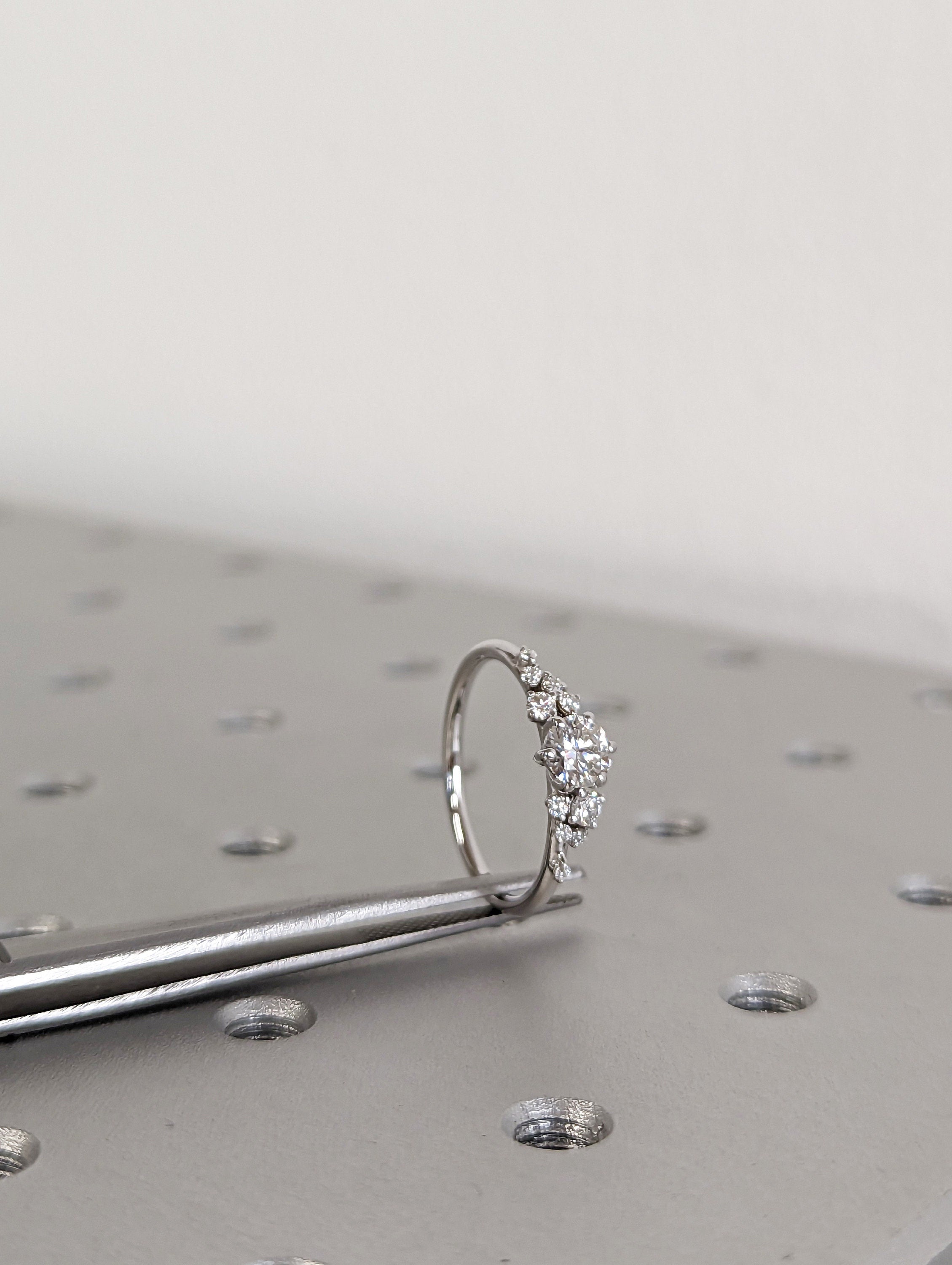 A beautiful round cut shaped moissanite, set with a super delicate and thin setting, paved with a row of moissanites or diamonds from both sides, make this ring a true stunner!