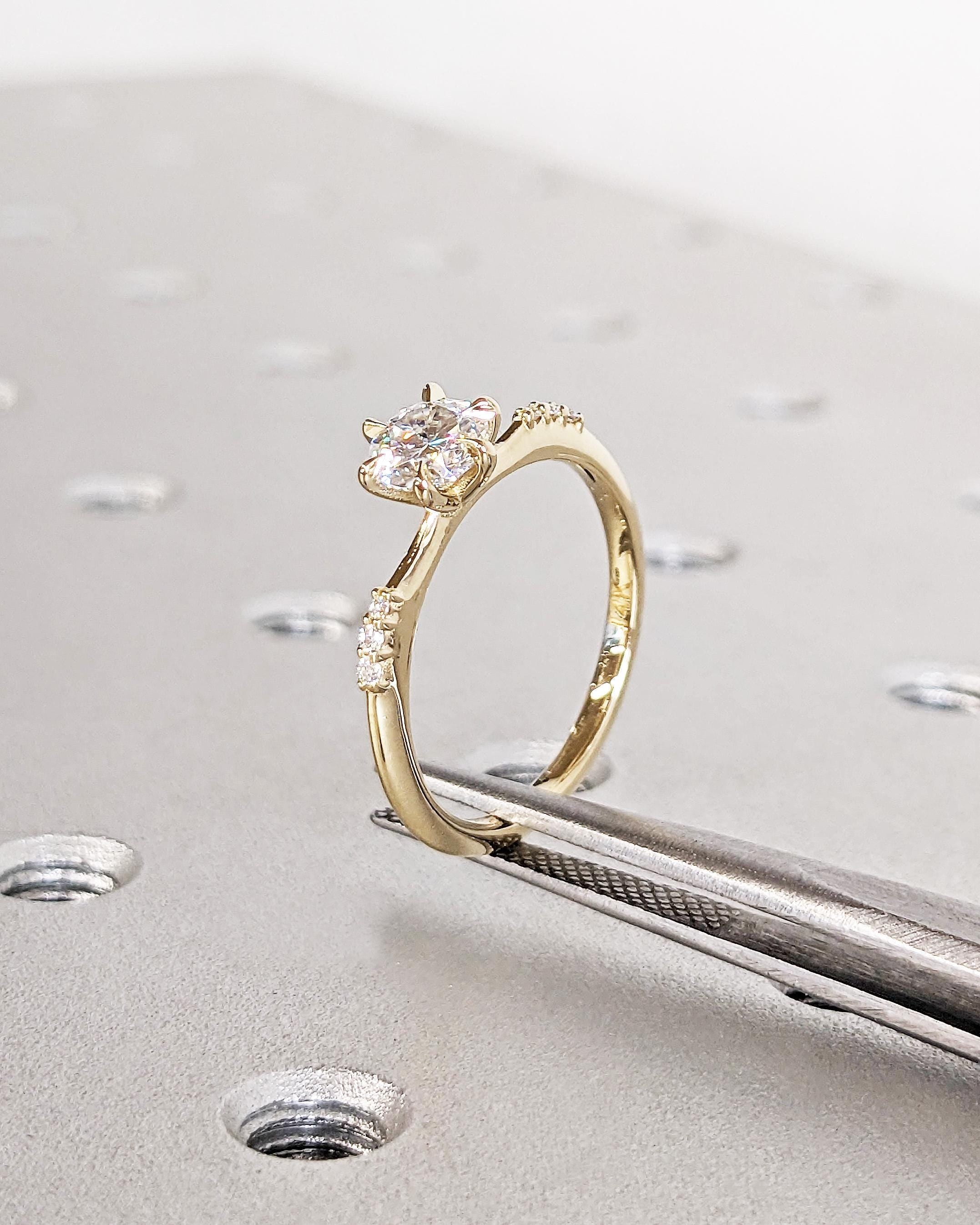 Minimalist yet full of character, this round-cut engagement ring is both simple and intricate. Its six-prong setting offers security and elegance, while three side stones on each side bring extra sparkle and symmetry. Choose from natural diamonds, lab diamonds, or moissanites to personalize your side stones. The dainty 1.7mm band allows the stones to shine while providing a comfortable, lightweight fit. A stunning option for those who love clean, refined designs with a touch of detail.
