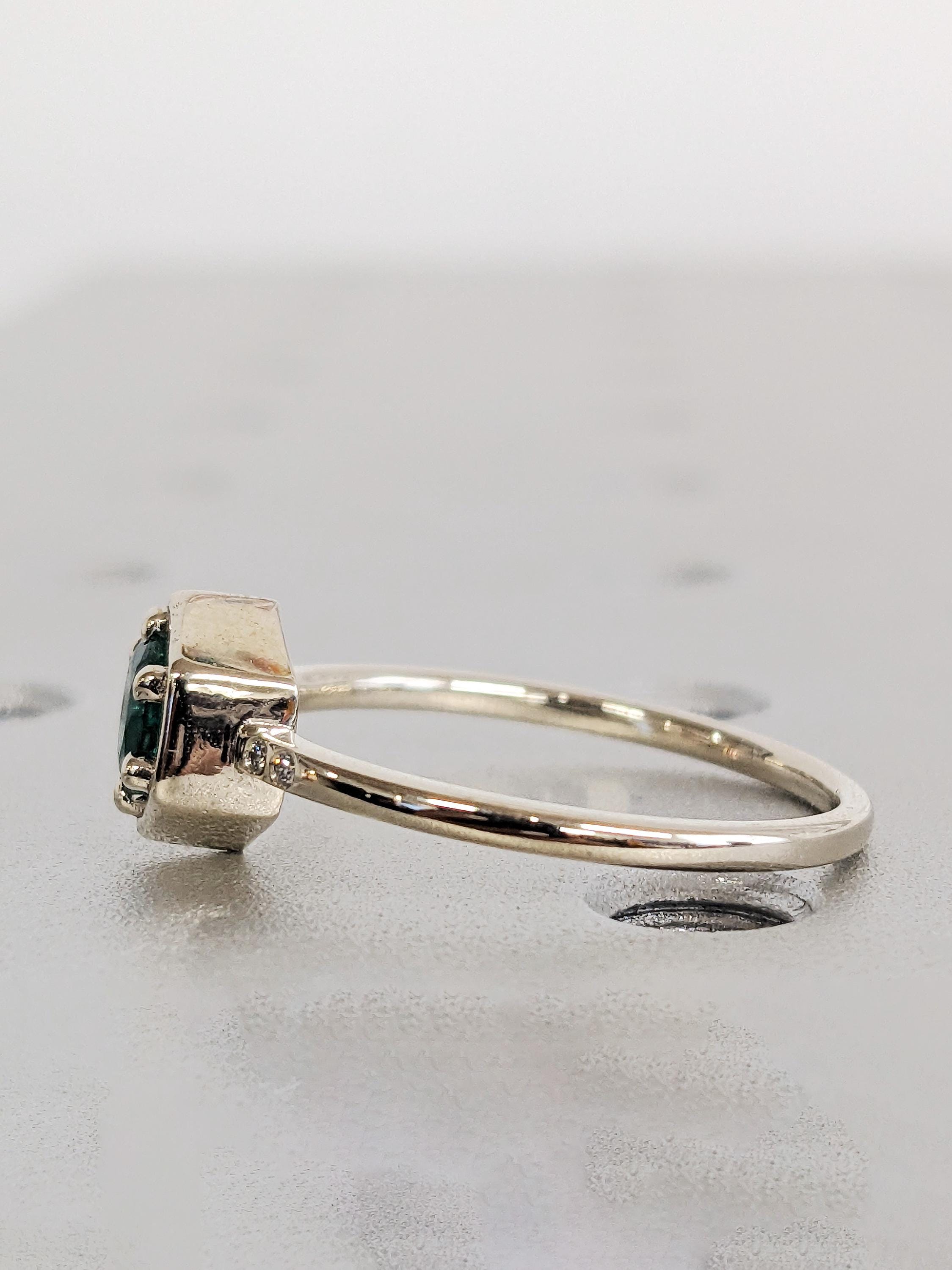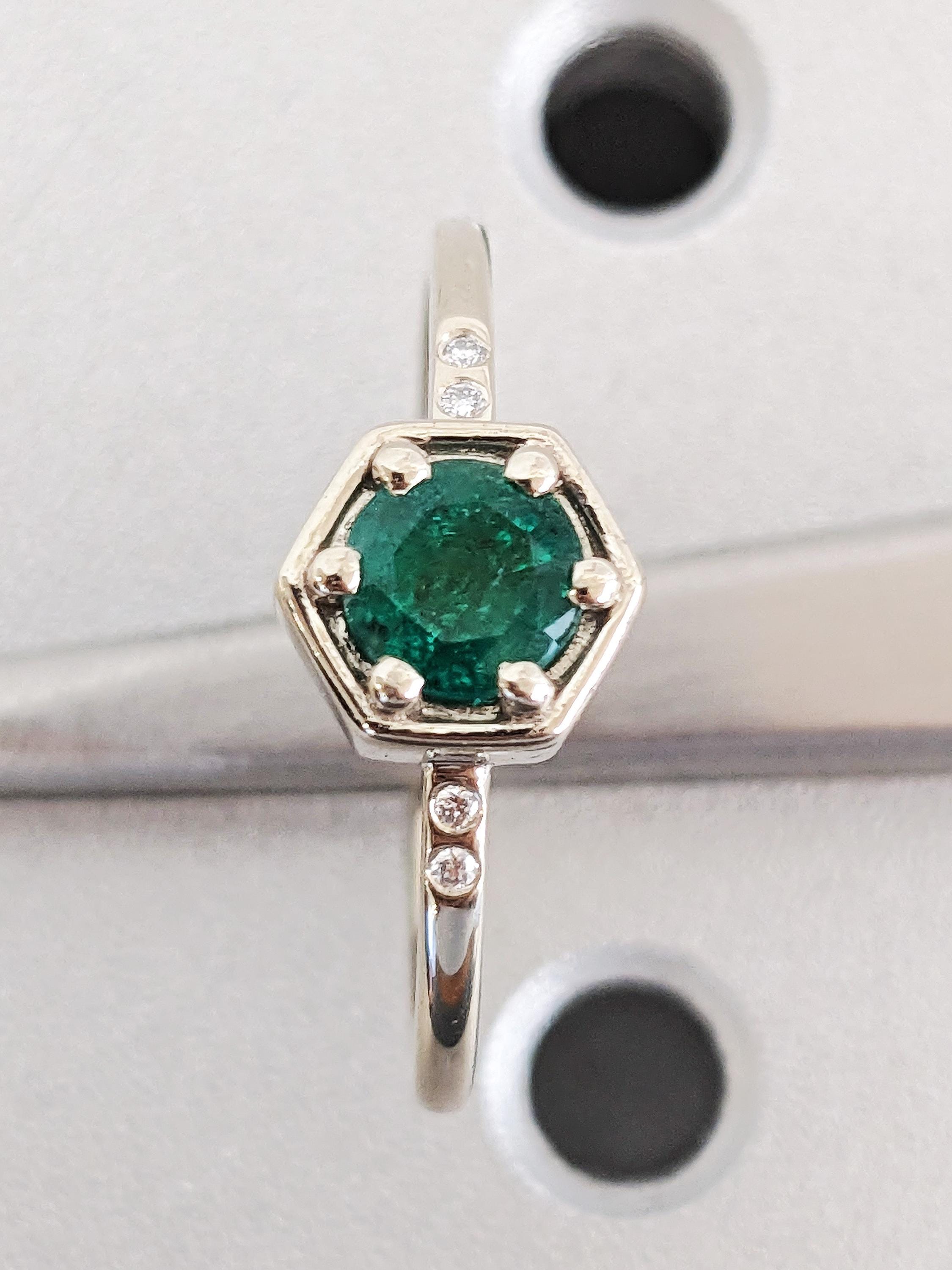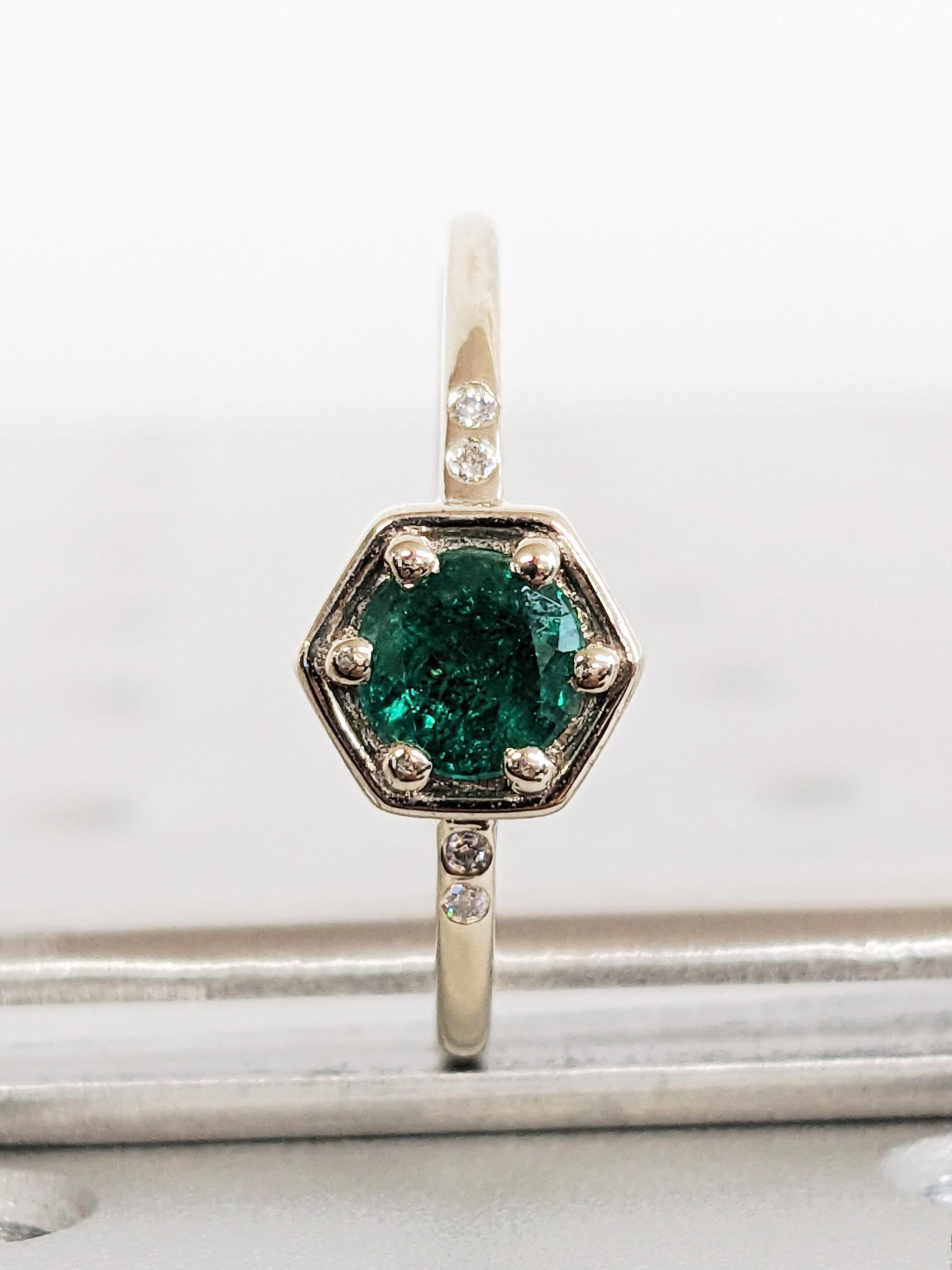 Round Natural Emerald Engagement Ring, Thin 14K Solid White Gold Band, Diamond Bezel Wedding Anniversary Ring, Green Emerald Promise Ring