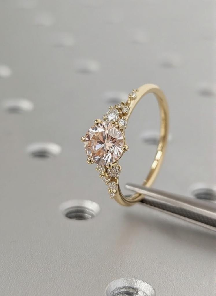 Celebrate the next chapter of your life with our romantic round cut Lab Morganite ring, set with a six prong setting. Embraced by delicate snowdrift Natural Diamonds, Lab Grown Diamonds or Moissanites cluster, sparkling like freshly fallen snow. This finely handcrafted ring is the perfect symbol of your eternal love.
