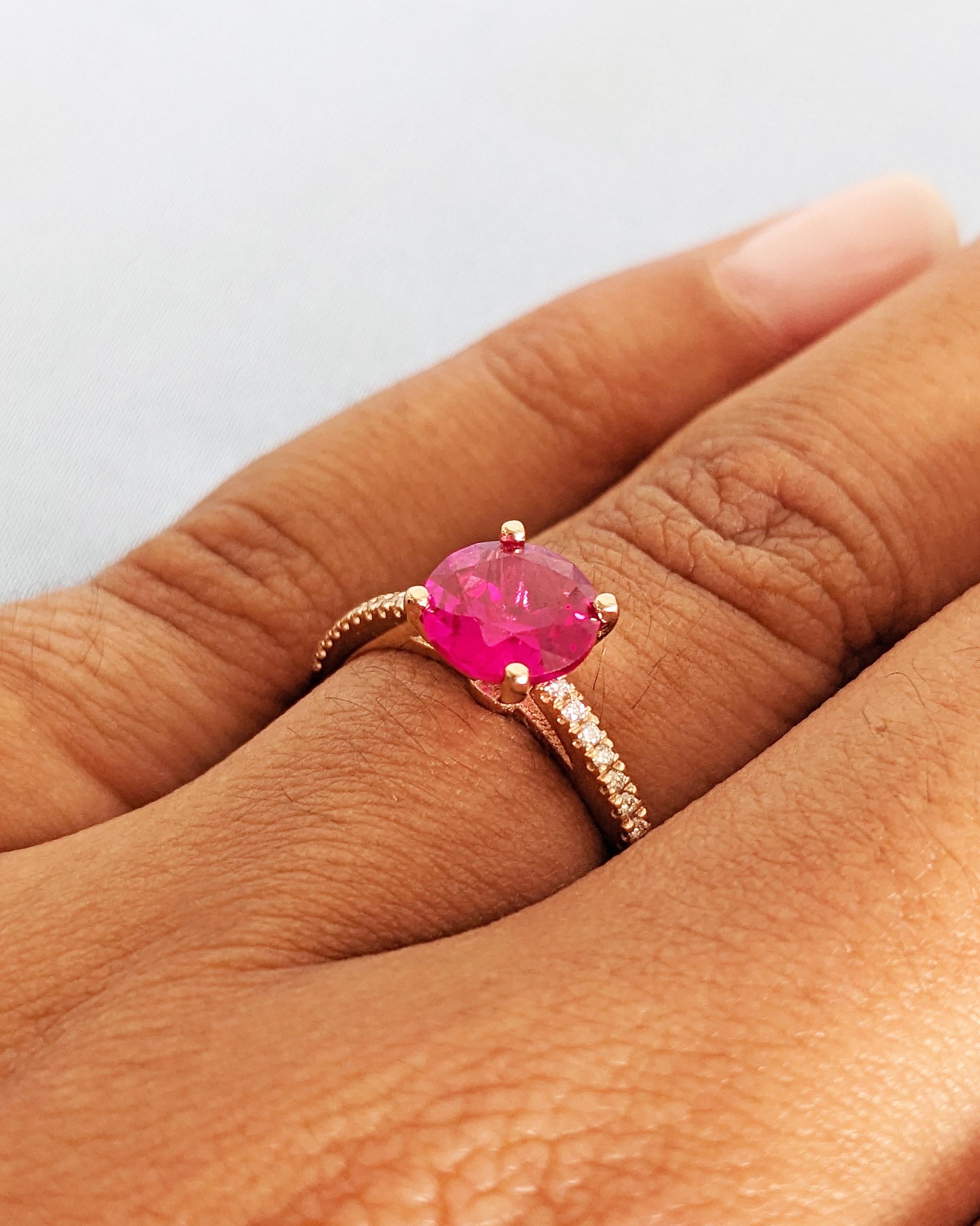 Round Ruby Ring: 14K Rose Gold, Lab Ruby, Half Eternity Pavé Moissanites, Dainty Promise Ring