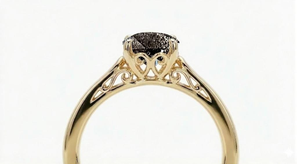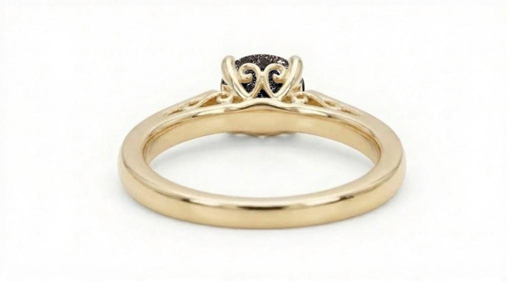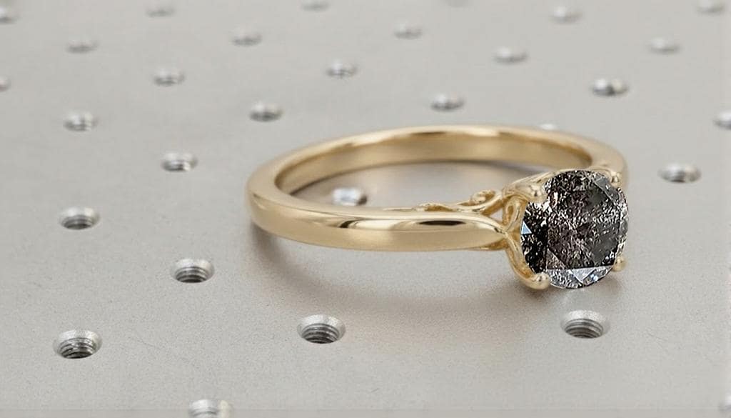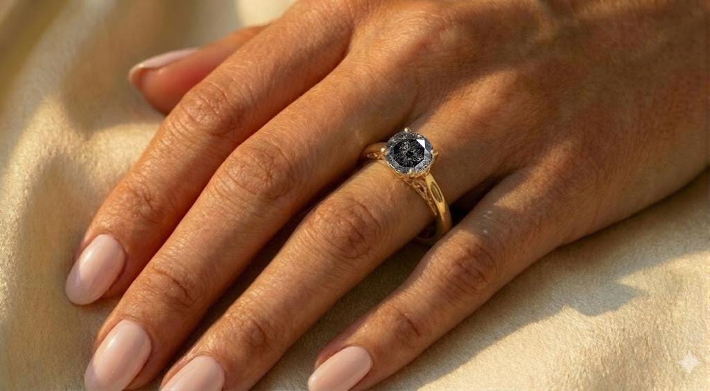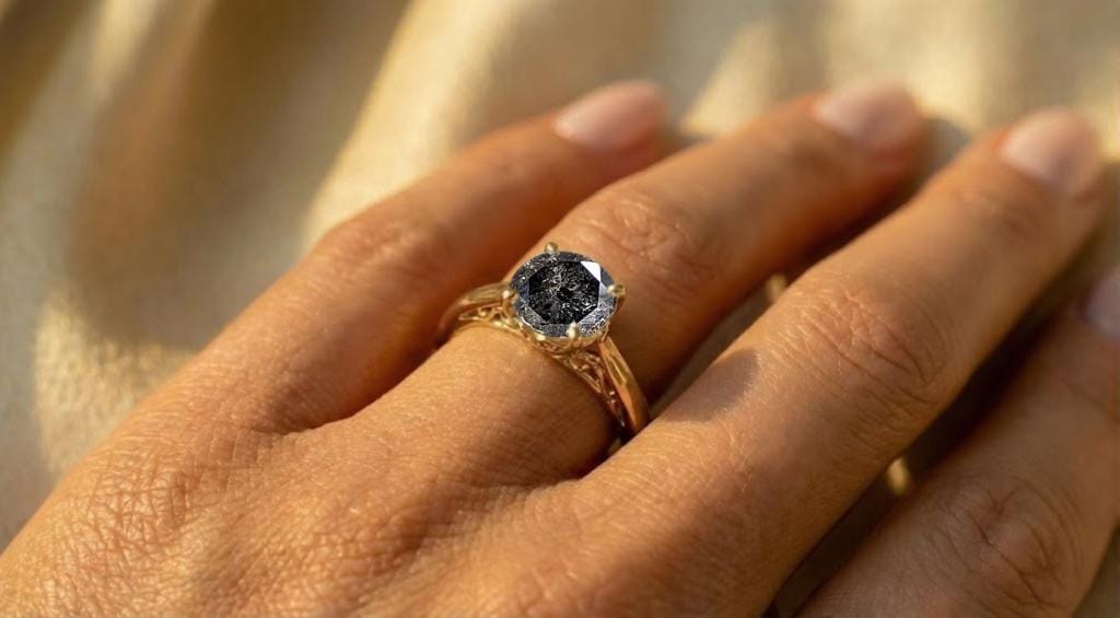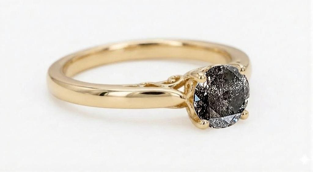 This round salt and pepper diamond engagement ring showcases a unique center stone framed by intricate filigree detailing beneath the setting. The handcrafted scrollwork adds a romantic, vintage-inspired touch that elevates its overall charm. Paired with a slender 1.8mm–2mm gold band, it offers a delicate yet refined look. A perfect choice for anyone who loves understated elegance with a hint of artistic flair.