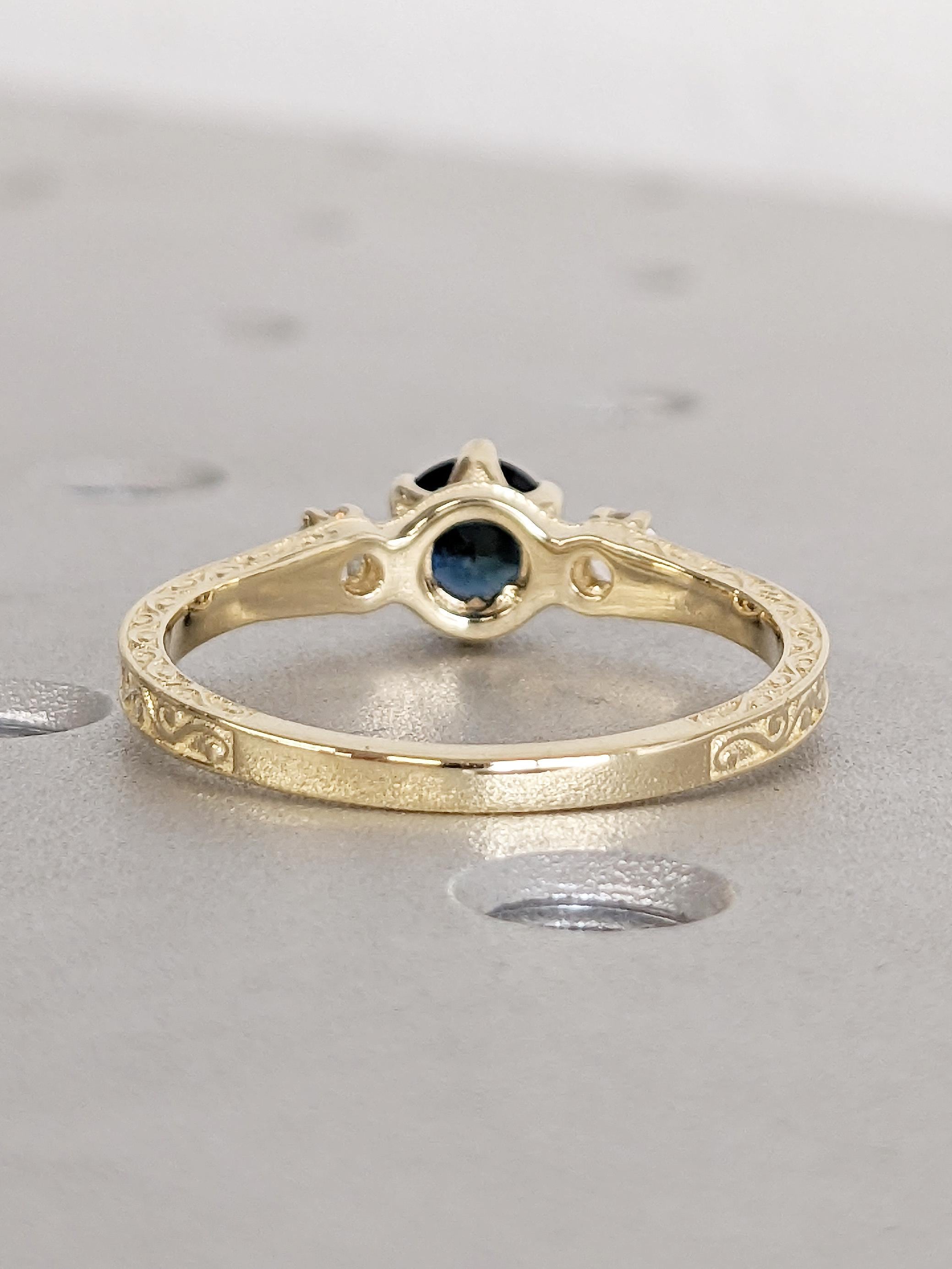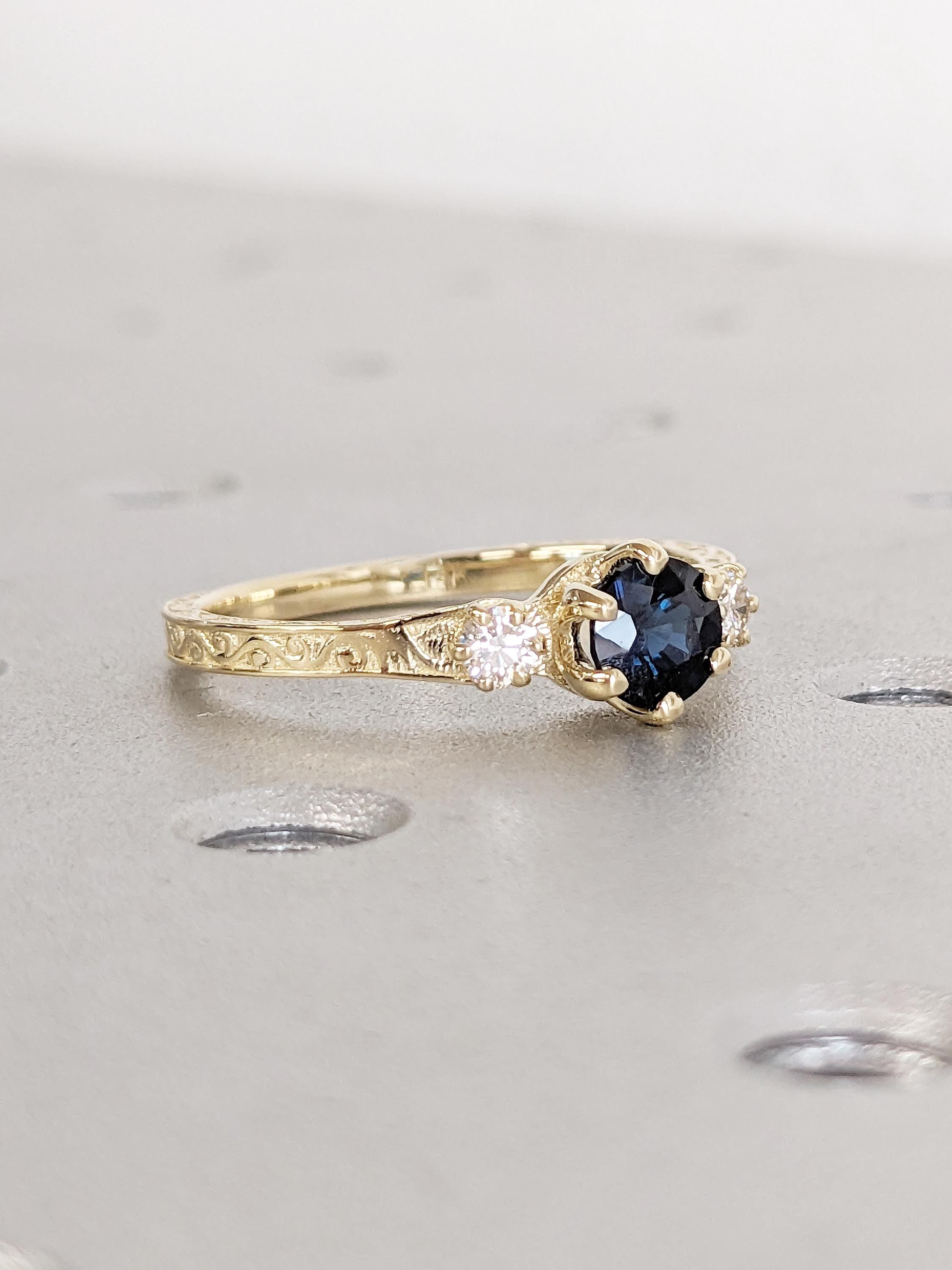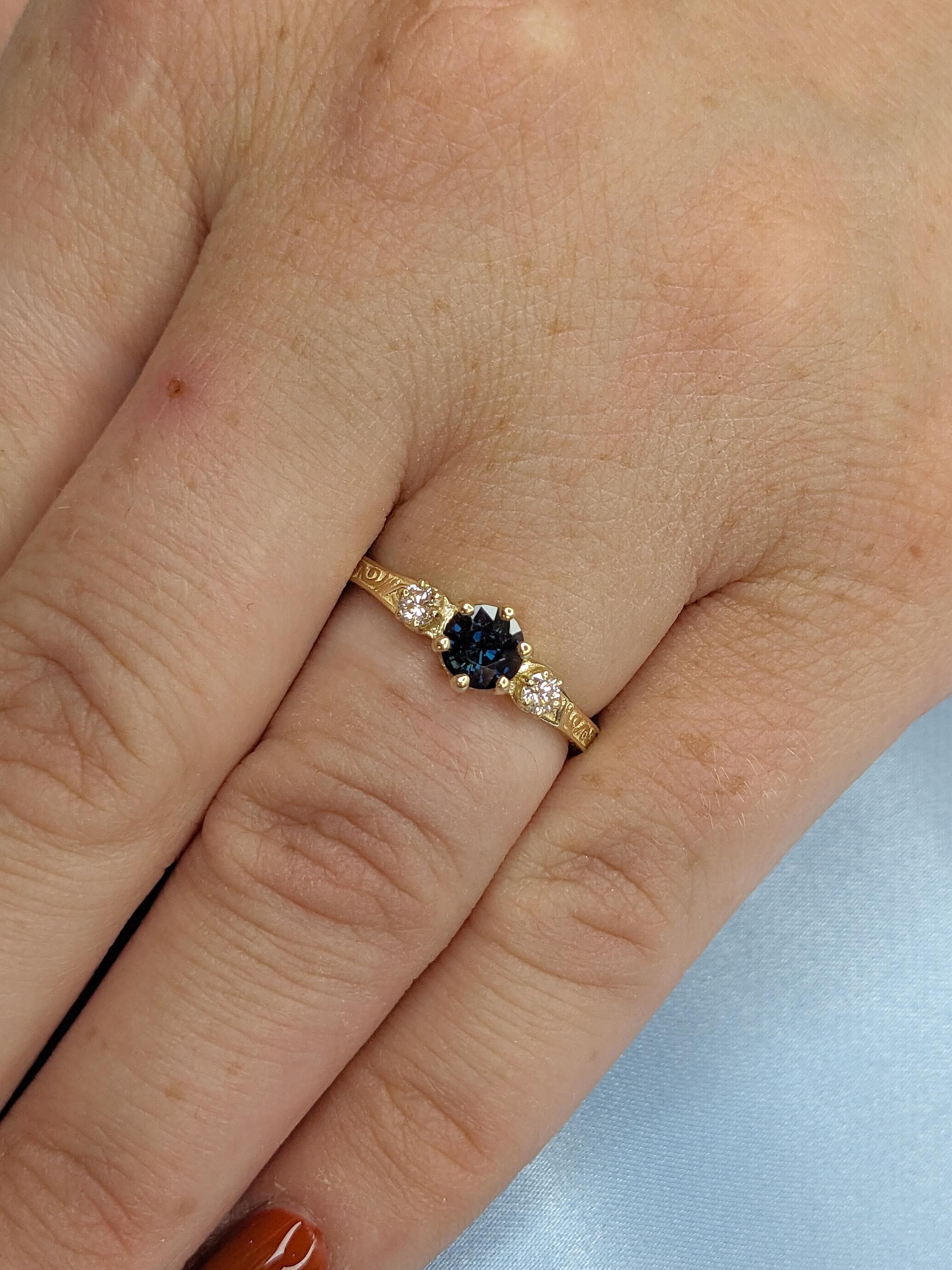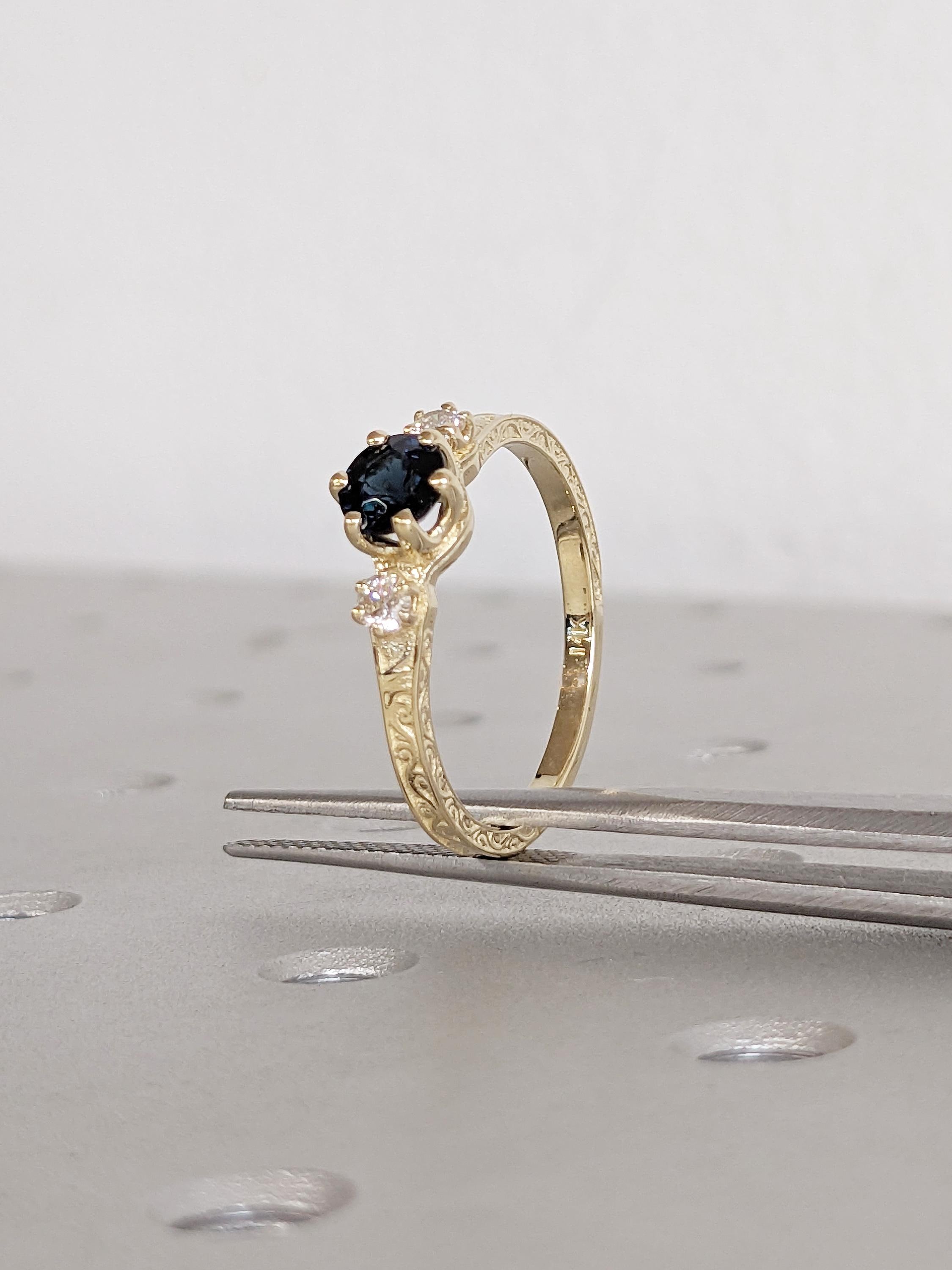 Discover timeless beauty in this antique-inspired three-stone engagement ring, featuring a mesmerizing round-cut Peacock Sapphire with a rich green-blue hue. Flanked by your choice of sparkling Natural Diamonds or brilliant Moissanites, this exquisite piece is finished with graceful wave-like filigree, adding a touch of distinctive elegance and vintage charm.
