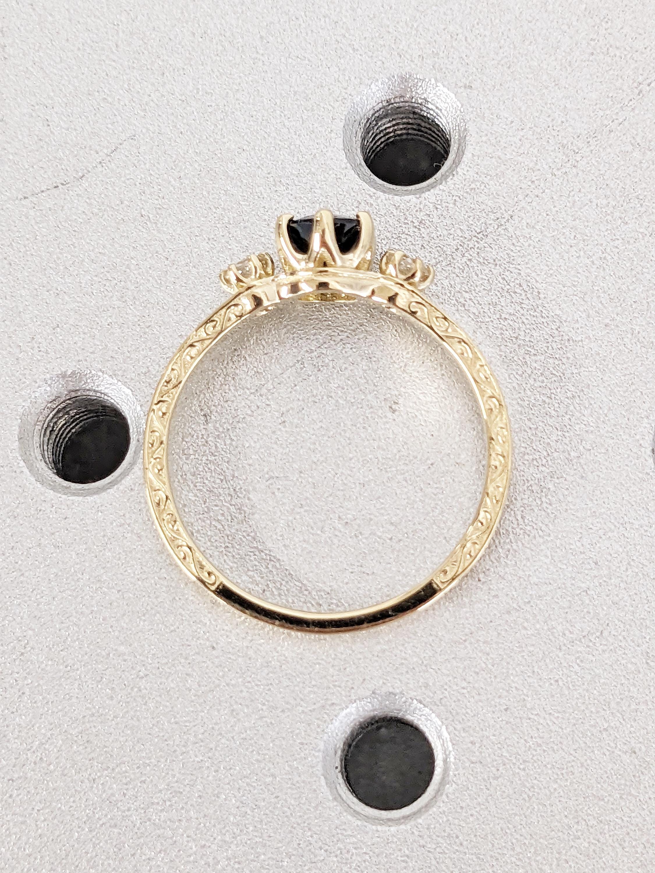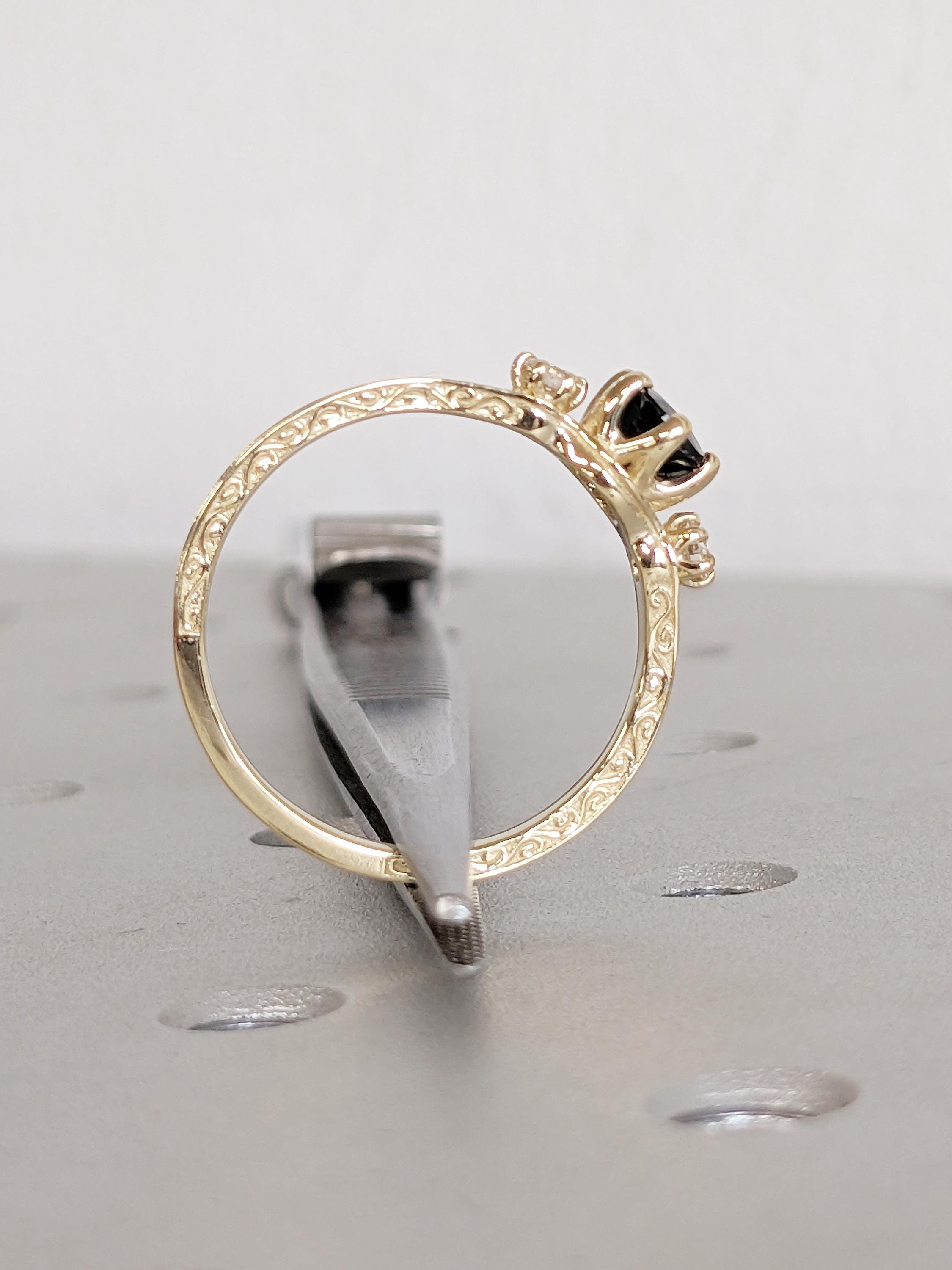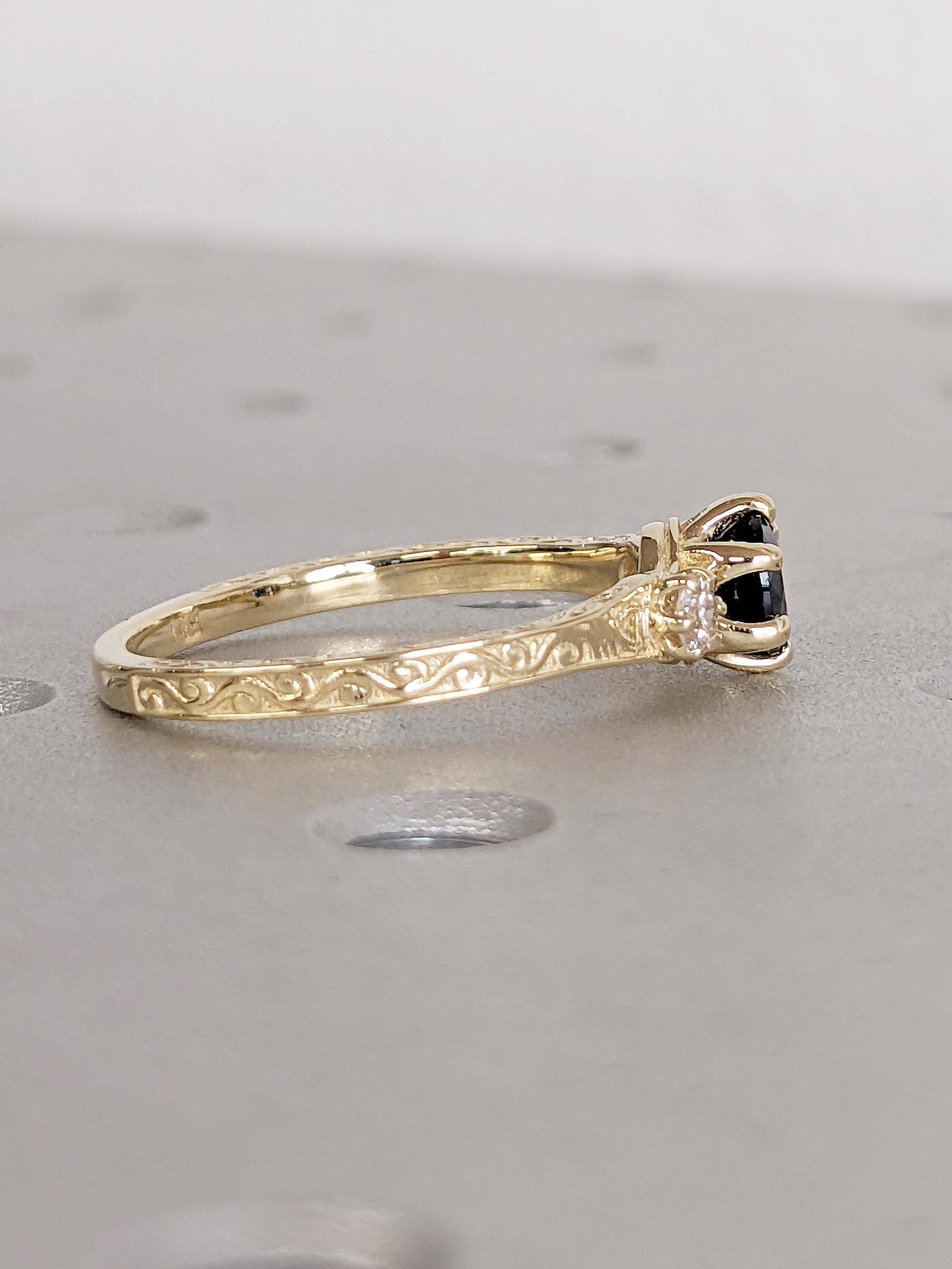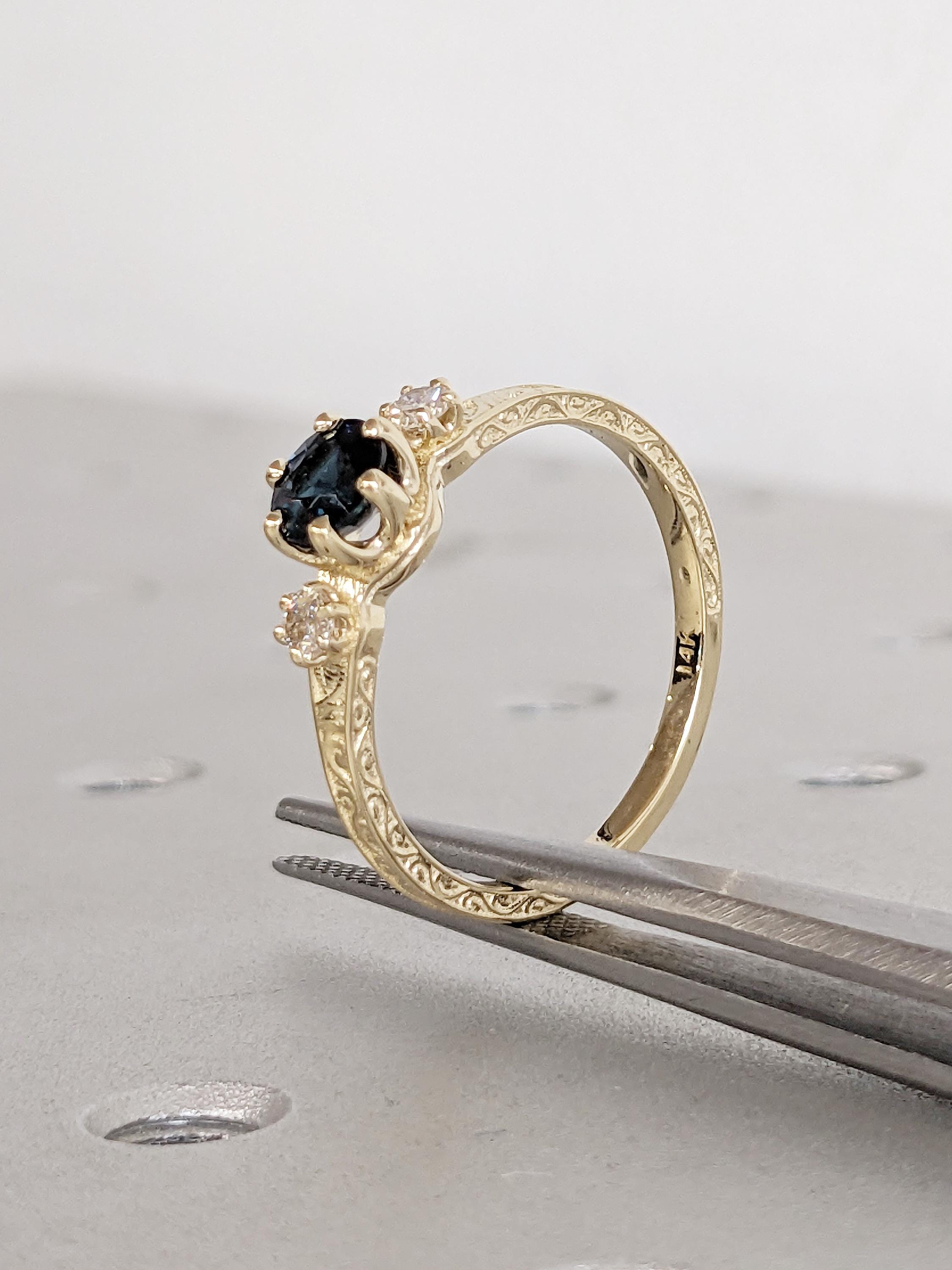 Discover timeless beauty in this antique-inspired three-stone engagement ring, featuring a mesmerizing round-cut Peacock Sapphire with a rich green-blue hue. Flanked by your choice of sparkling Natural Diamonds or brilliant Moissanites, this exquisite piece is finished with graceful wave-like filigree, adding a touch of distinctive elegance and vintage charm.