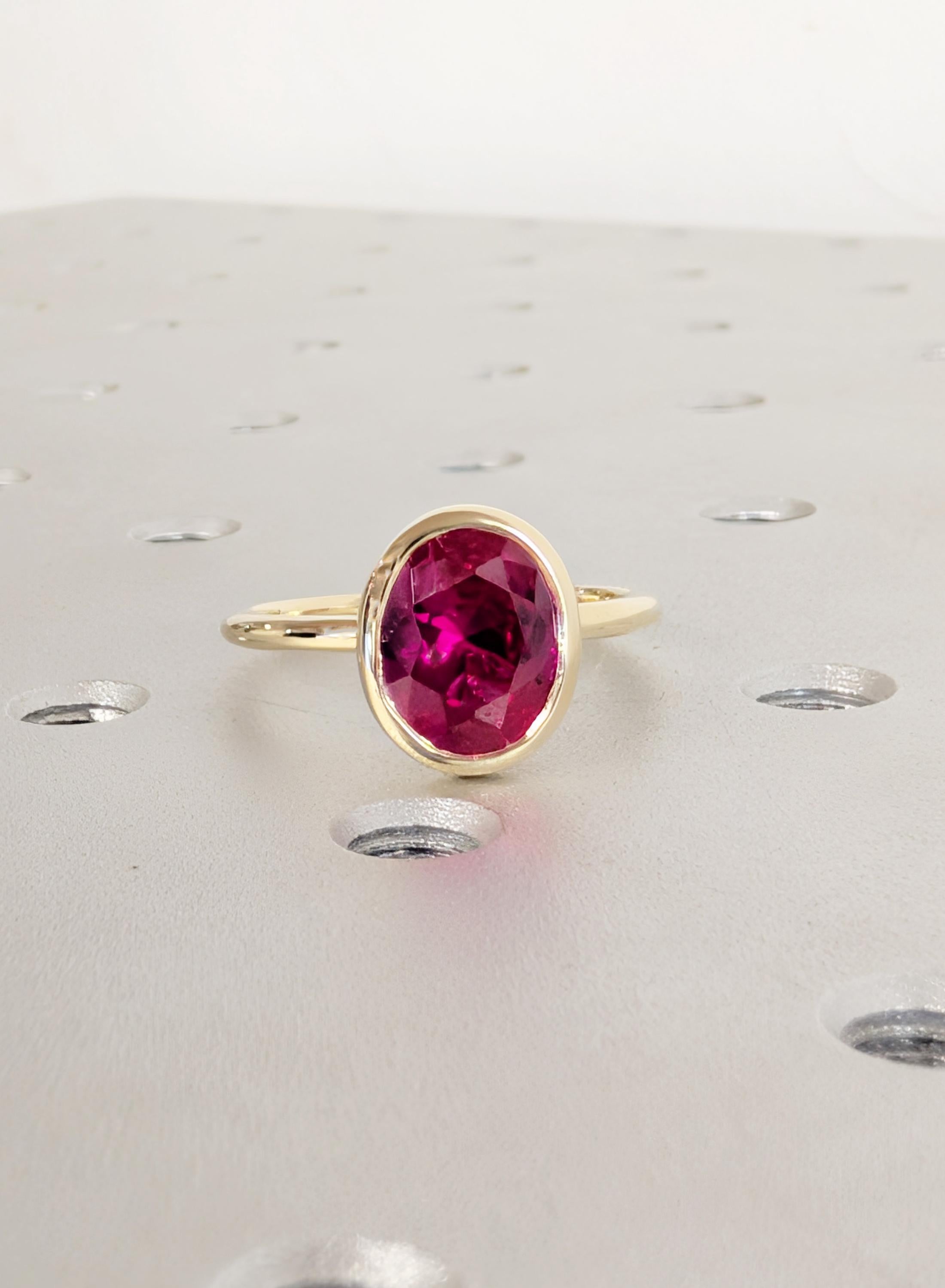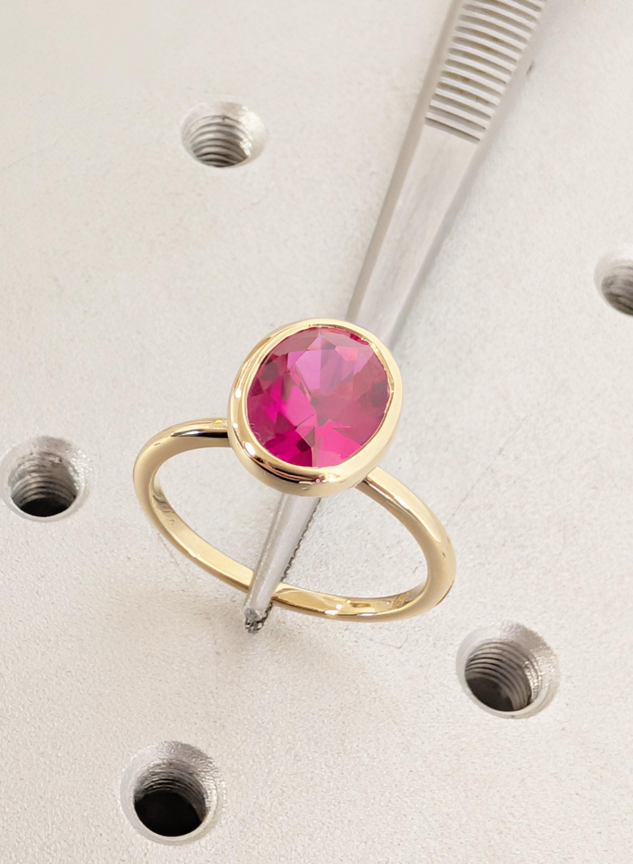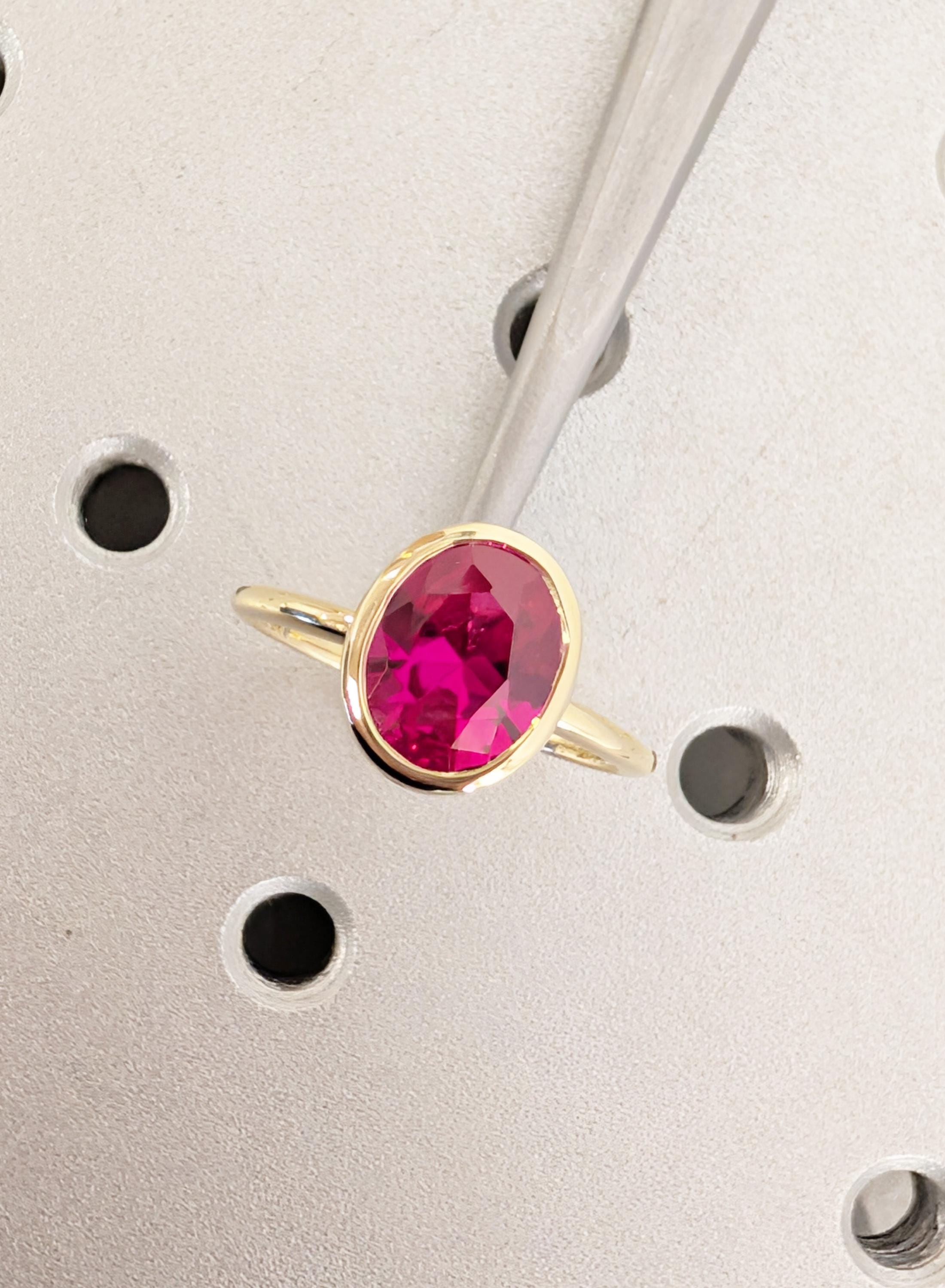 This elegant ring features a vivid Lab Ruby in an oval cut, gently framed by a smooth bezel setting that highlights its rich red color. The clean silhouette keeps the focus on the gemstone, while the rounded band sits comfortably on the finger. Simple yet expressive, this ring works beautifully for everyday wear, a meaningful gift, or a subtle statement piece with vintage character.