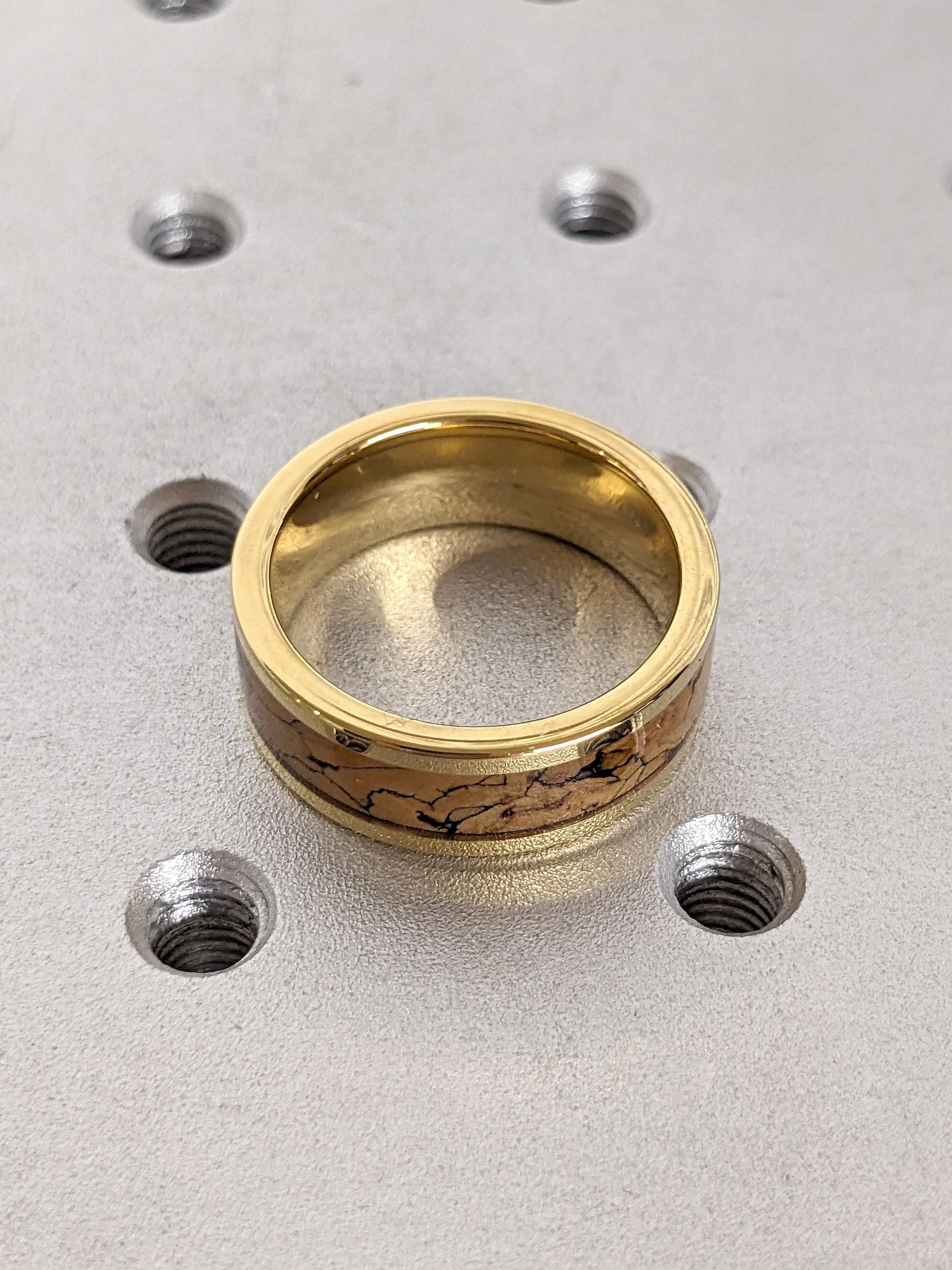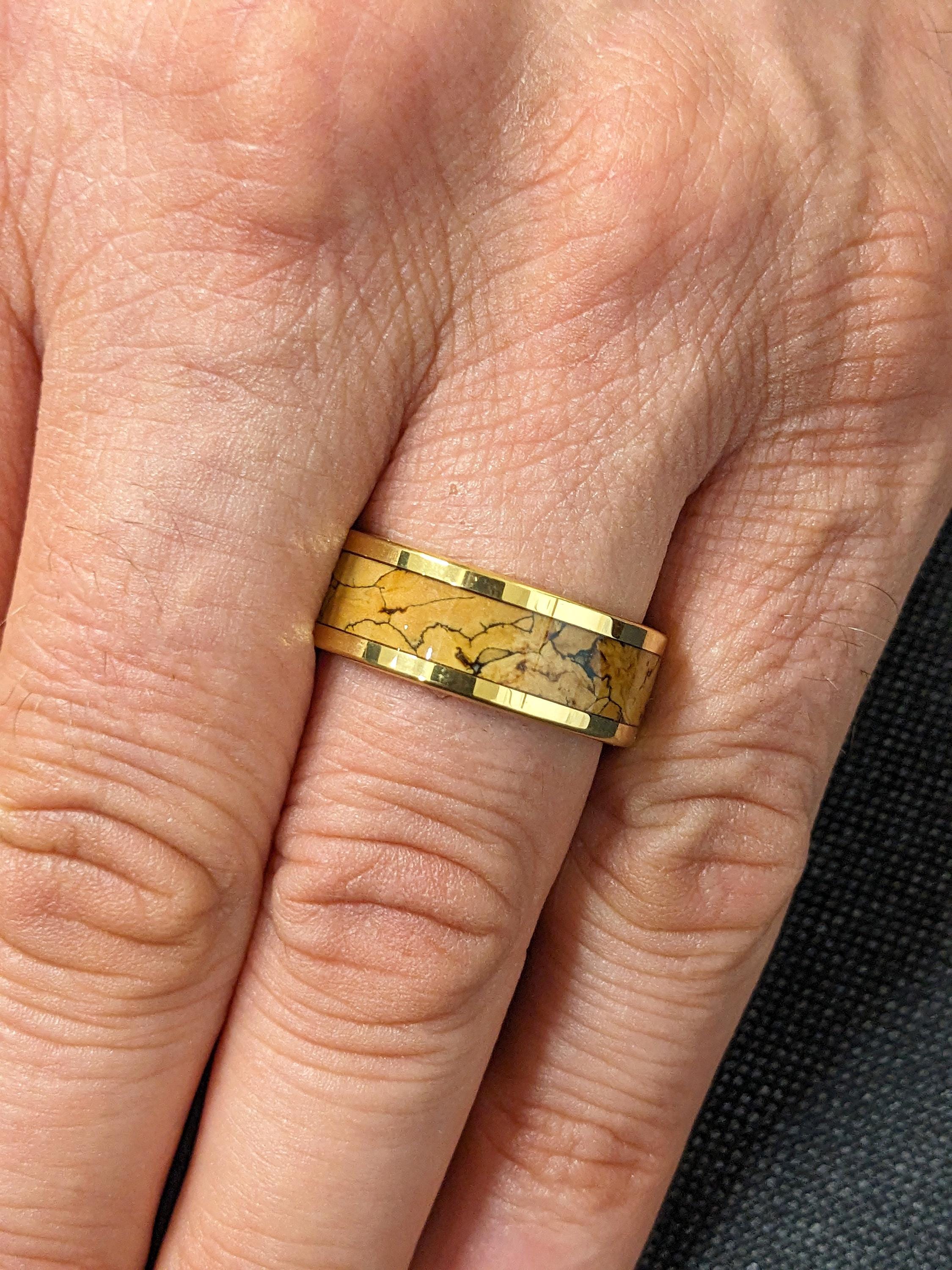 Bold and distinctive, this 8mm yellow gold plated tungsten ring stands out with its striking man-made dinosaur bone inlay pattern — a modern interpretation of prehistoric texture and timeless strength. The polished shiny finish adds a sleek, masculine edge, while the tungsten carbide construction ensures lasting durability and scratch resistance. Designed for comfort and individuality, this ring makes a powerful statement for the modern man who values both character and craftsmanship.