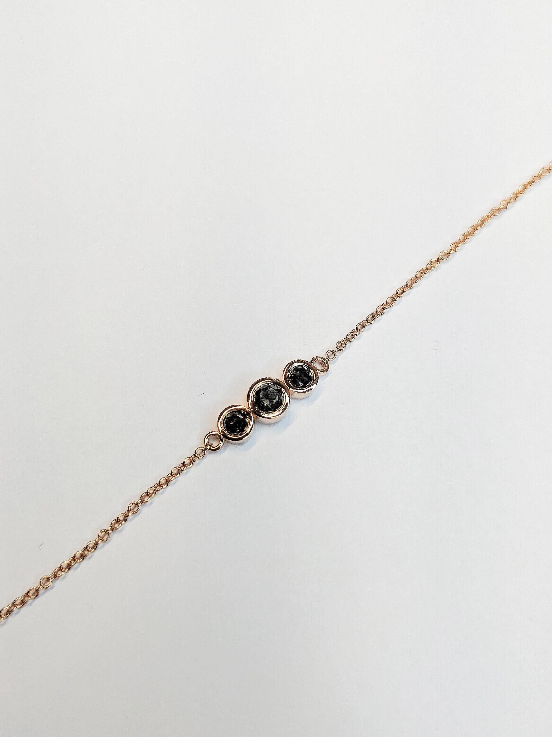 A versatile and effortlessly elegant chain bracelet featuring three sparkling Salt and Pepper Diamonds in sleek bezel settings. Delicate yet eye catching, it adds a touch of modern charm and unique character to any look.