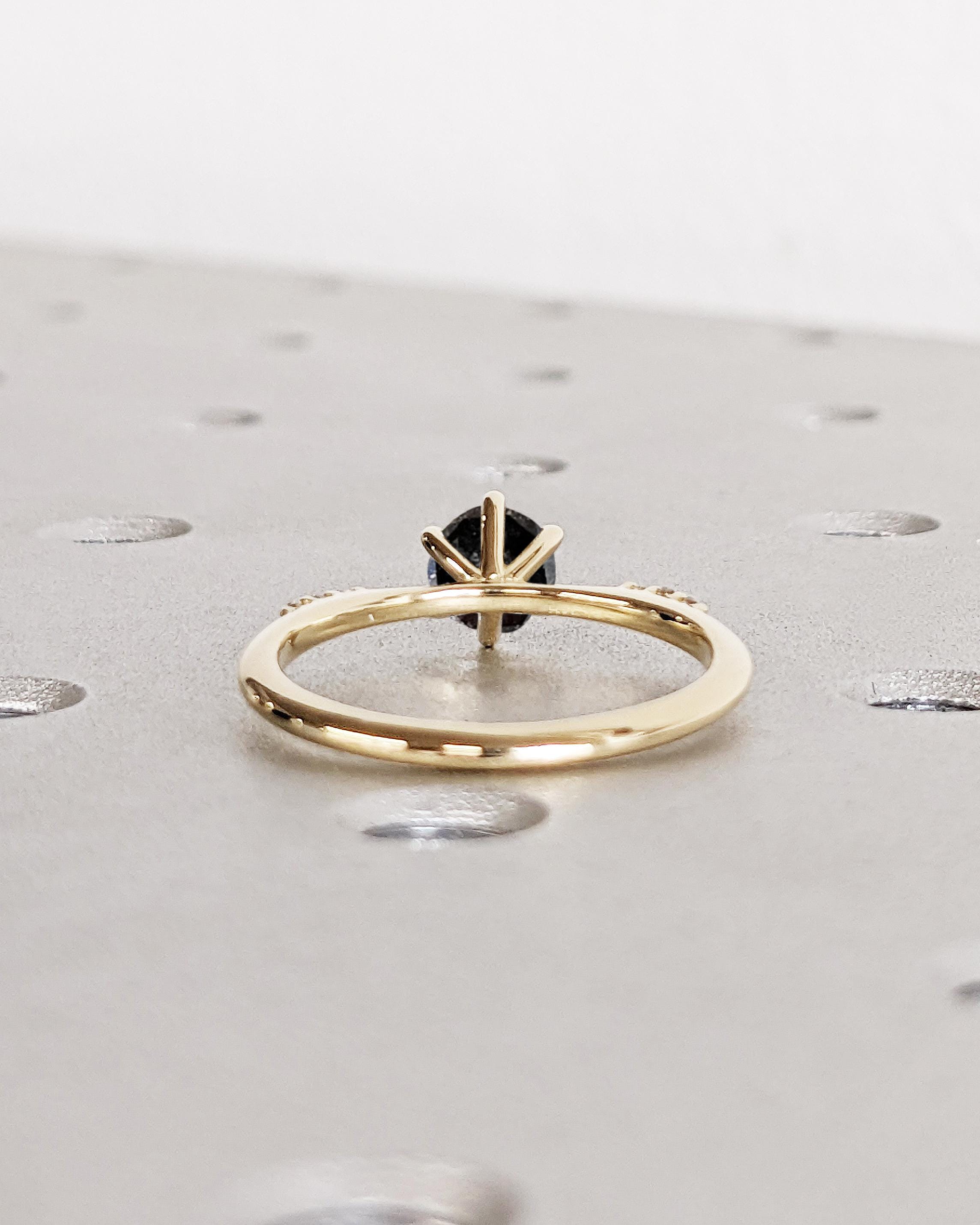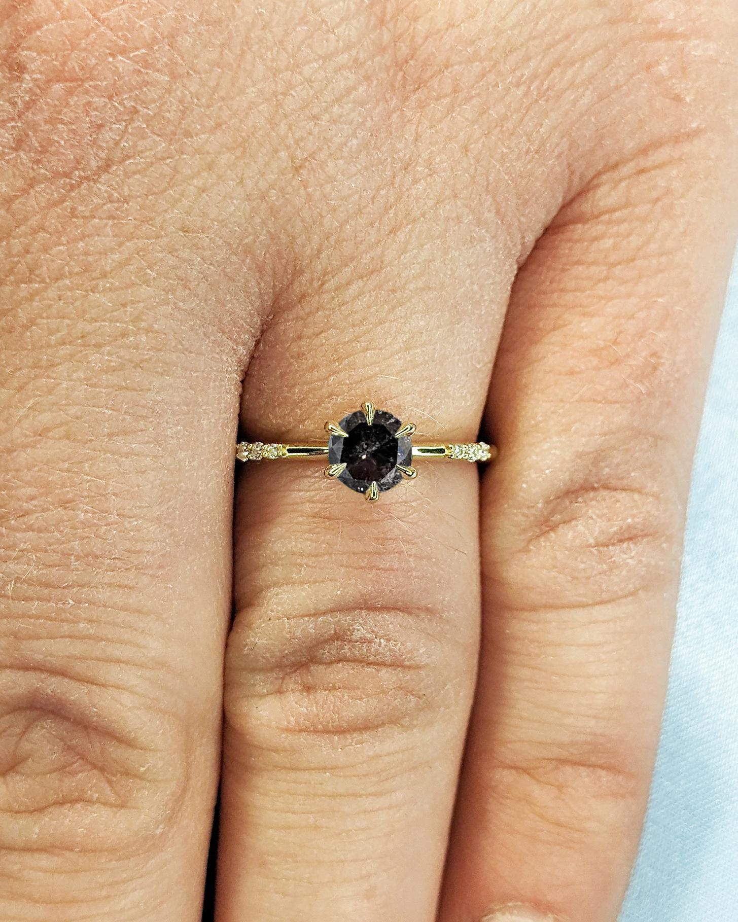 Minimalist yet full of character, this round cut salt and pepper diamond engagement ring is both simple and intricate. The dainty 1.7mm band allows the stones to shine while providing a comfortable, lightweight fit. Choose from natural diamonds, lab diamonds, or moissanites to personalize your side stones.