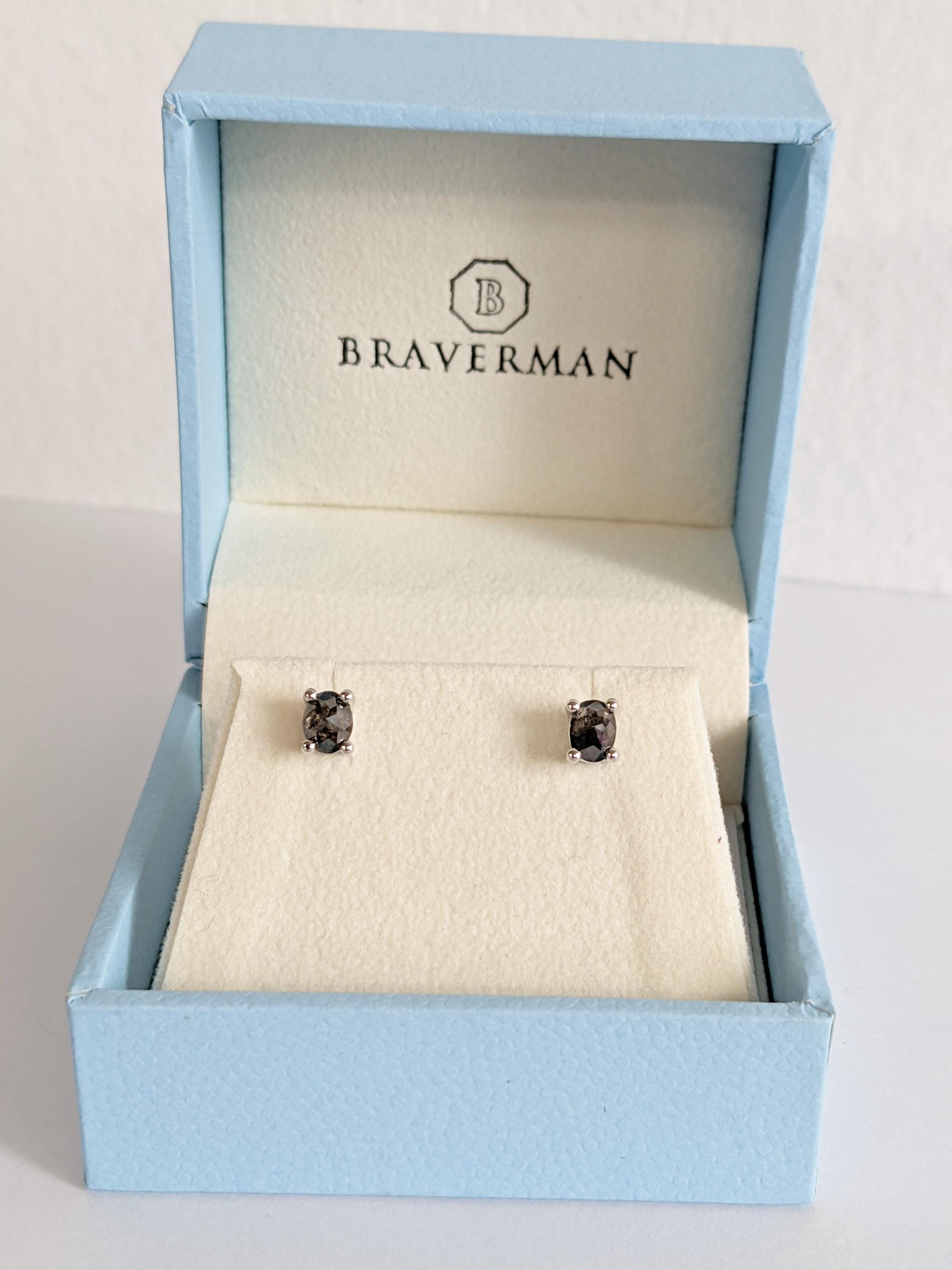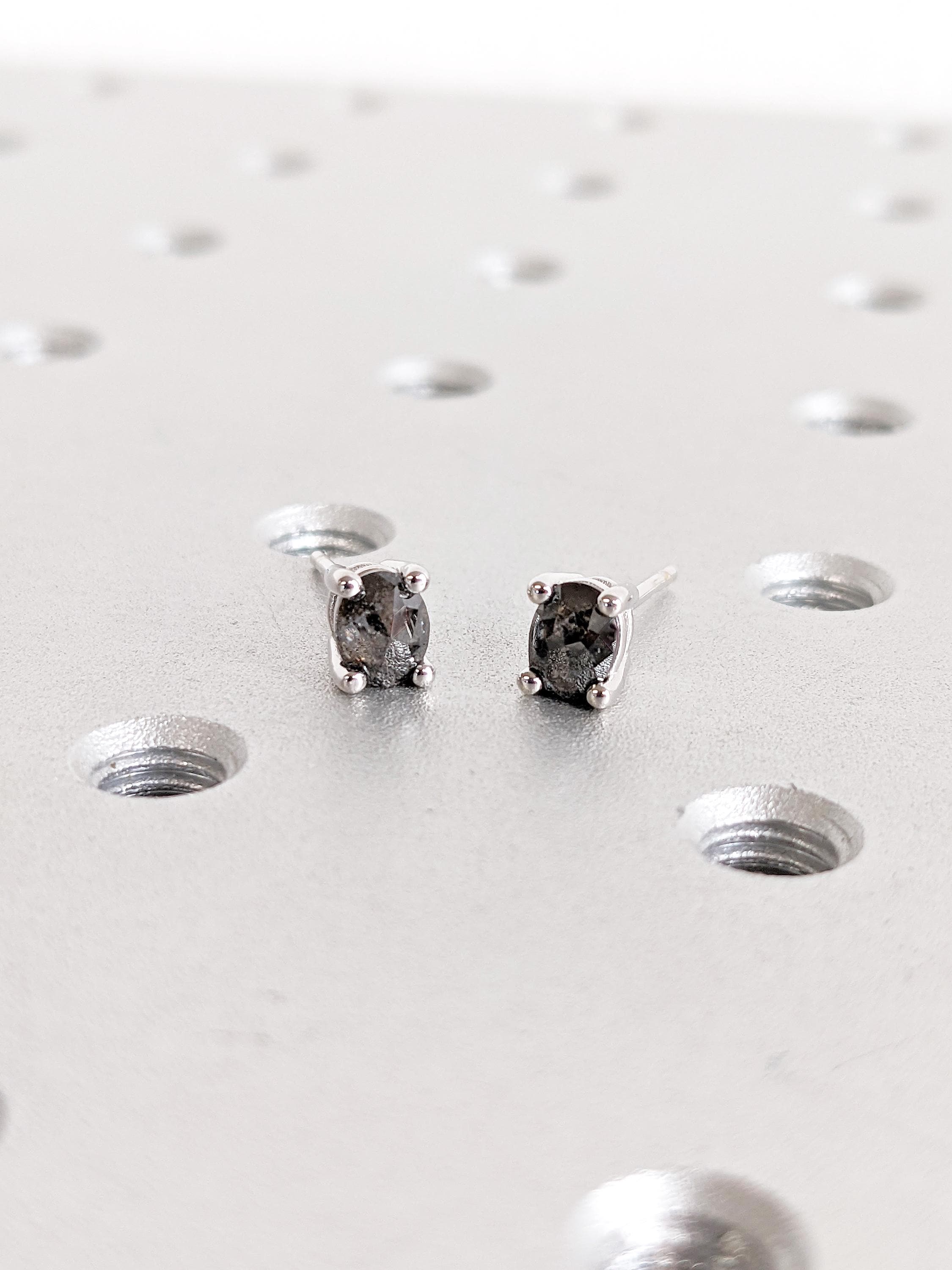 These Salt and Pepper Diamond earrings feature oval cut stones in a secure prong setting, showcasing the natural inclusions and unique speckled patterns that make each pair one of a kind. Their minimalist stud design offers both elegance and versatility, making them suitable for daily wear as well as special occasions. Perfect for women who appreciate distinctive jewelry, these earrings combine subtle sparkle with timeless charm, effortlessly complementing casual looks or formal attire