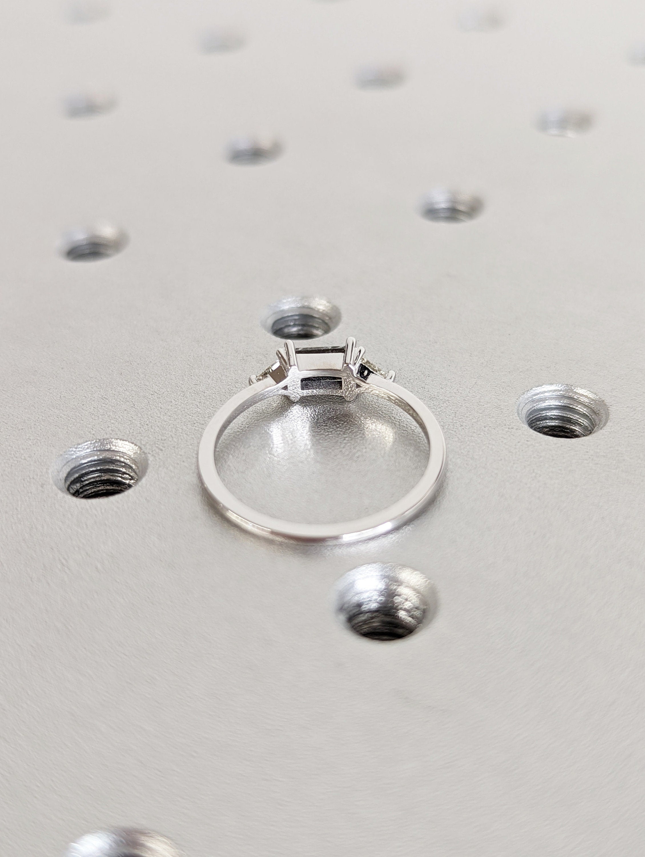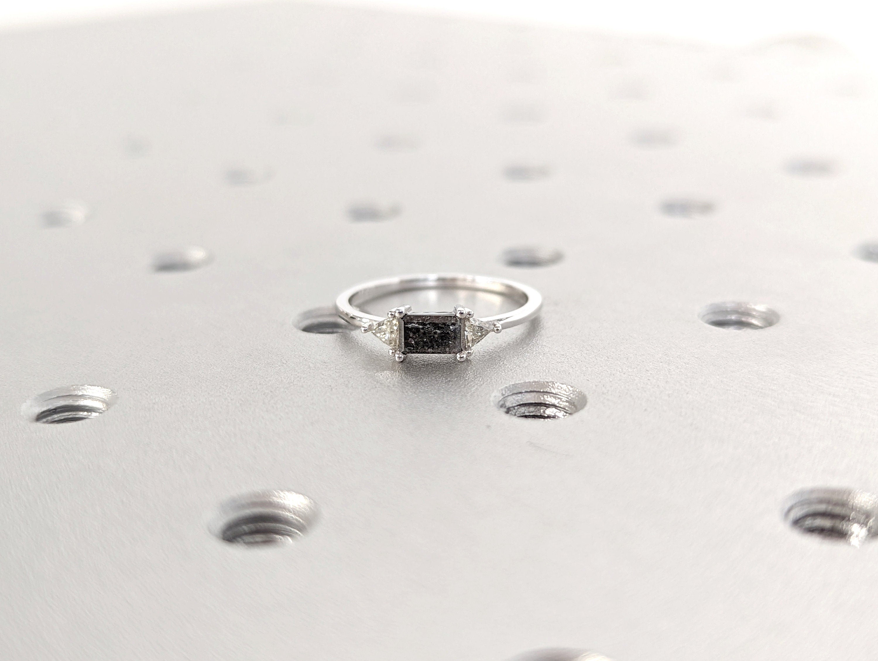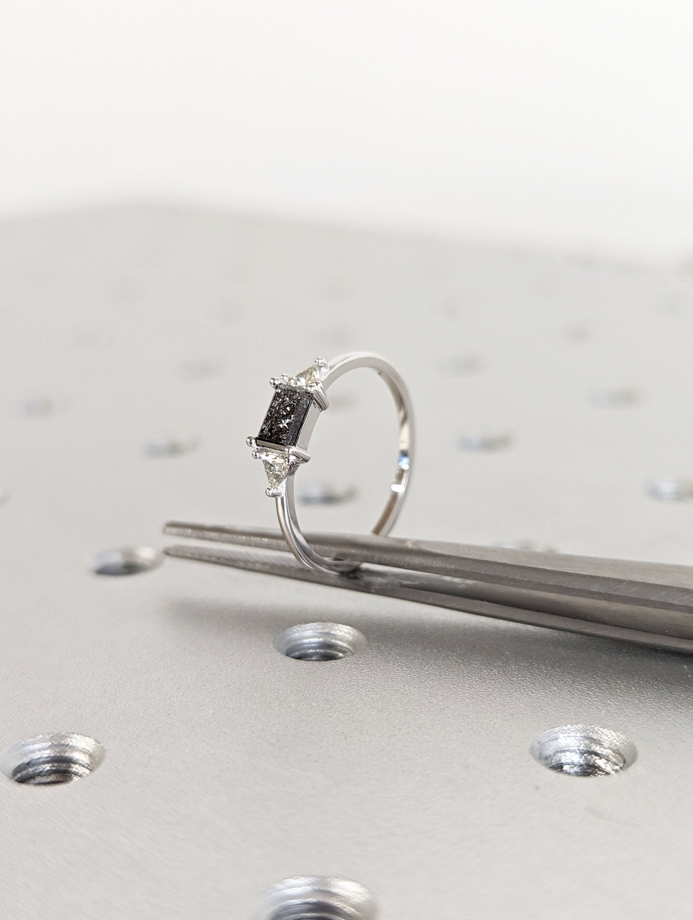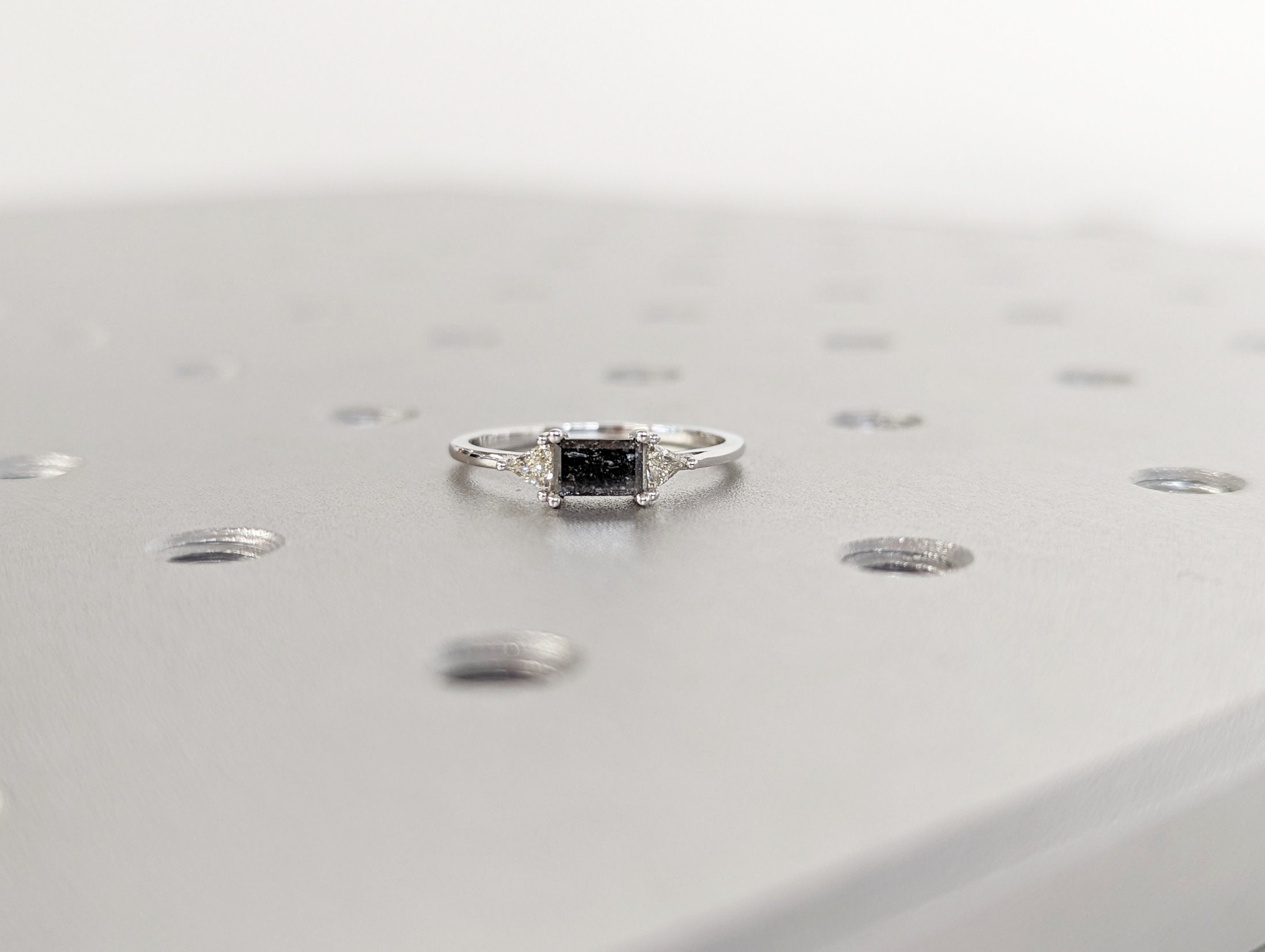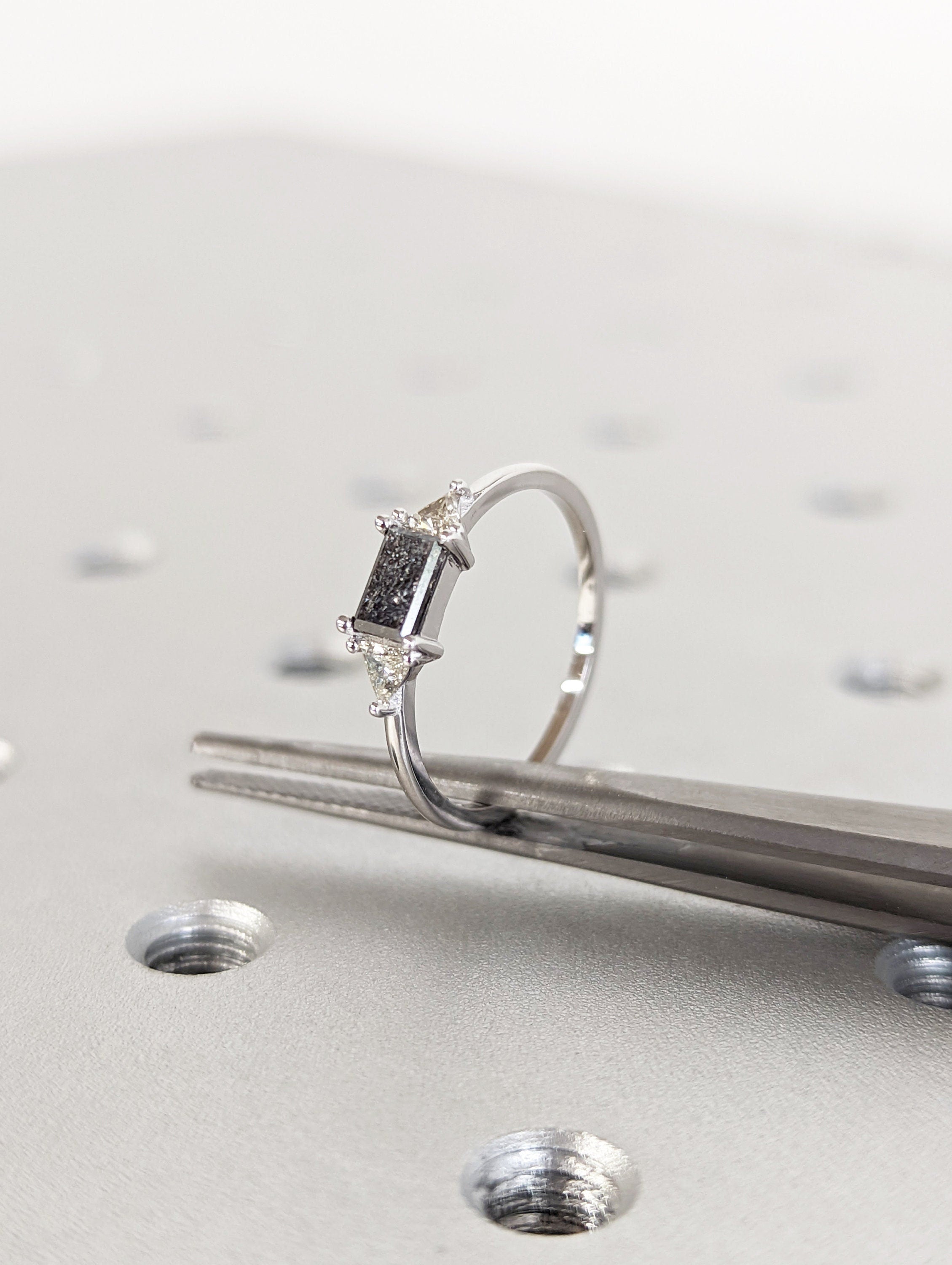 A stunningly beautiful vintage inspired design, petite band with a baguette or emerald cut Salt & Pepper diamond, adorned by 2 beautiful diamonds to contrast the center diamond.