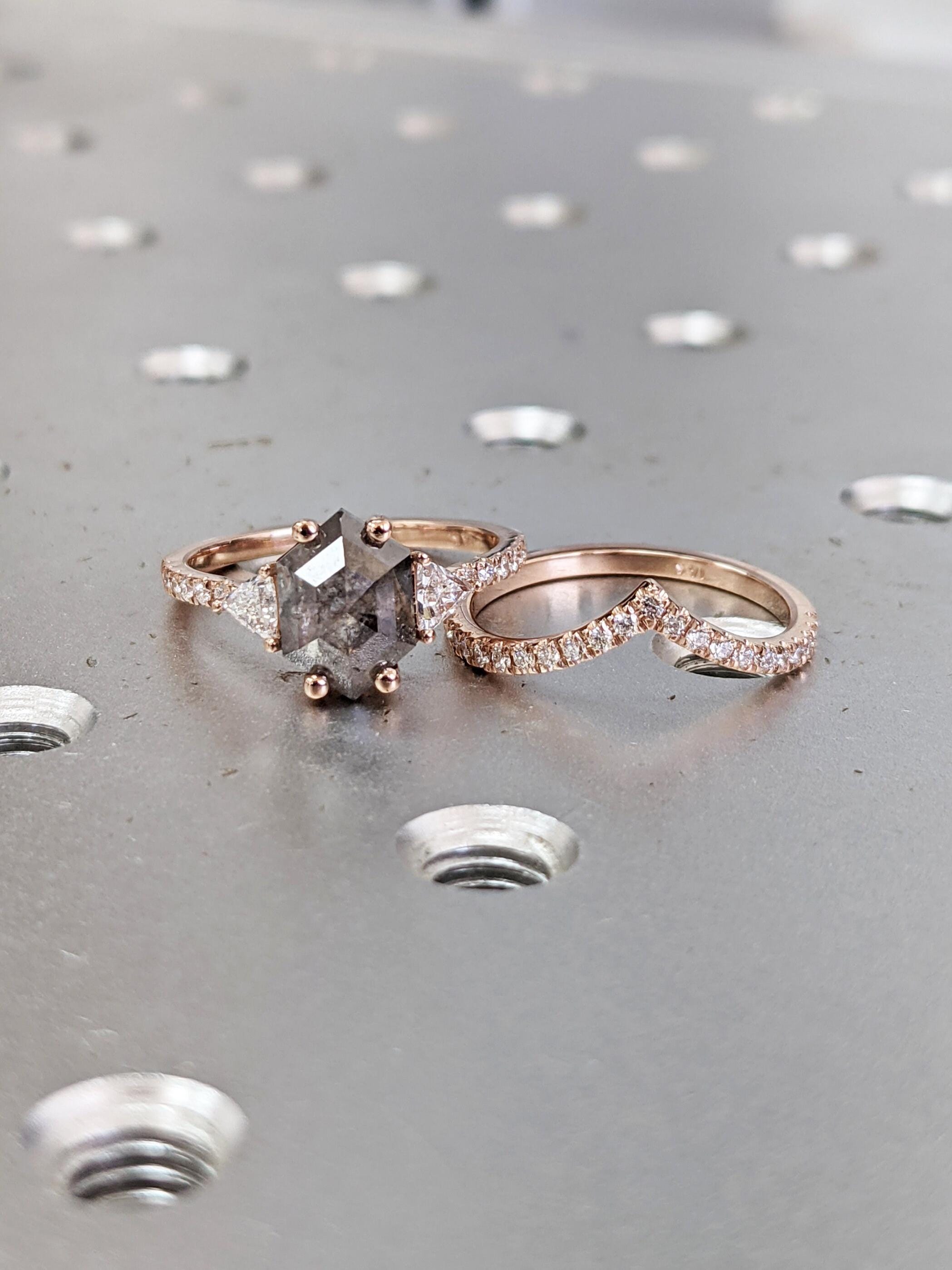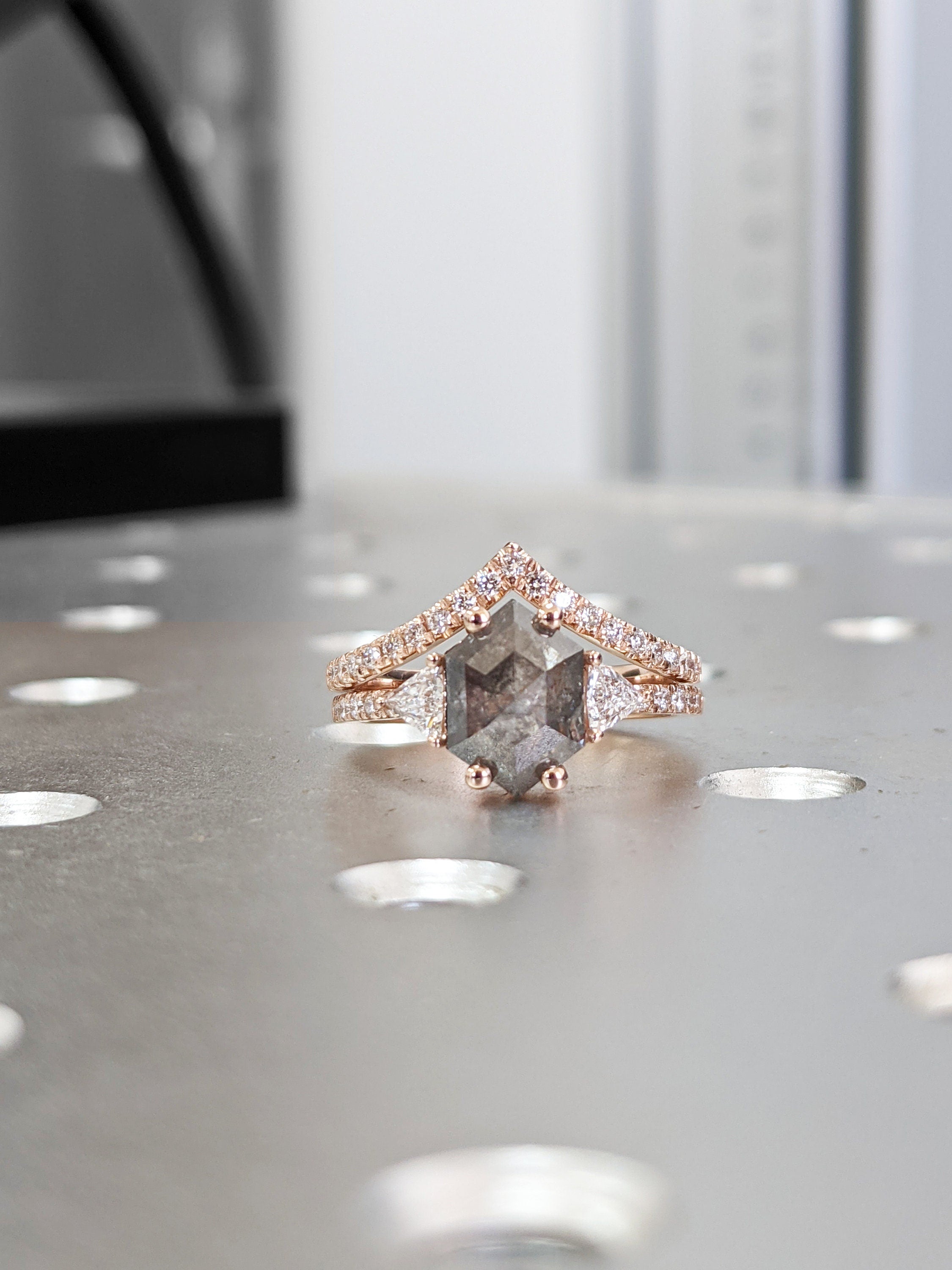 Salt and Pepper Diamond Engagement and Wedding Ring Set | 14k Rose Gold Chevron Matching Stacking Ring | Diamond Bridal Jewelry For Women