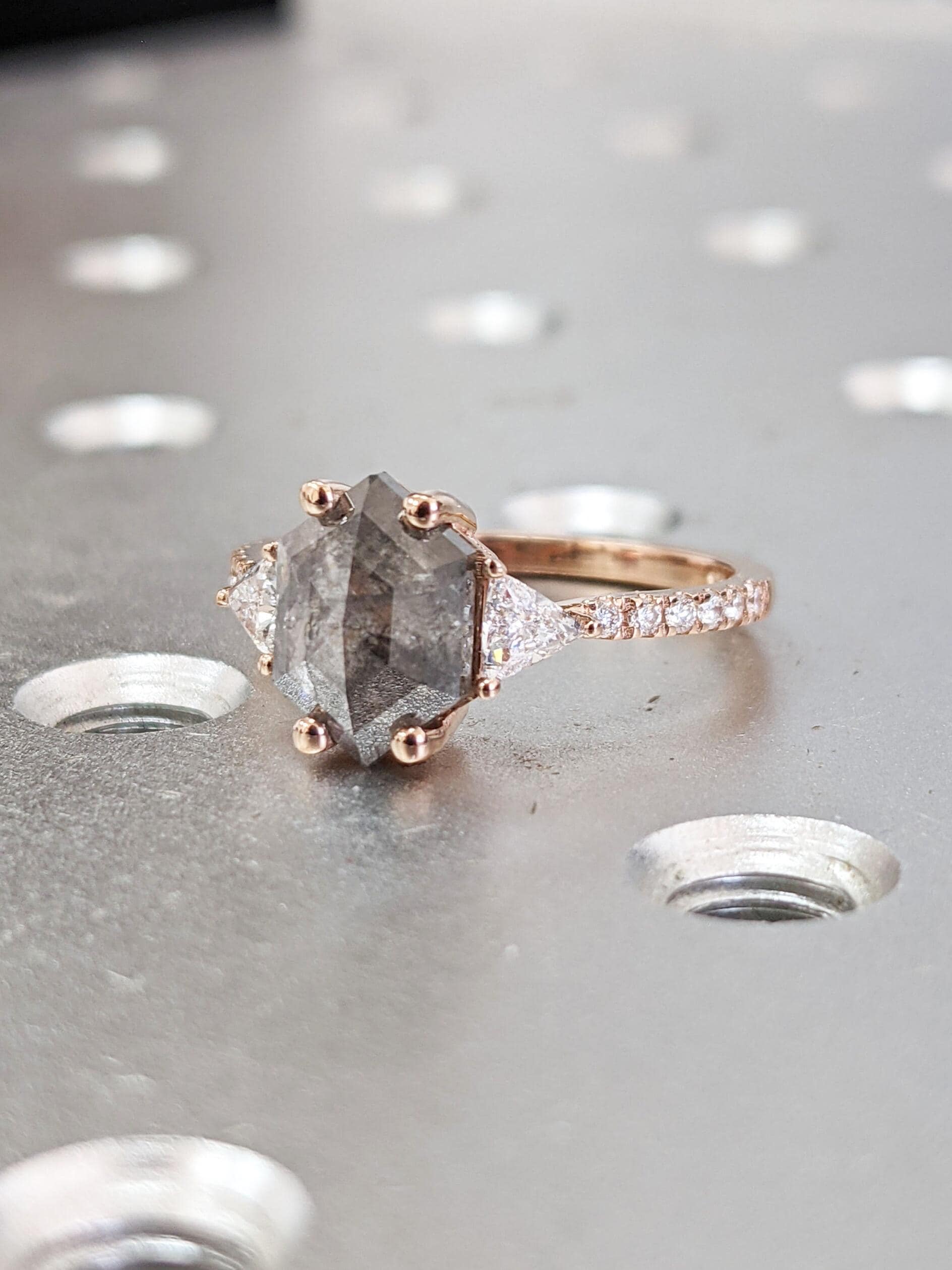 A handcrafted geometrical beauty, this dainty ring features a beautiful hexagon shape Salt and Pepper Diamond, embrace by a trillion enhanced natural diamond on both sides.