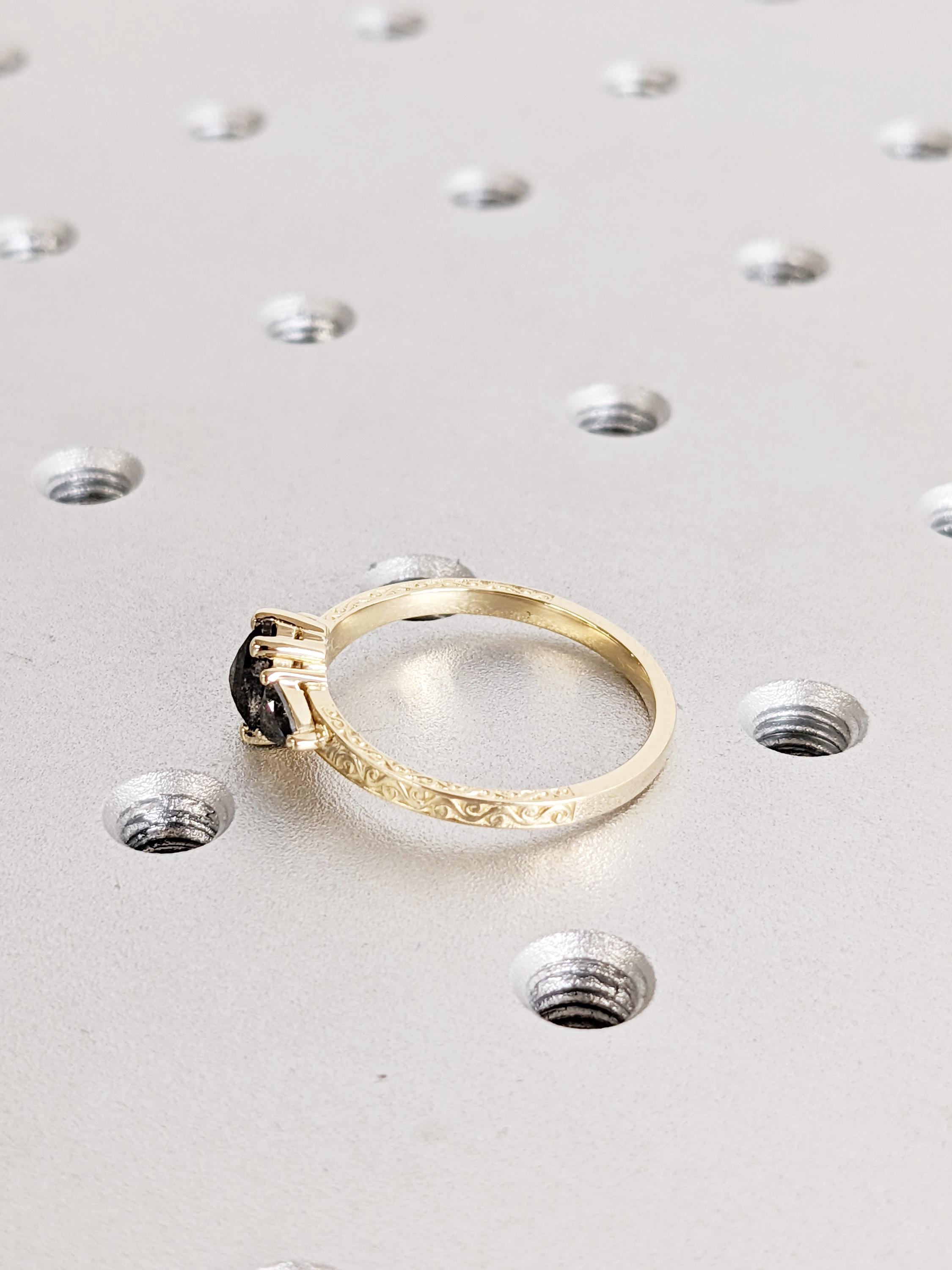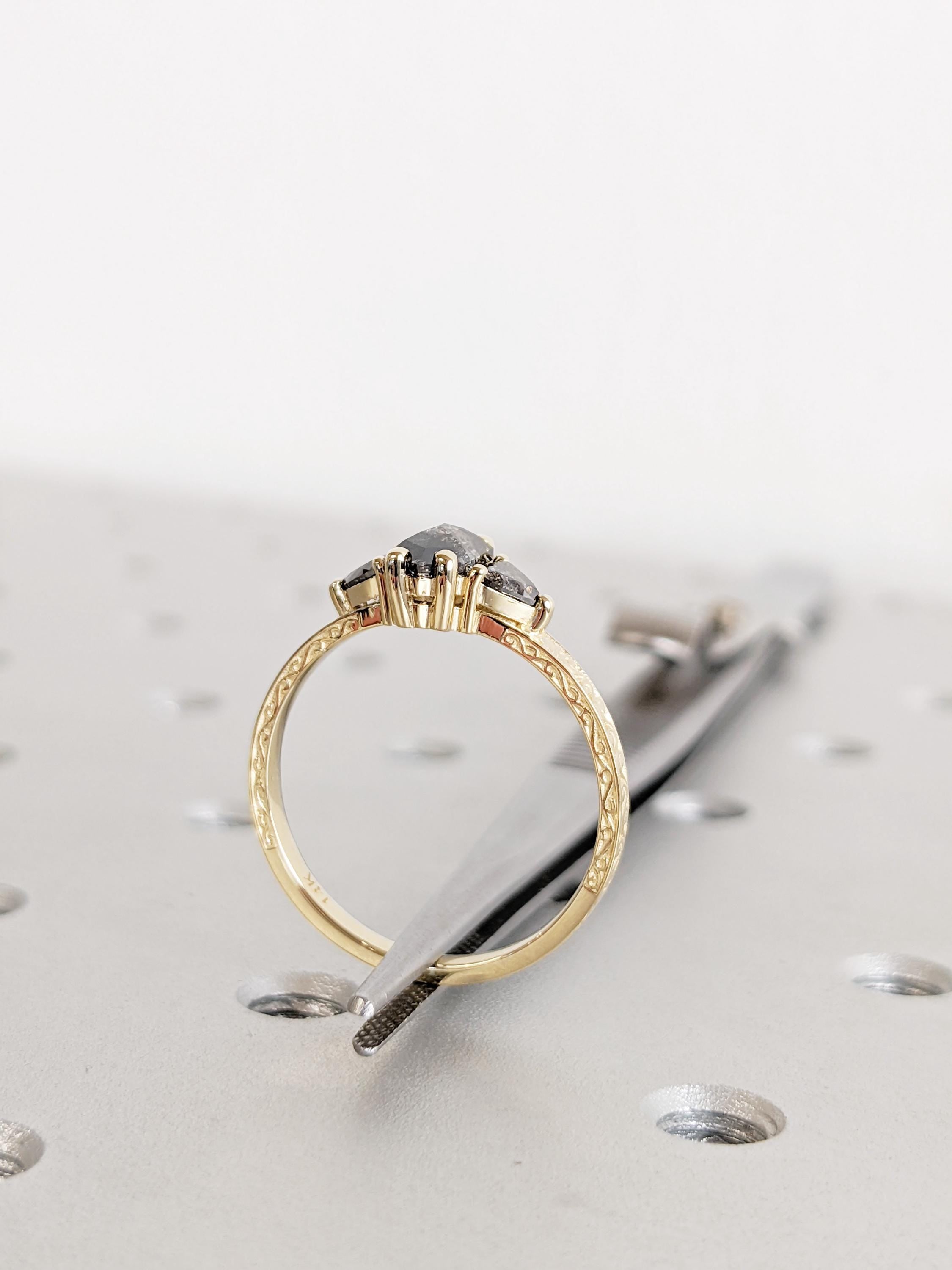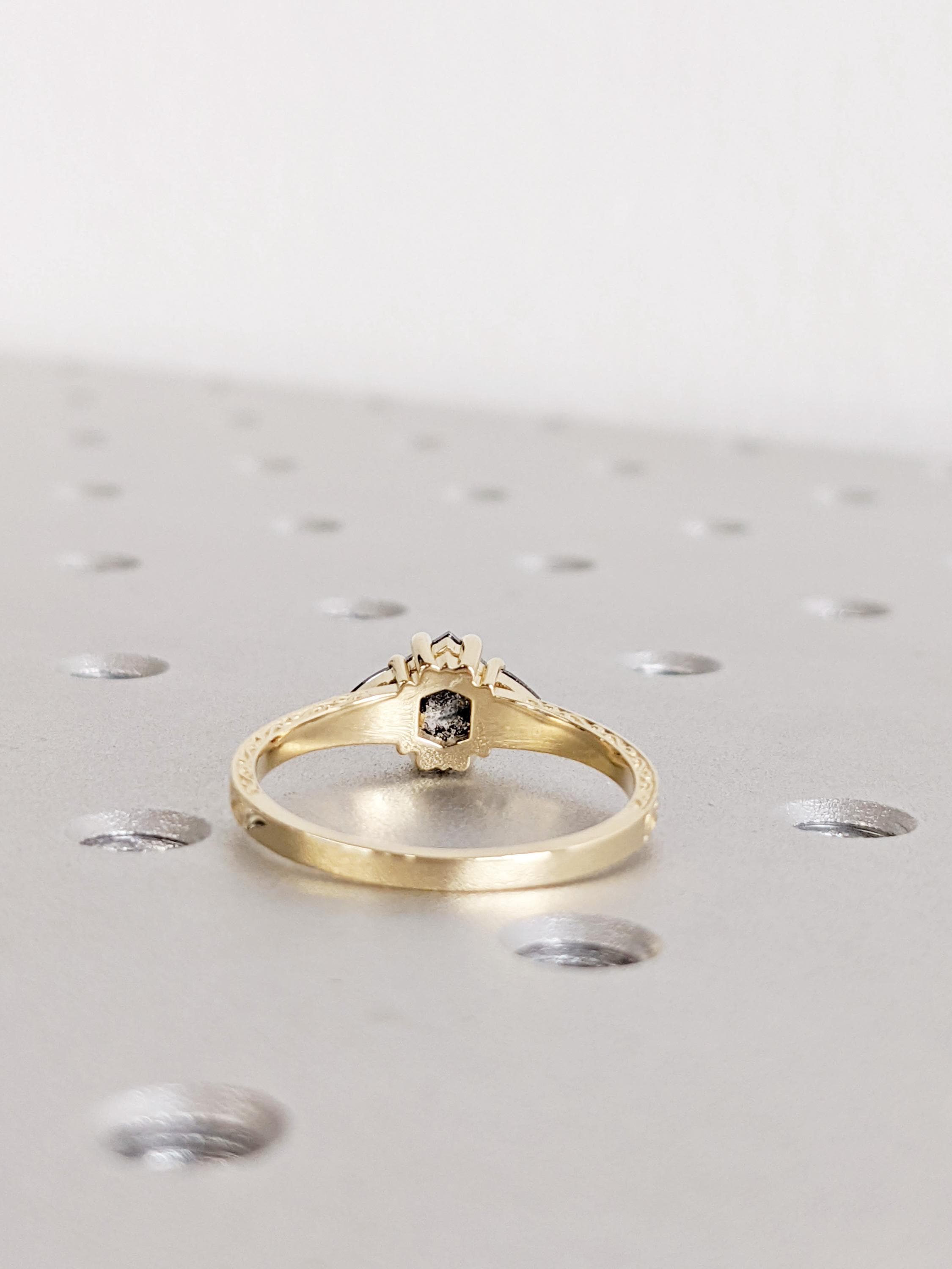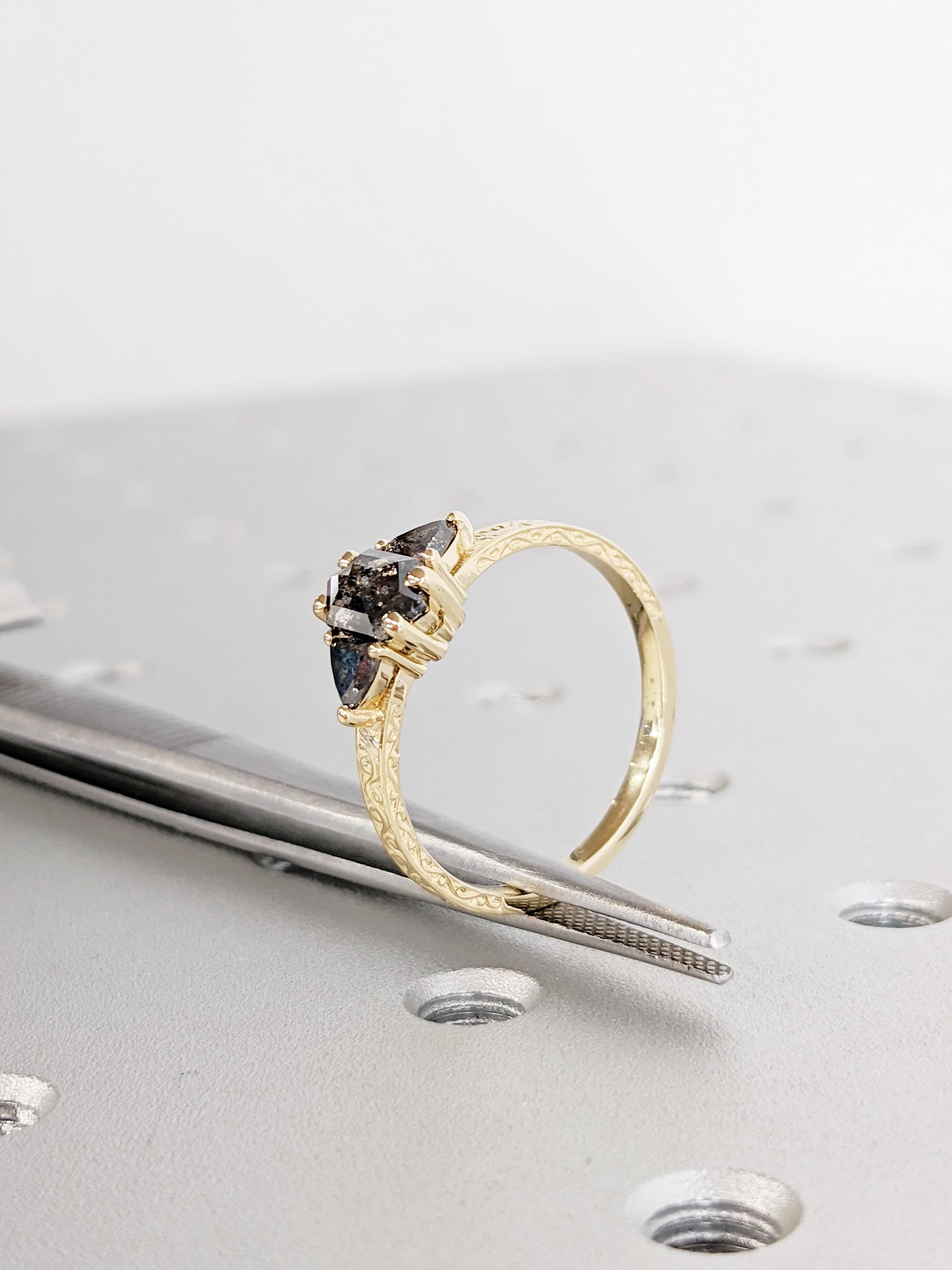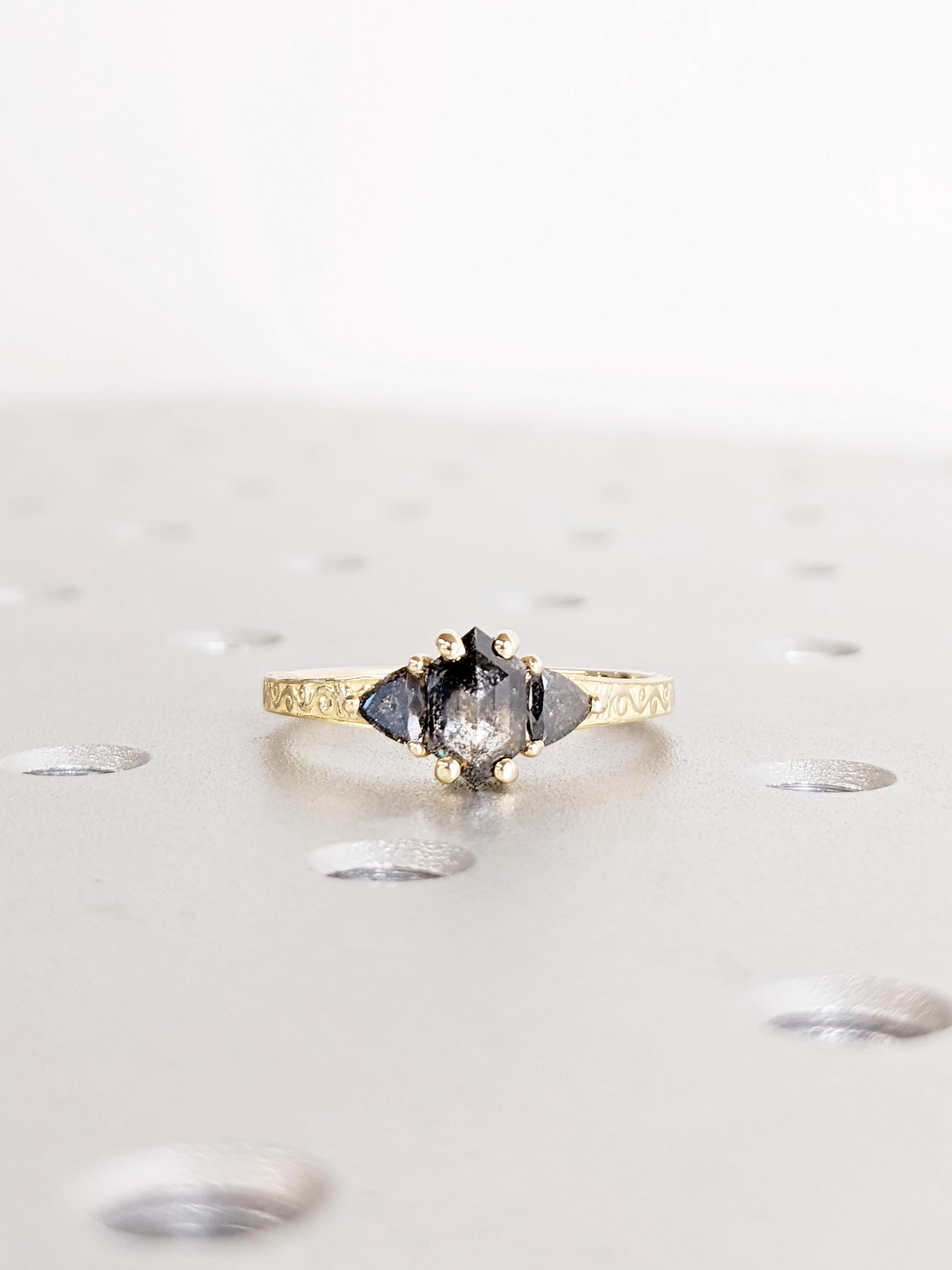 Salt And Pepper Diamond Engagement Ring, 14K Yellow Solid Gold Ring, Hexagon Trillion Cut Salt and Pepper Diamond Ring, Promise Ring Gift